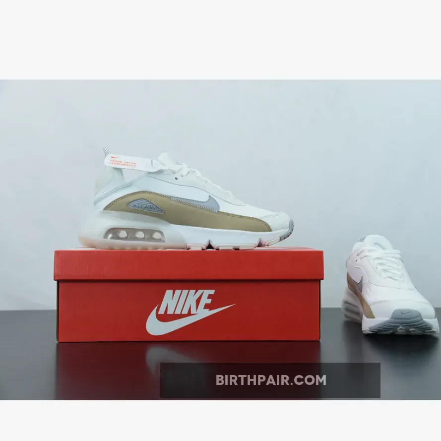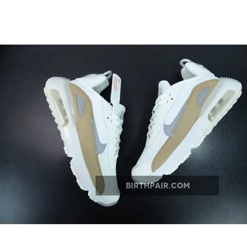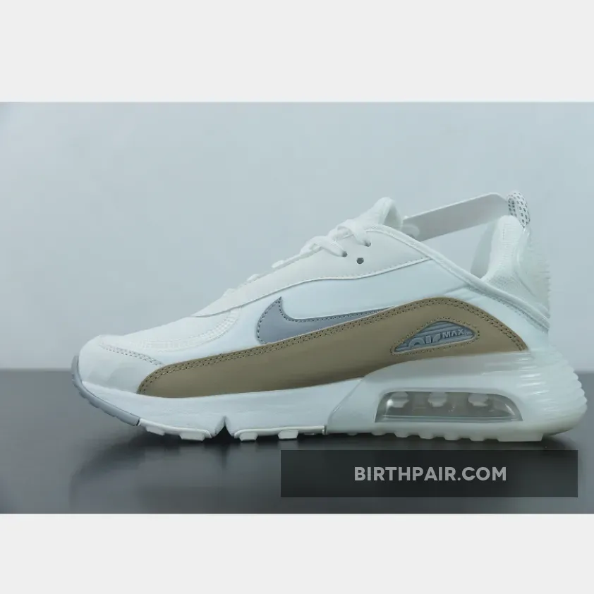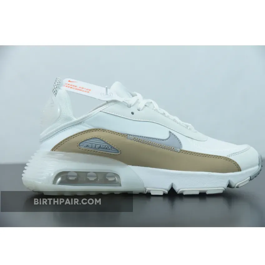 this Nike Air Max 2090 features a mixture of mesh and leather throughout while White appears on the base. Next, we have Grey o the Swoosh logos and Tan on the mudguard.