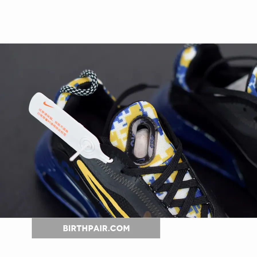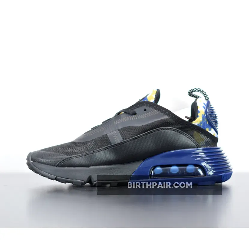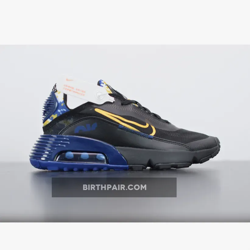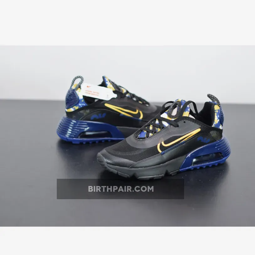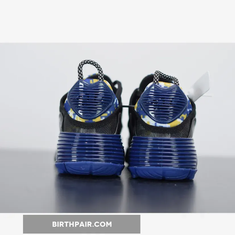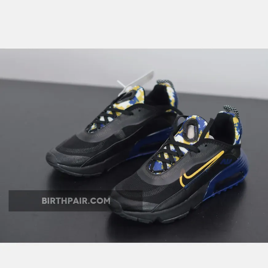 This offering of the Nike Air Max 2090 features a transparent upper with Navy leather mudguards, Yellow outlined Swooshes on the sides highlighted with Yellow camouflage print on the tongues and heels.