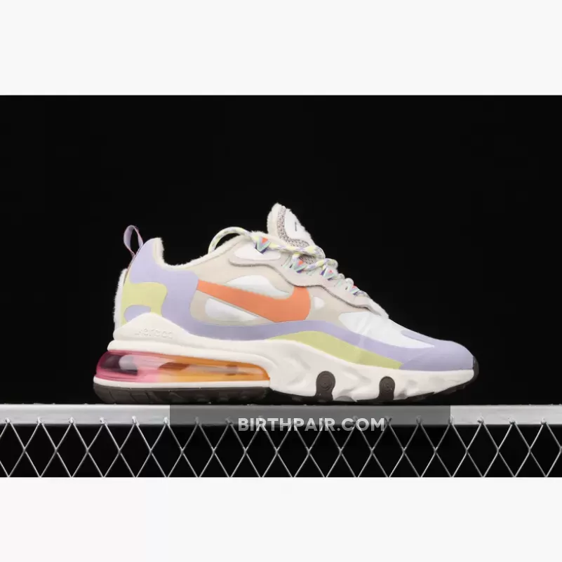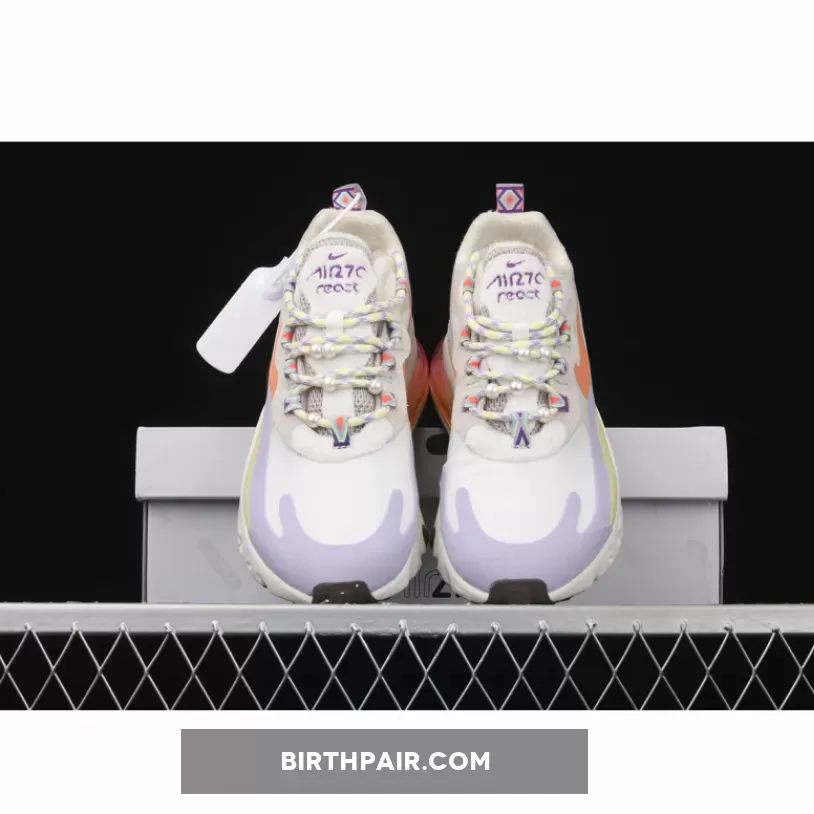 This offering of the Nike Air Max 270 React features a mix of White and Beige covering the upper detailed with pastel Orange, Purple, and Yellow tones. Suede eyelet overlays, pearls spotted throughout the laces, fleece lining to keep warm during the colder months highlighted with a native patterns on the lace loops, heel tab, and insoles.