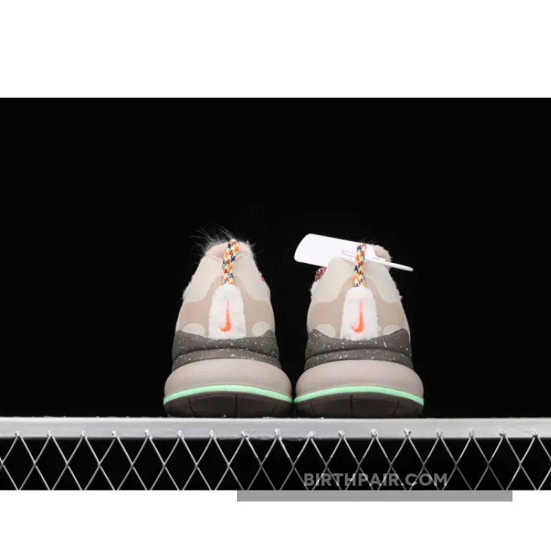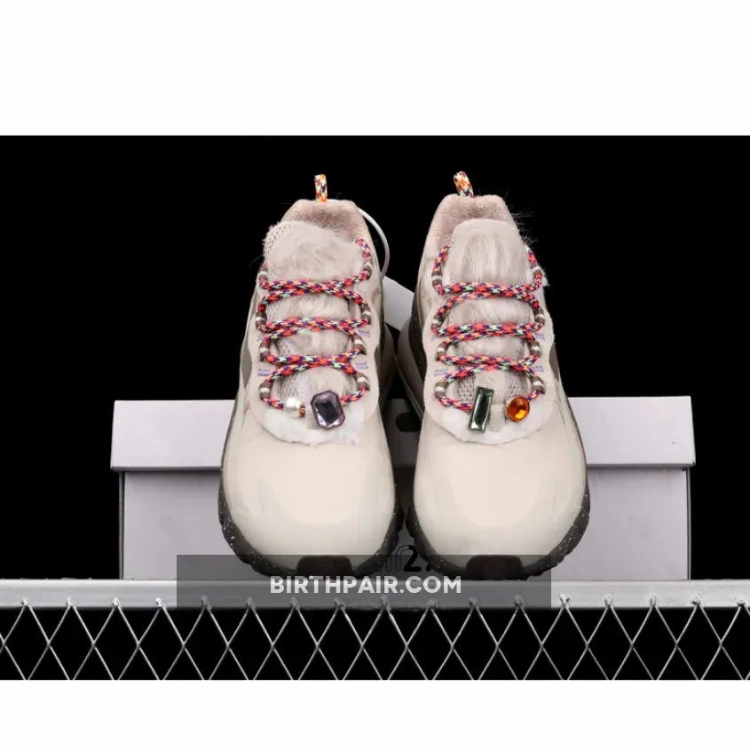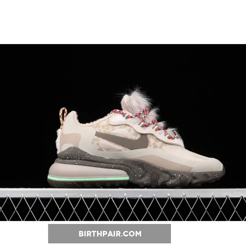 The most outstanding of the offering’s features would undoubtedly be the attached fur that outfits a large section of the instep. Its hairs are wrapped over top by colorful rope laces whose topmost loop is accessorized with a green carabiner and a complementing paracord keychain. What’s more, the vamp brings along the brand’s penchant for jewelry as gems of emerald, orange, and purple shades are used as if dubraes. A light tan then lies underneath in two fashions: one a more flat, unblemished finish and the other an eccentric mosaic of animal print. Speckled soles then draw just below, volt accents the model’s matted Air unit, and terry cloth warms from within.