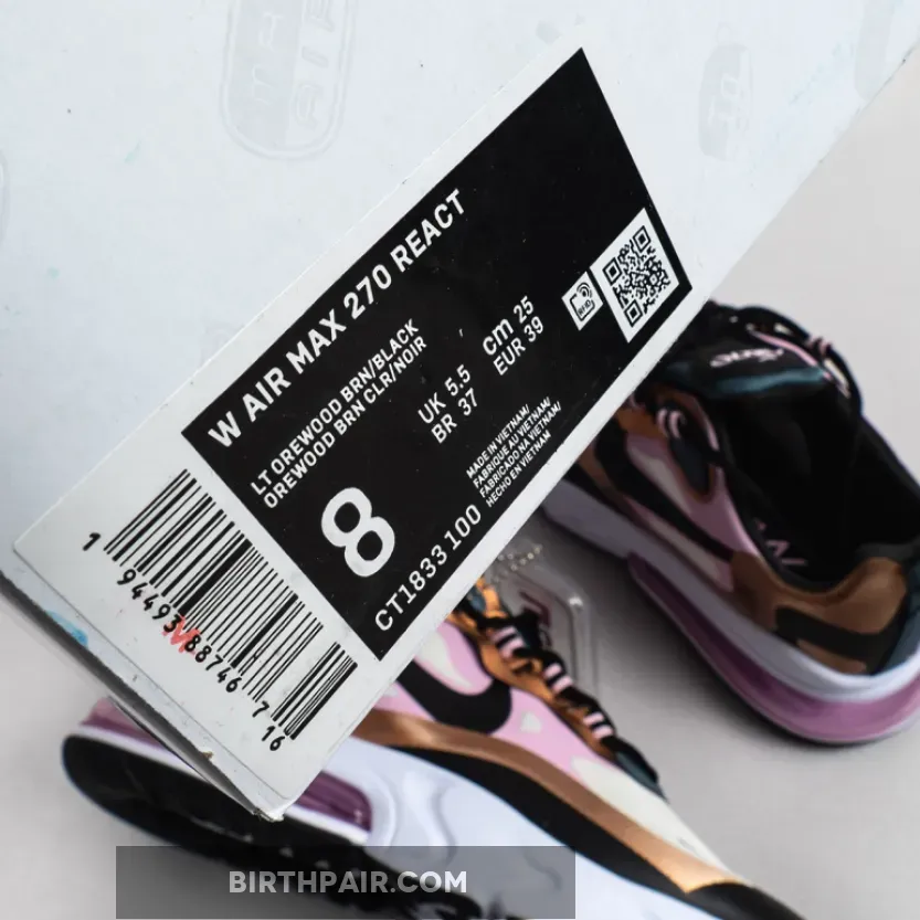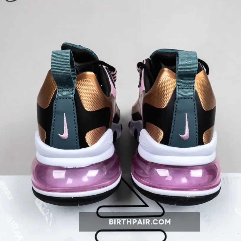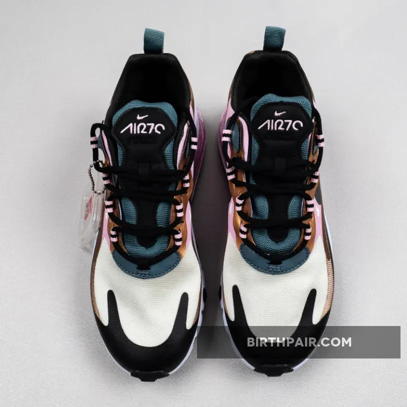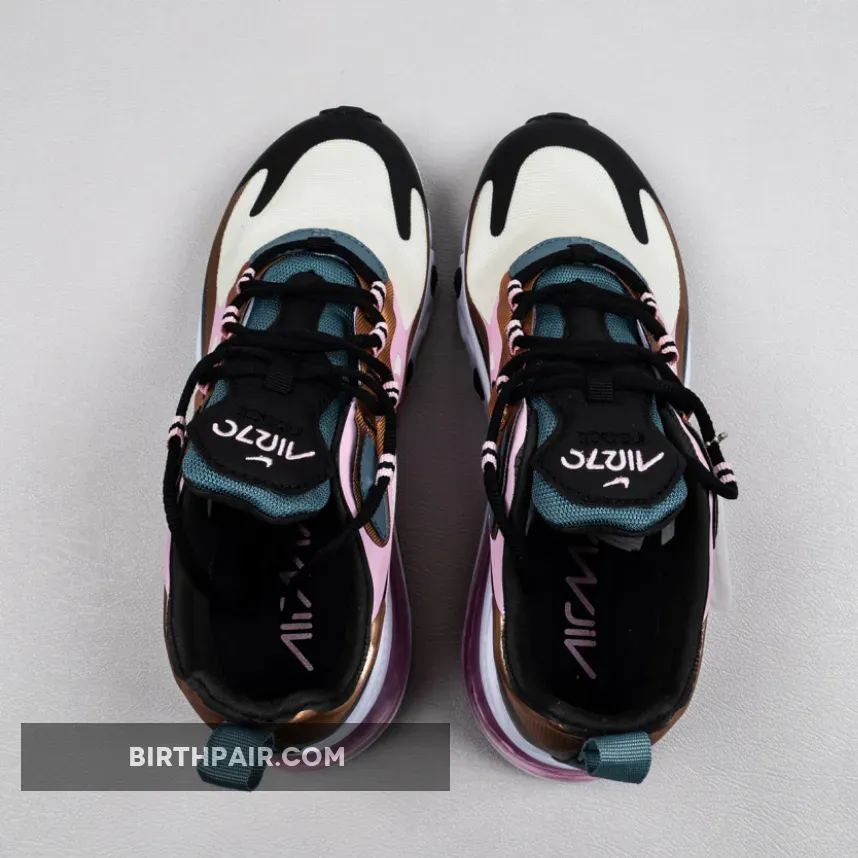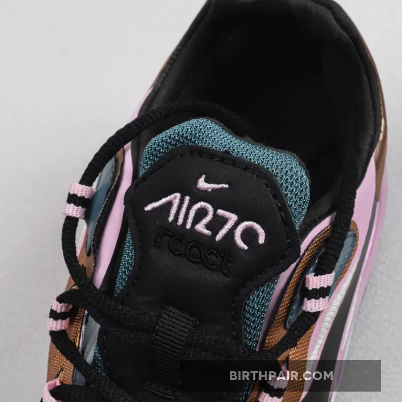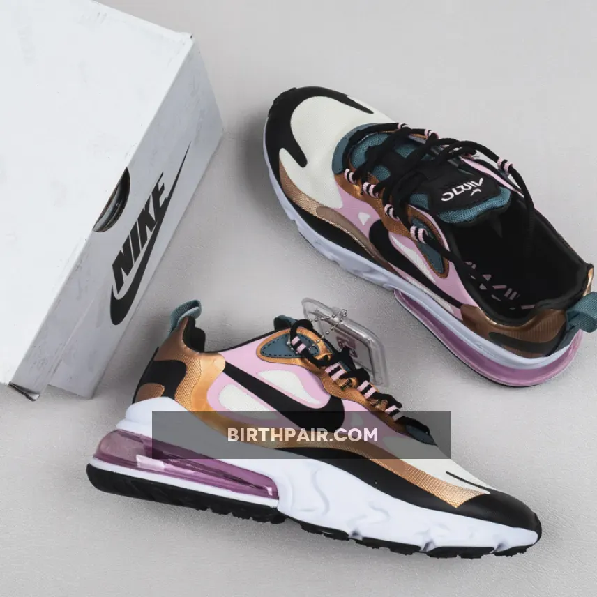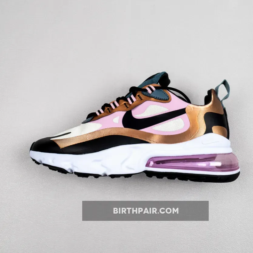 This offering of the Nike Air Max 270 React features a Beige mesh base with synthetic overlays in a mix of Pink and Bronze with Black Swooshes on the sides.