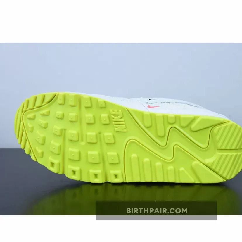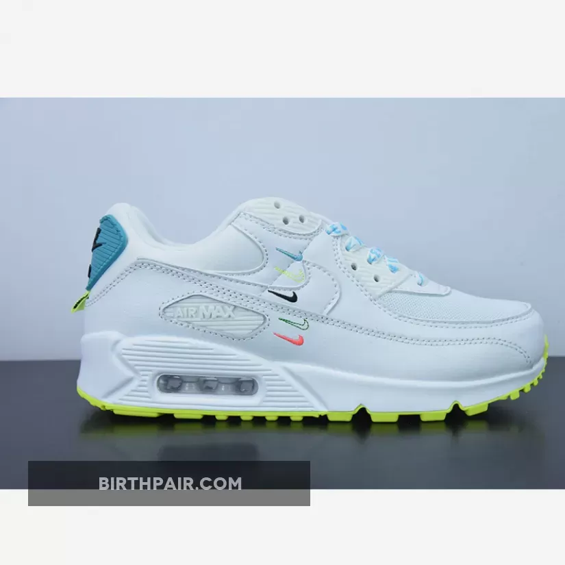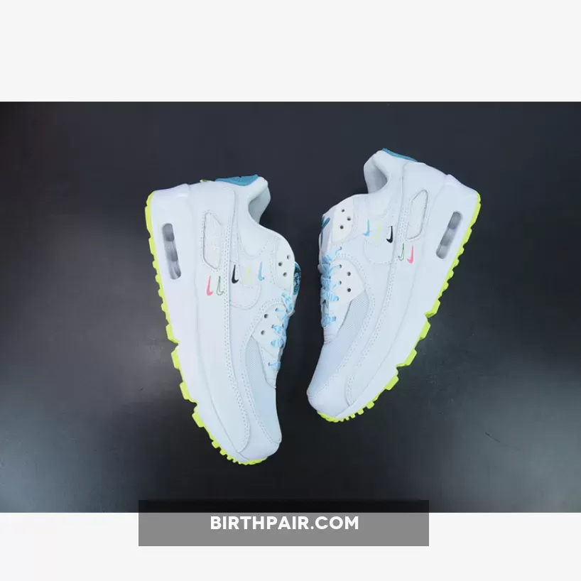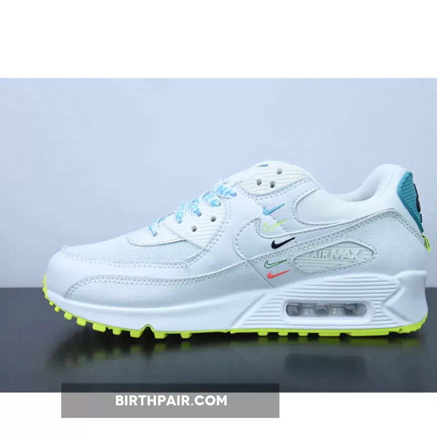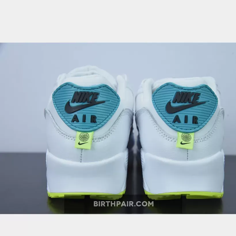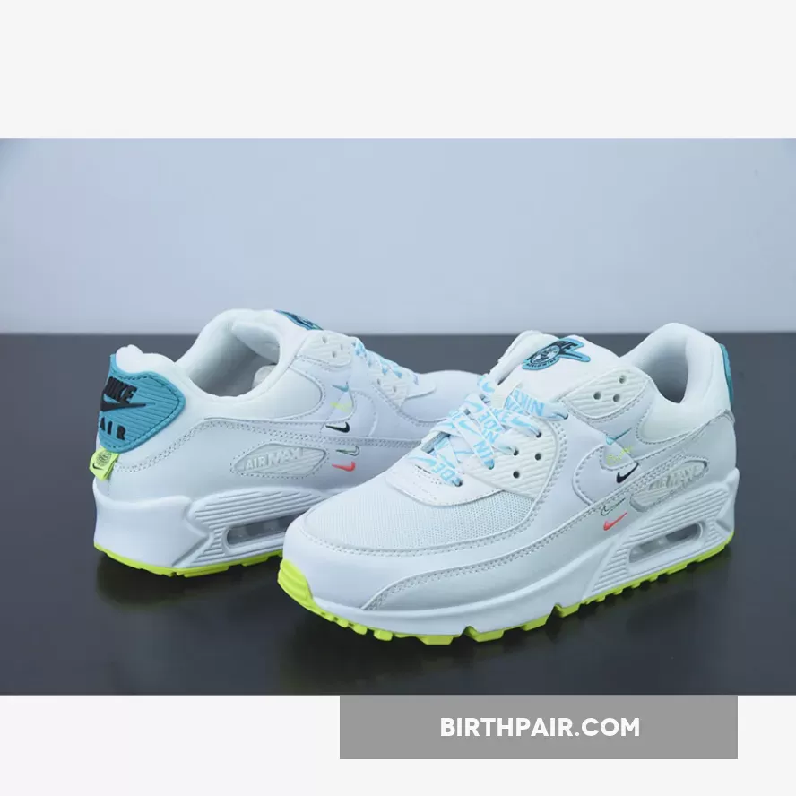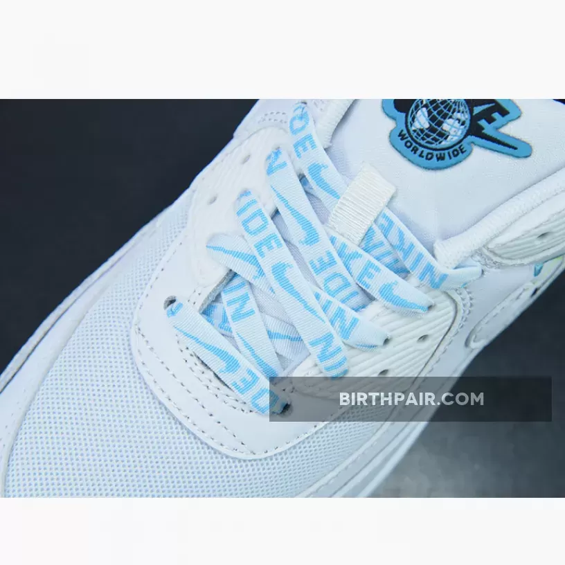 Dressed in a White, Blue Fury, and Volt color scheme. This Nike Air Max 90 features a White leather base highlighted with a stacked of Swooshes on each side. “Worldwide” branding on the tongues and insoles with a label appearing on the heels completes the design.
