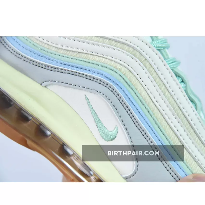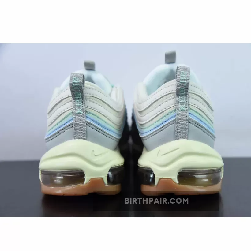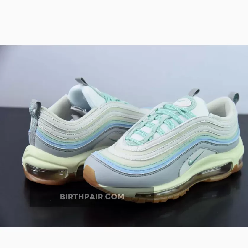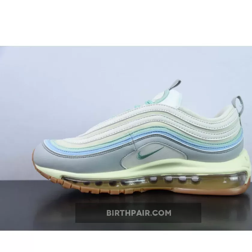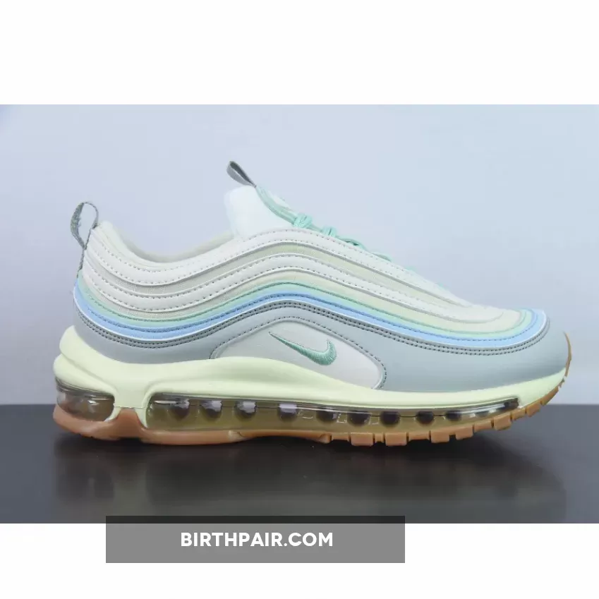 Let this dainty shoe take you to your sunny day adventures. The Nike Air Max 97 Certified Fresh Pastel Gum features a fun and bright colourway that’s still easy to wear with a plethora of outfits. A cream textile base sets the stage while white, pastel green and sky blue ripples take the spotlight. Even the classic Nike Air Max 97 laces and embroidered Nike Swoosh are dressed in a whimsical shade of muted green. Bringing balance to this soft palette is a neutral grey leather mudguard.