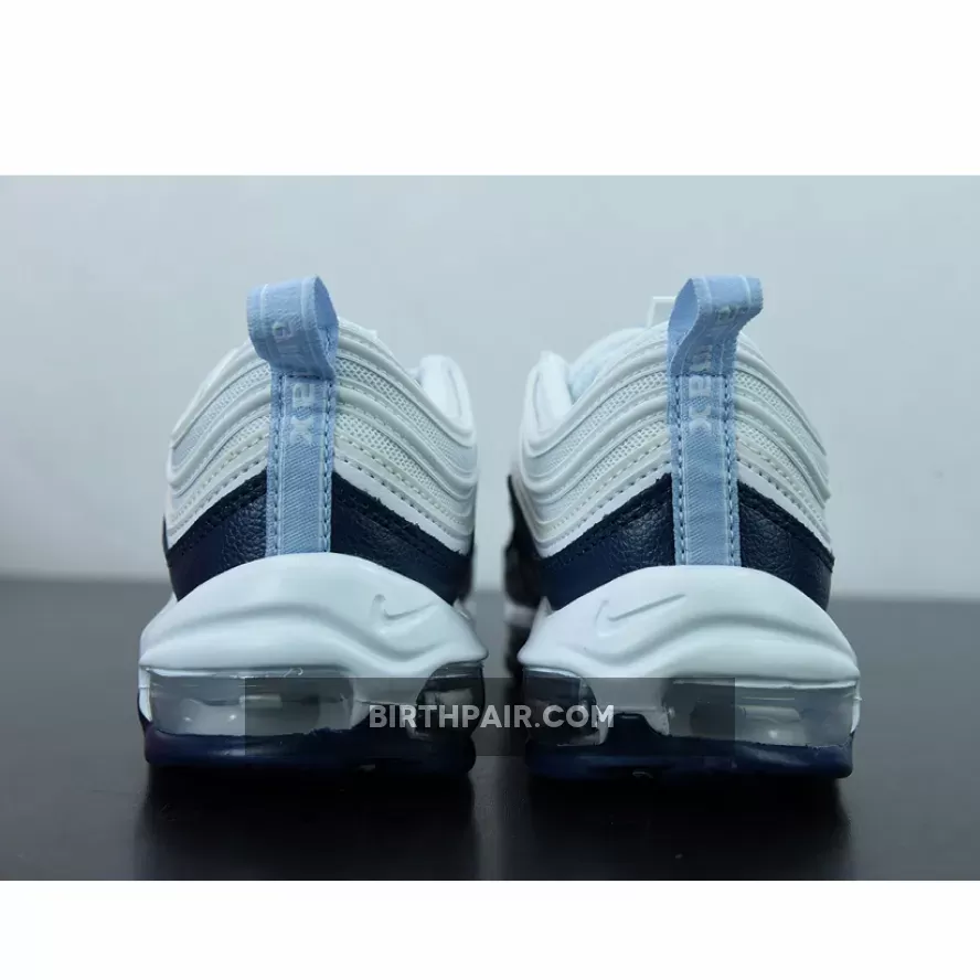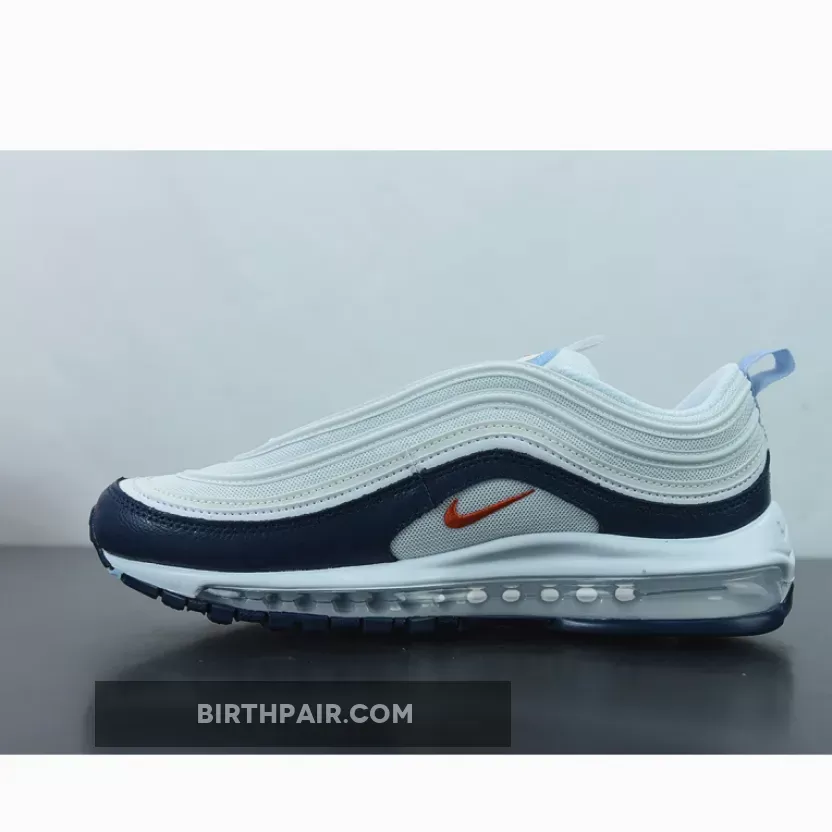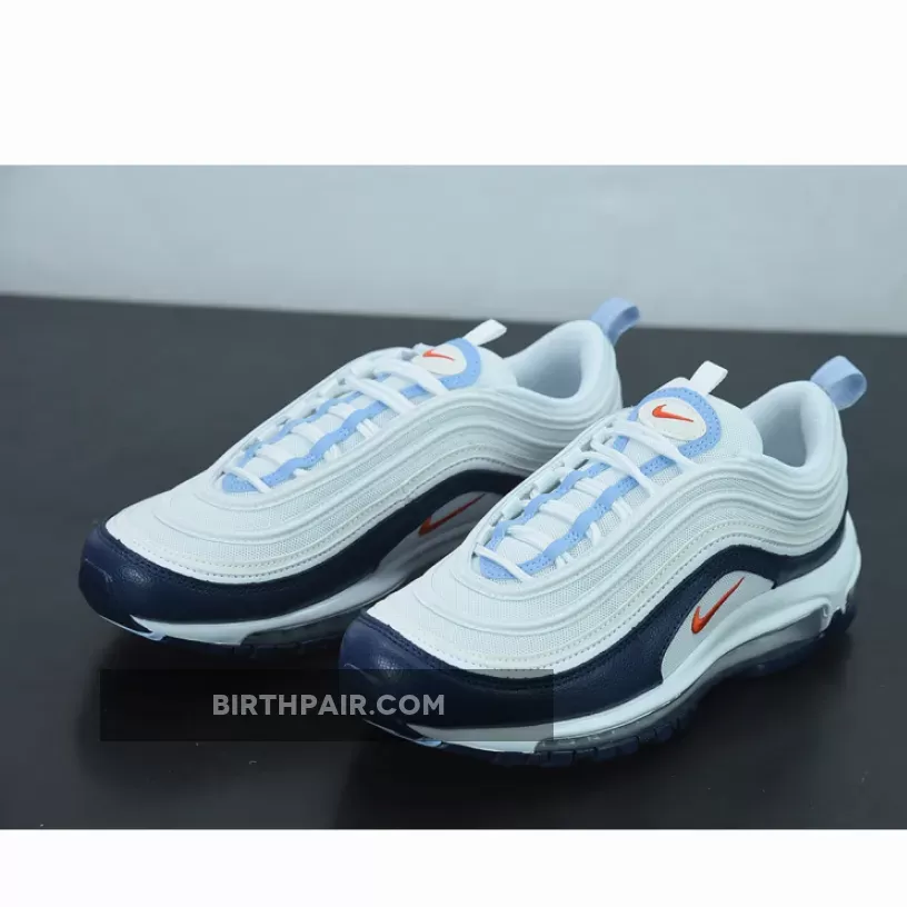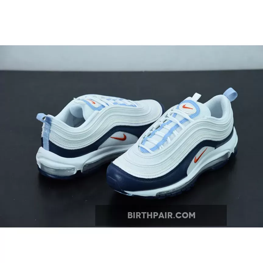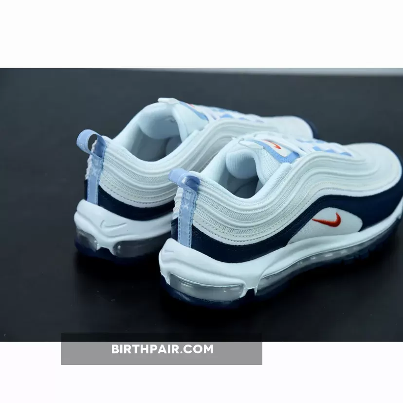 This offering of the Nike Air Max 97 features a White mesh upper with Navy tumbled leather overlays. Light Blue appears on the tongues and heel pull tabs, while having Red branding throughout.