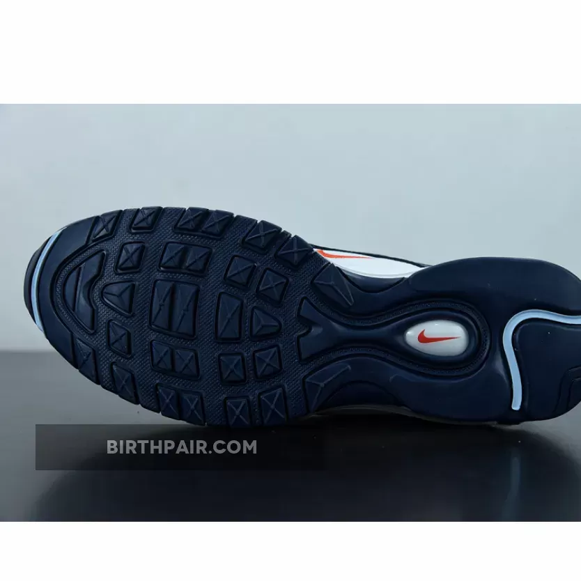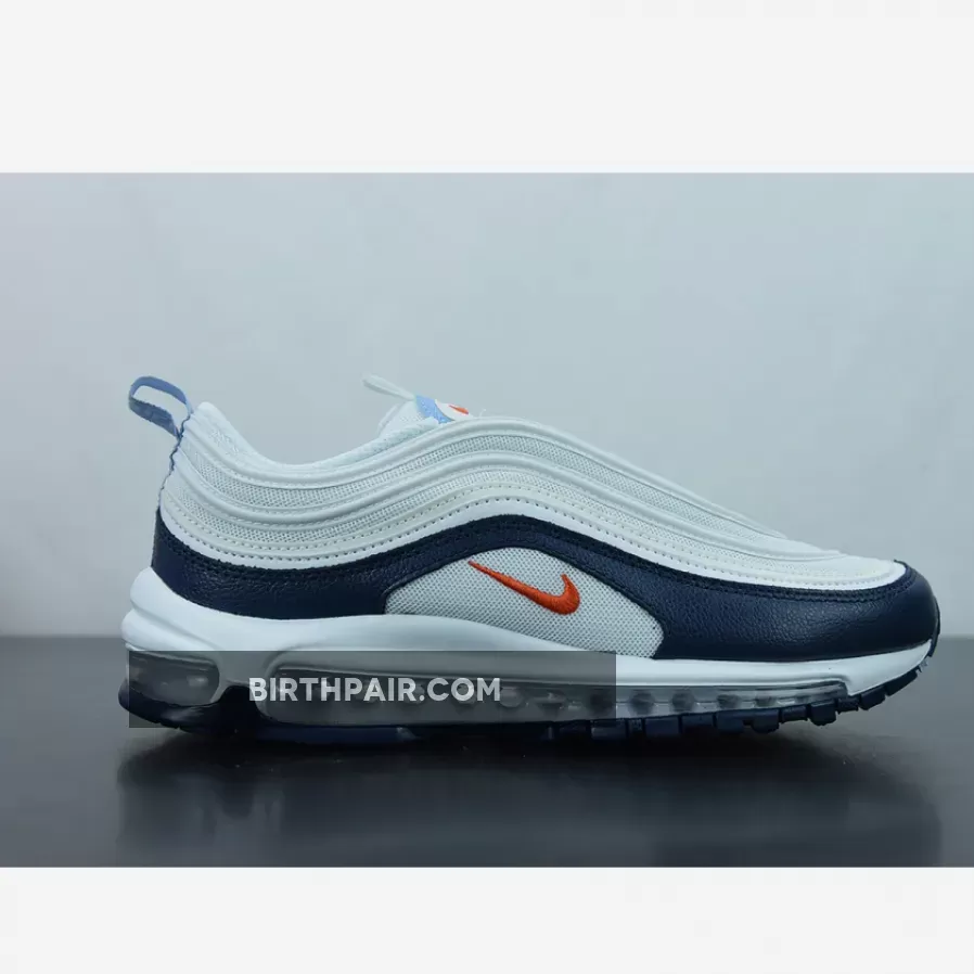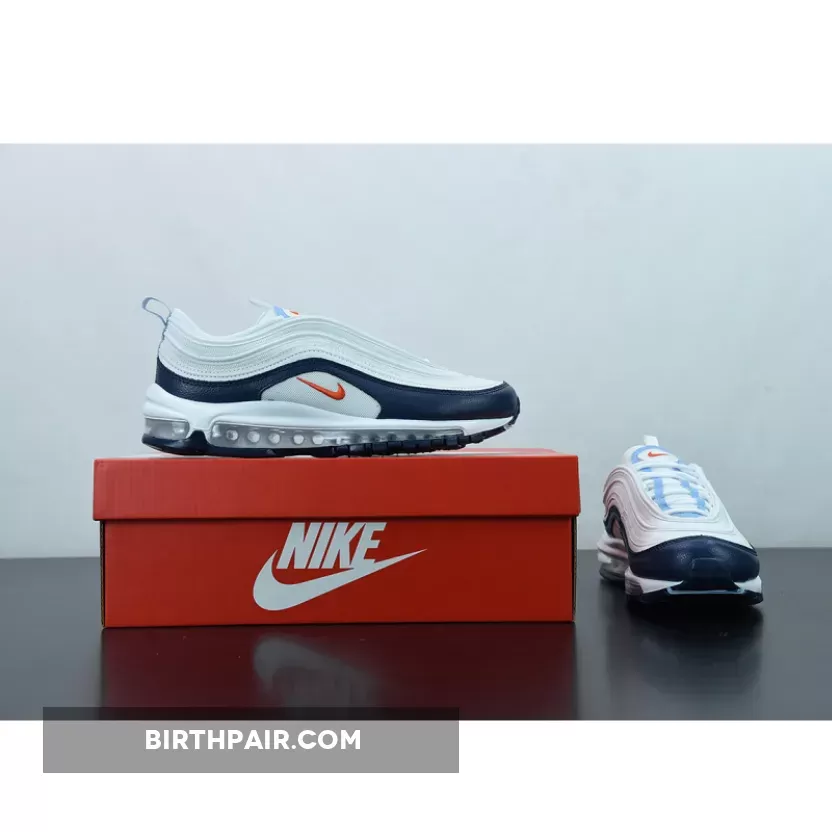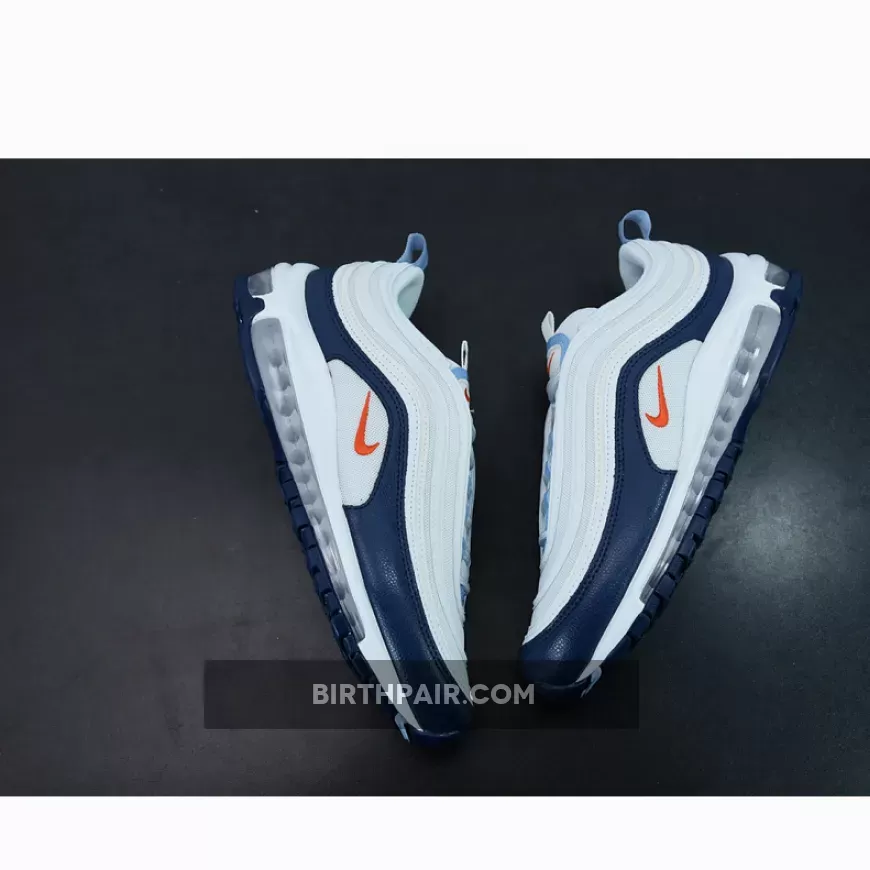 This offering of the Nike Air Max 97 features a White mesh upper with Navy tumbled leather overlays. Light Blue appears on the tongues and heel pull tabs, while having Red branding throughout.