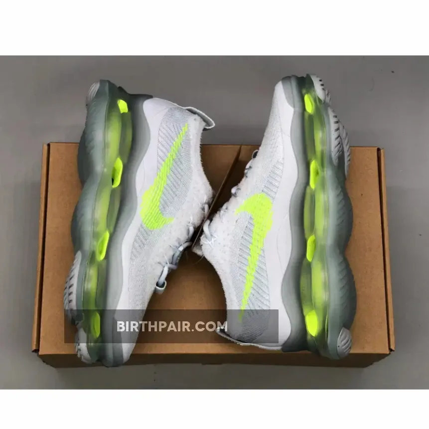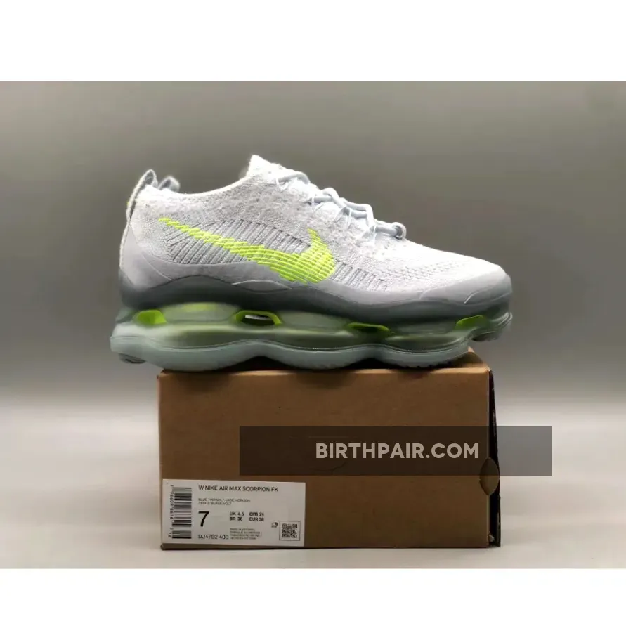 As the Air Max Scorpion continues to see action, it has been outfitted with an “Ice Blue” that is accented by bright “Volt” accents. From the textured mudguard to the tongue construction and heel, the entirety of the upper’s knit construction is treated to a crisp white colorless background that allows for the vamp, heel tab and mid-foot swooshes to fully boast a titular contrast throughout. Underfoot, the all-consuming sole unit’s semi-translucent finish is cast in a subtle “Ice Blue” accent that’s nearly indiscernible.