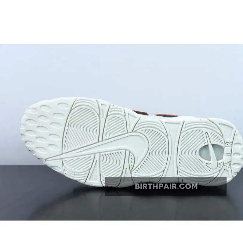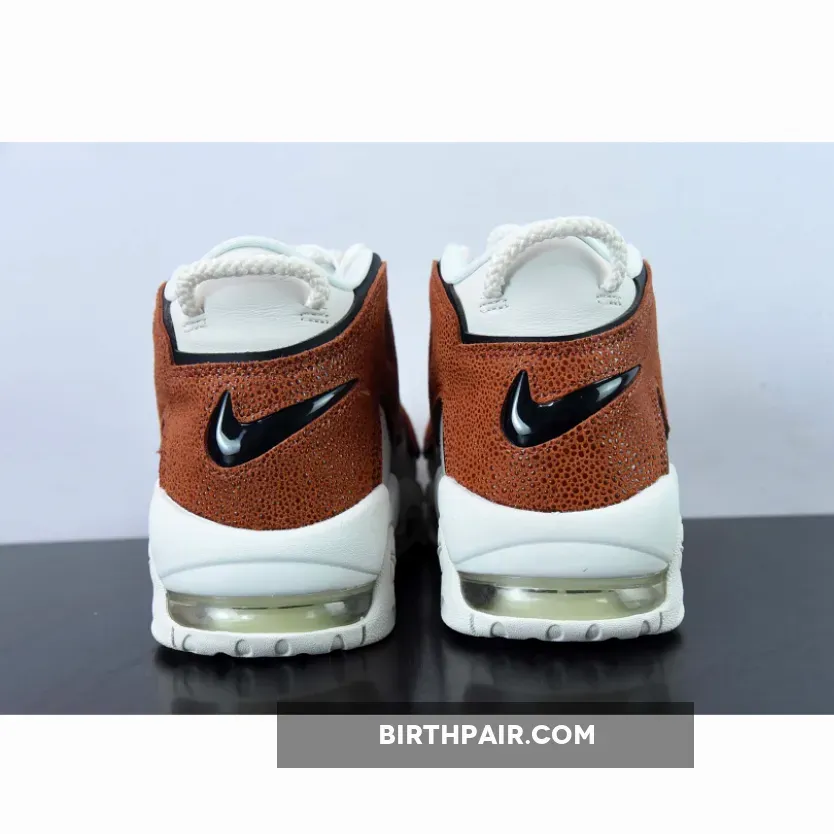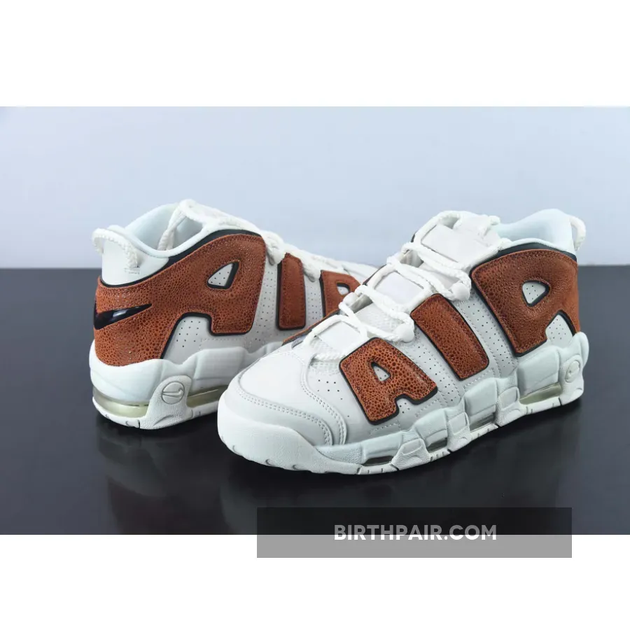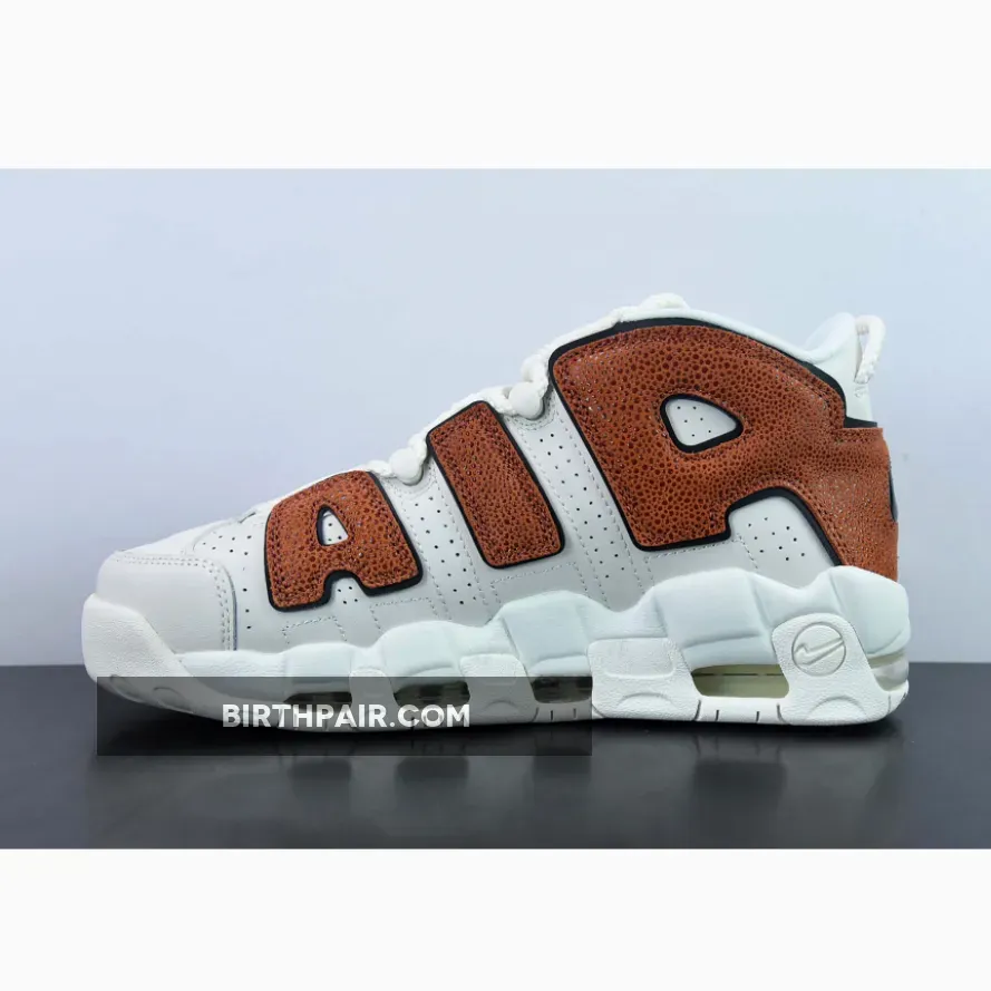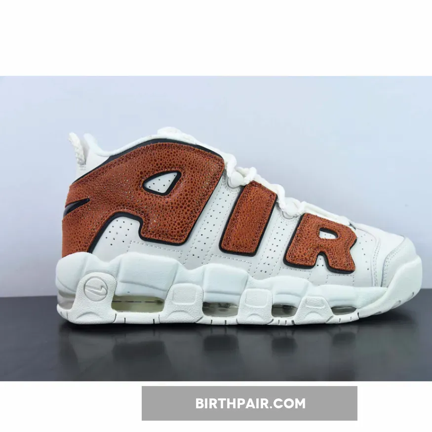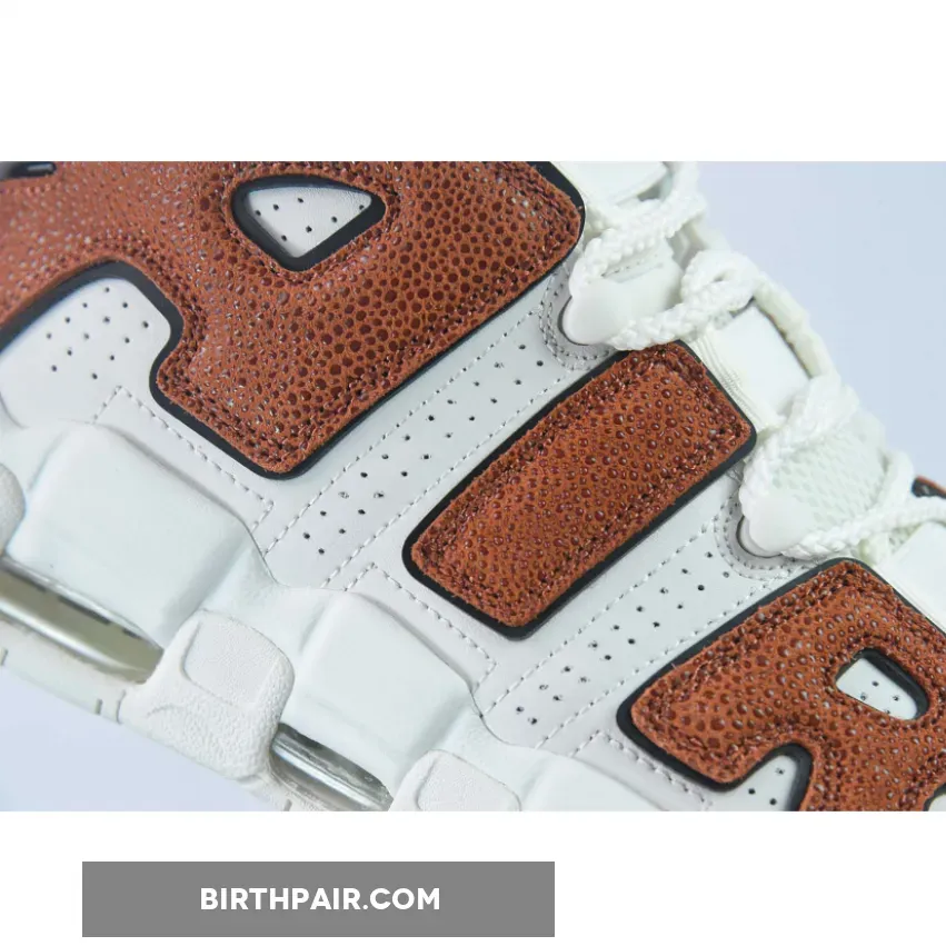 Meanwhile, large “AIR” letter patches on the side panels are dressed in a textured brown tumbled leather that’s reminiscent of a gritty basketball surface. Finally, classic Nike Air More Uptempo features such as lightweight Air bubble units and convenient loops are retained.