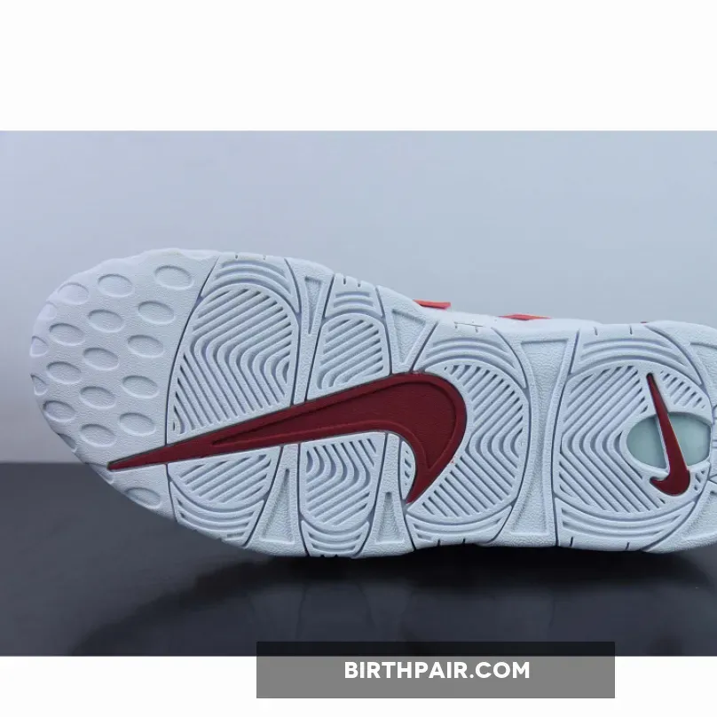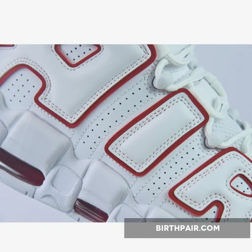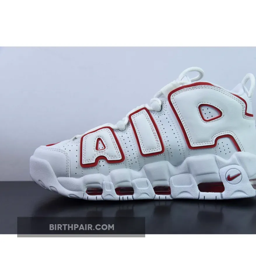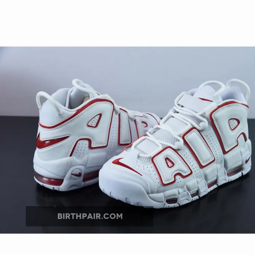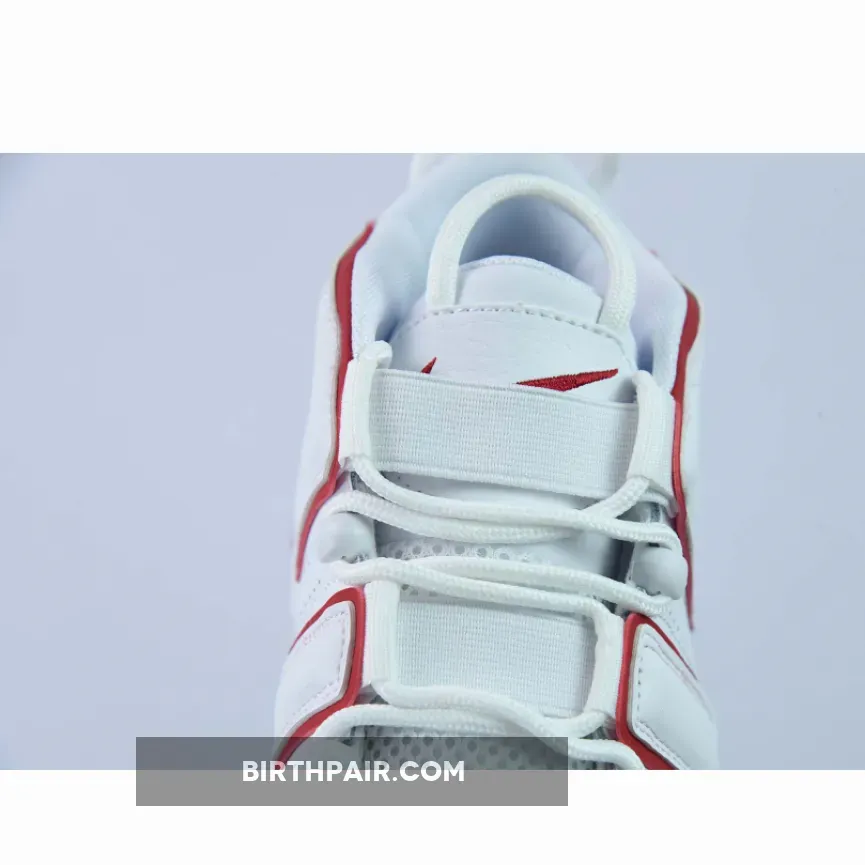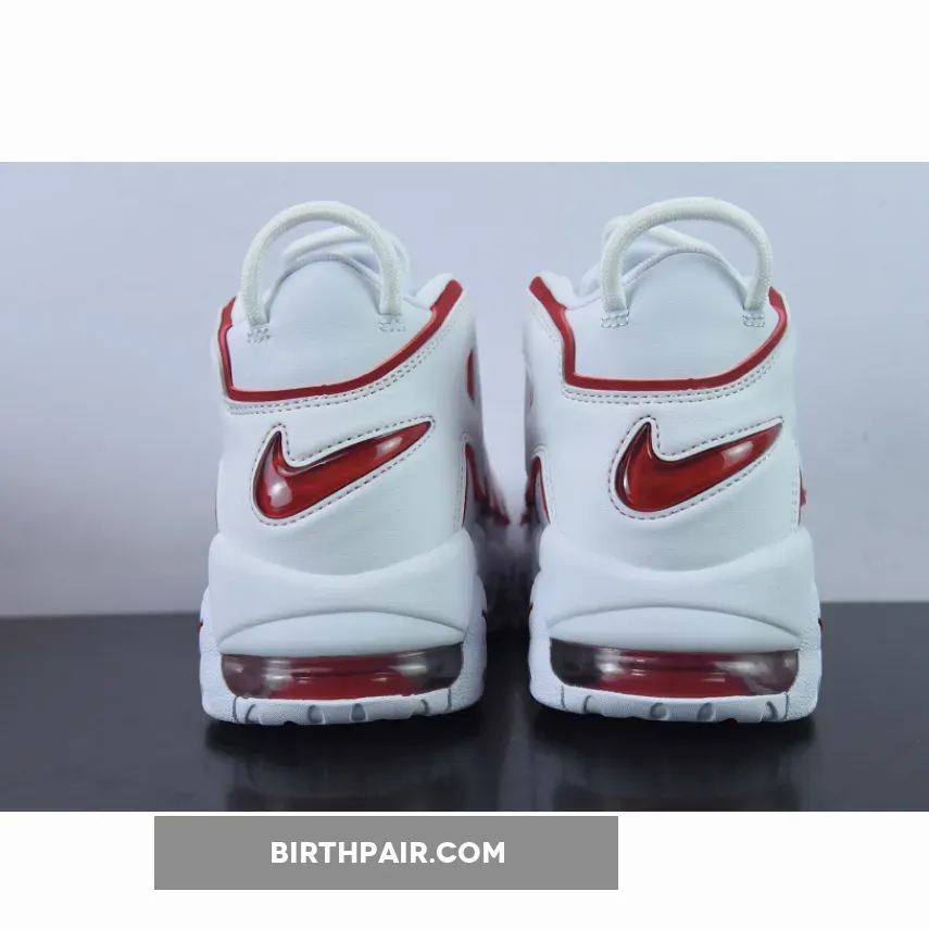 this Nike Air More Uptempo resembles the original release, while utilizing White leather throughout and perforations on the sides. Next, Varsity Red outlines the large ‘AIR’ branding on the sides. More Red adorns the Swoosh logos on the midsole, toe, and heel.