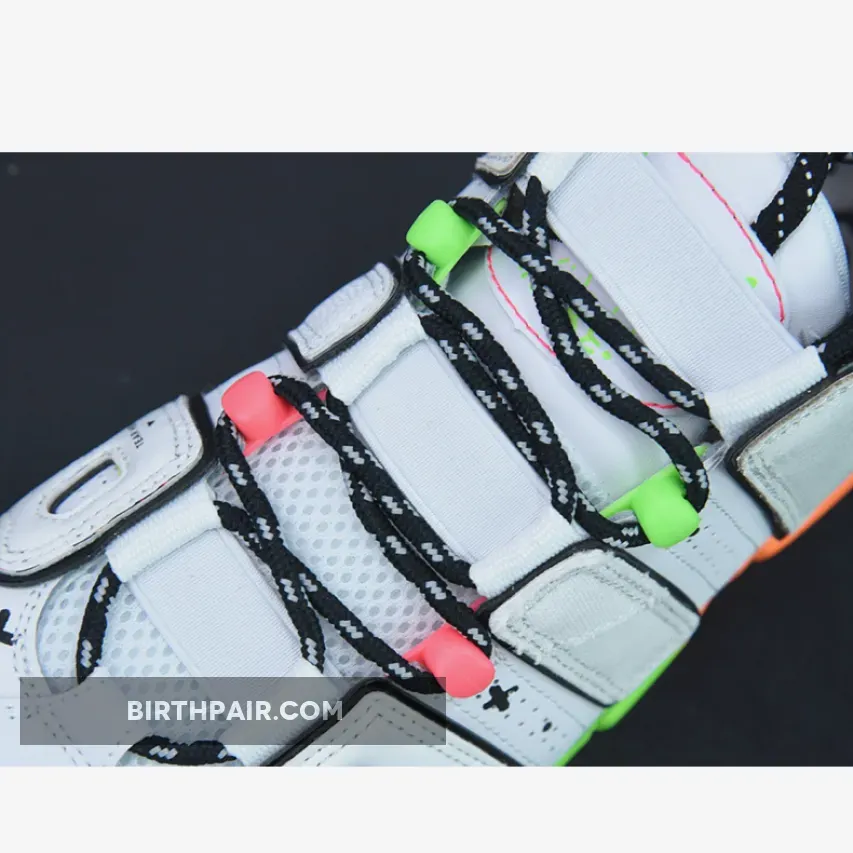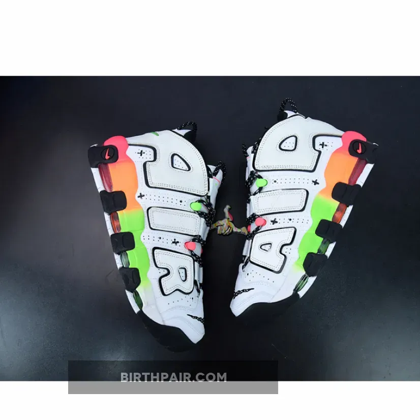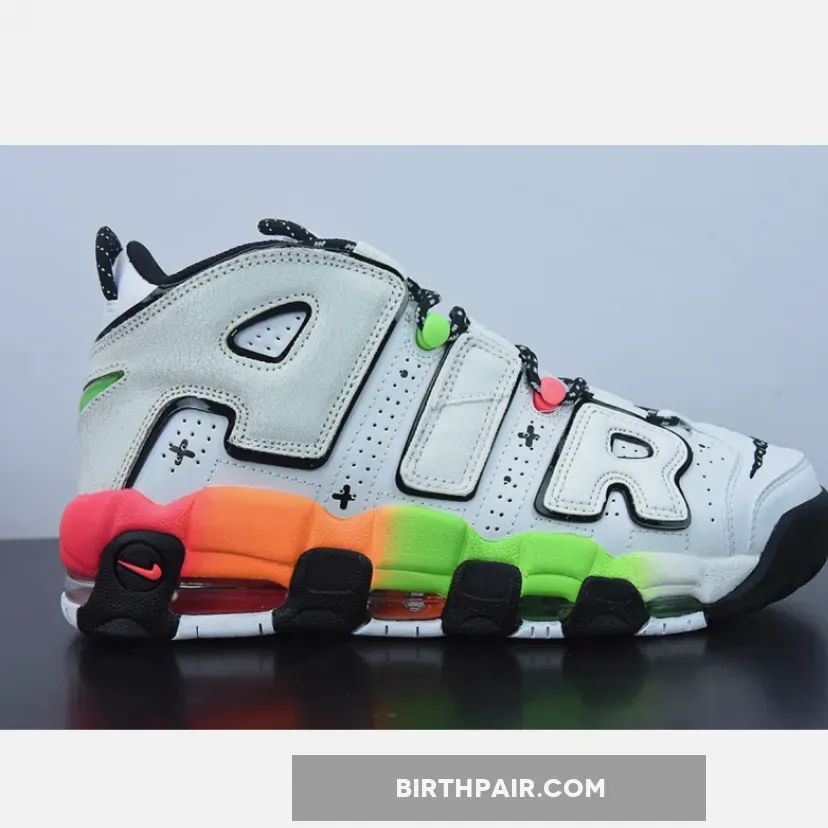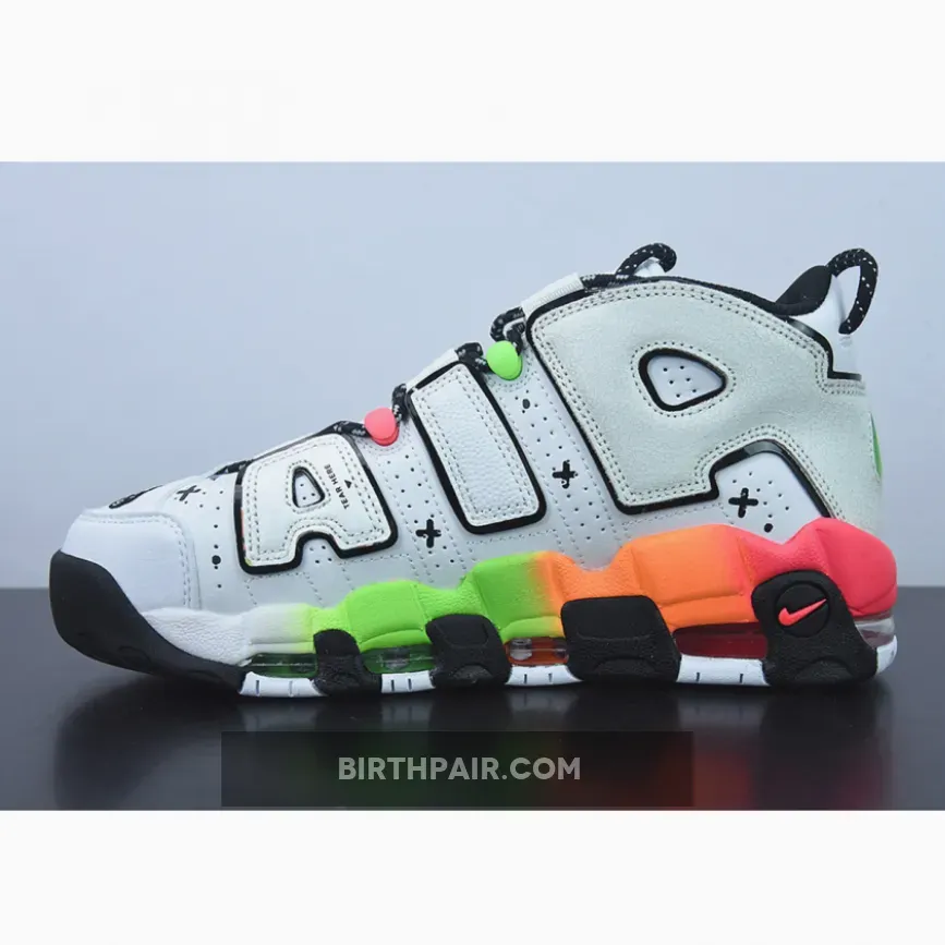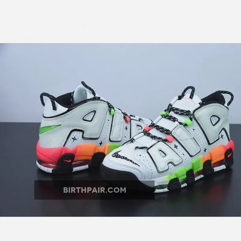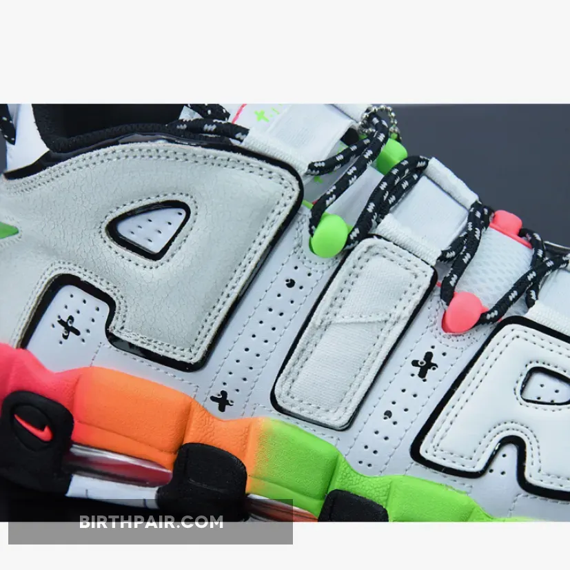 This Nike Air More Uptempo features White leather on the base while various materials land on the removable ‘AIR’ branding that also has a ‘Tear Here’ sign. Across the midsole is a gradient of Green, Orange, and Pink, while a Black mini Swoosh hits the toe with a smiley face and sprinkles. The same design adorns the tongue, and a unique graphic is placed on the insoles. Each pair also comes with a special hangtag.