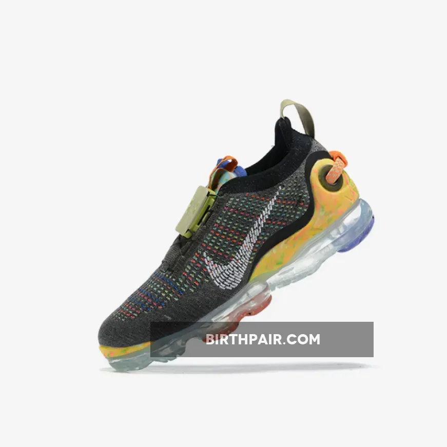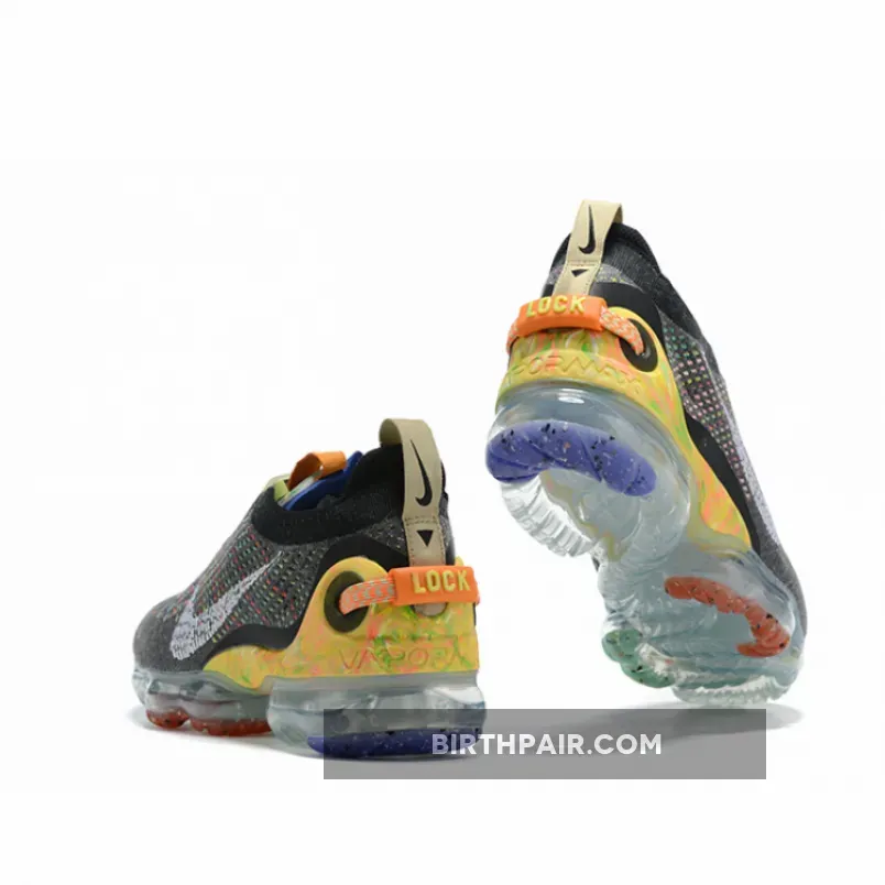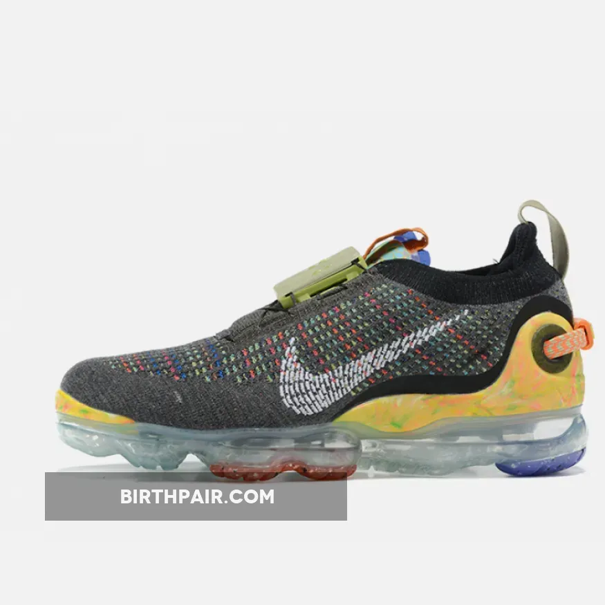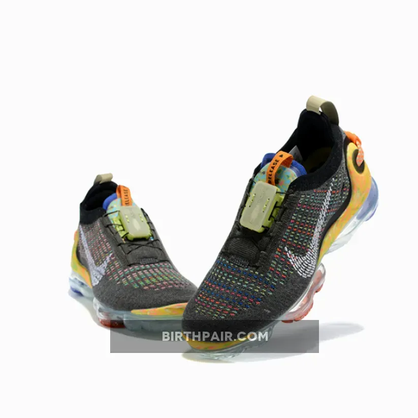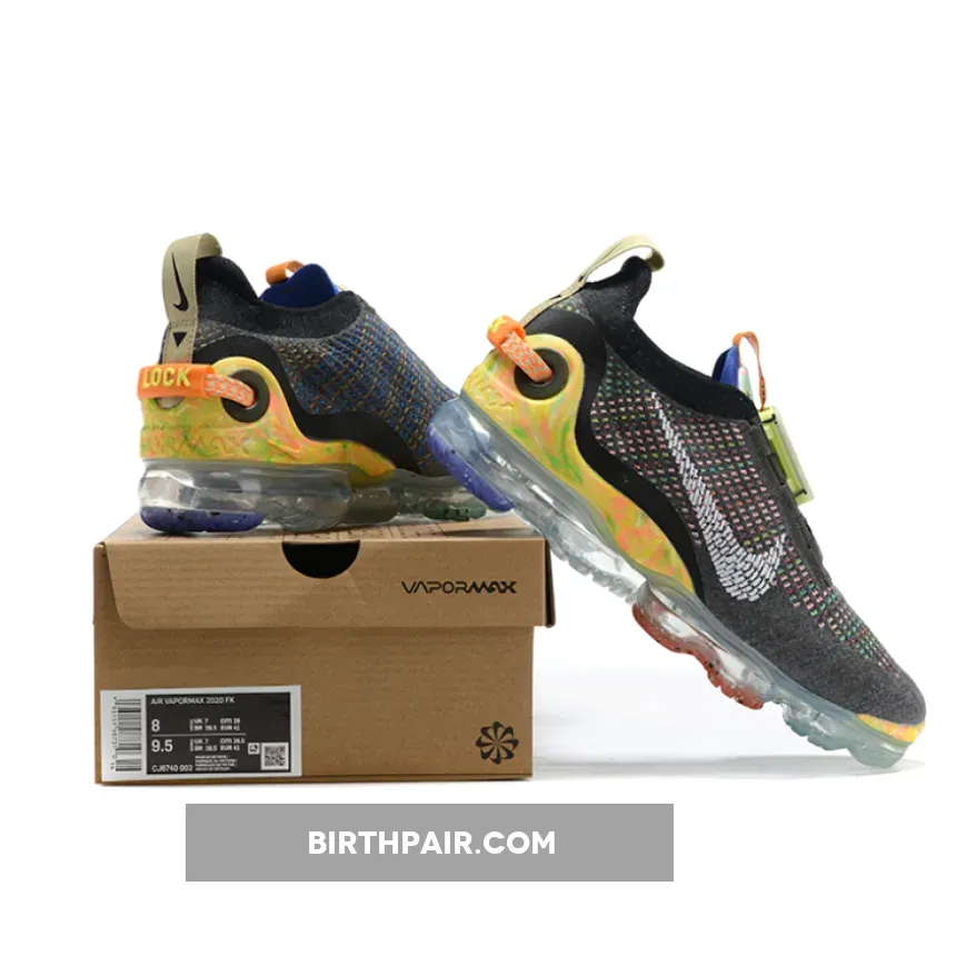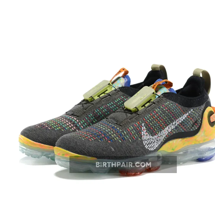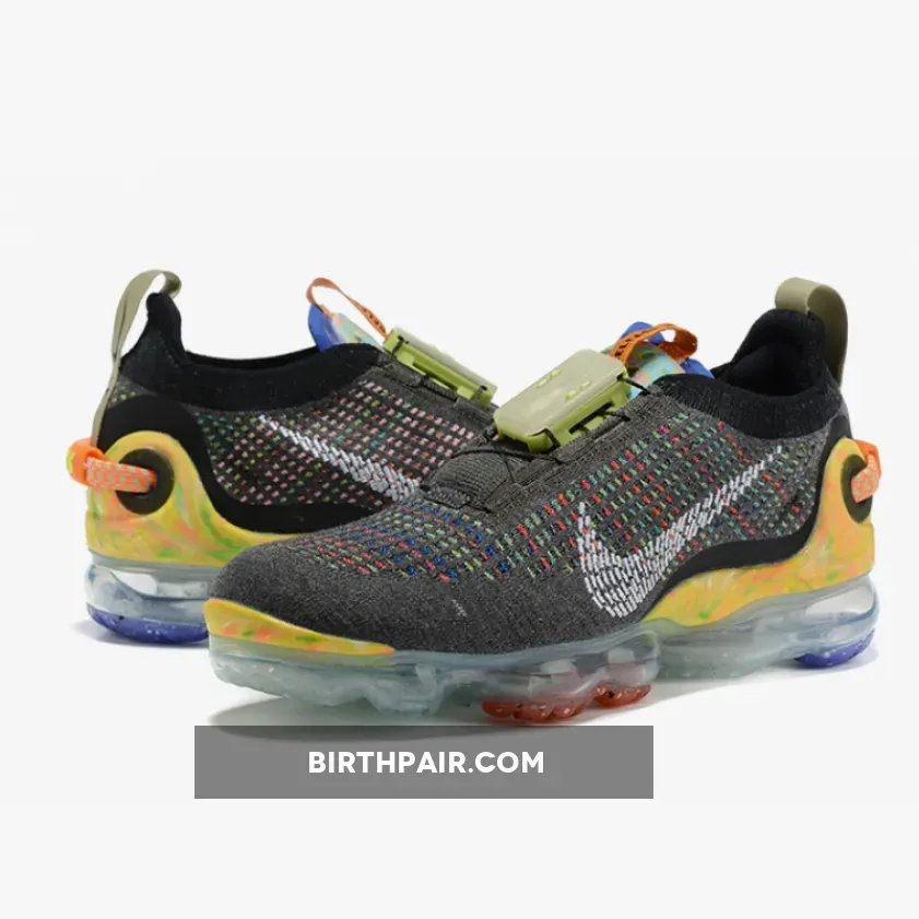 As with every iteration of the FlyEase-equipped model thus far, knitted uppers set the stage for their more-eye-catching embellishments with a muted color scheme. Dark grey bases incorporate a rainbow-reminiscent palette across the toe box and profiles, but they take a backseat nonetheless. Marble-like overlays at the forefoot and heel indulge in the pair’s most vibrant arrangement, donning a bright orange makeup laden with equally-bold darker orange and green hues. FlyEase mechanisms at the tongue and rear further partake in the statement-making color scheme, with each foring the aforementioned hues evenly. Underfoot, VaporMax cushioning largely forgoes the upper’s loud aesthetic, but sports some multi-colored accents of its own at high-wear zones.