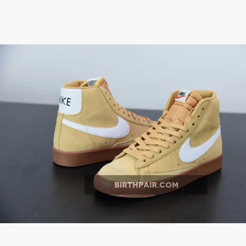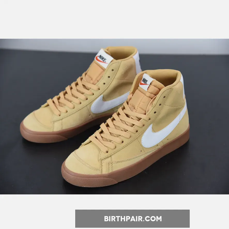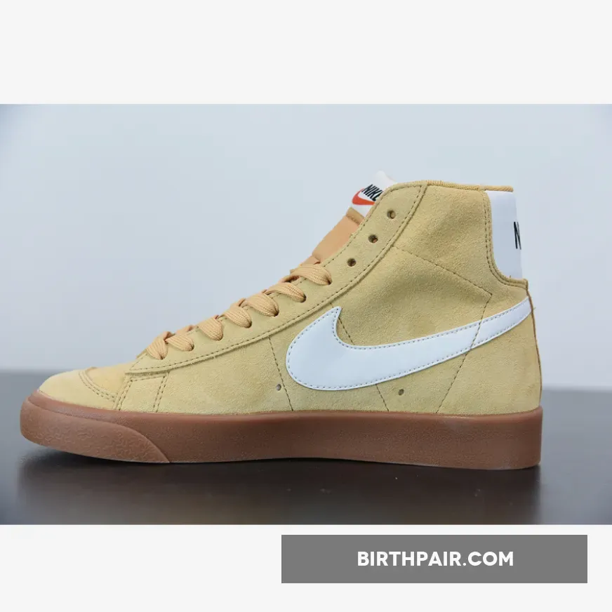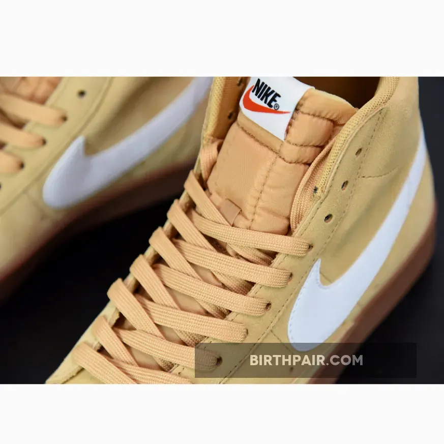 This edition of the Nike Blazer Mid features a Wheat suede upper paired with White leather Swooshes and heel overlays.