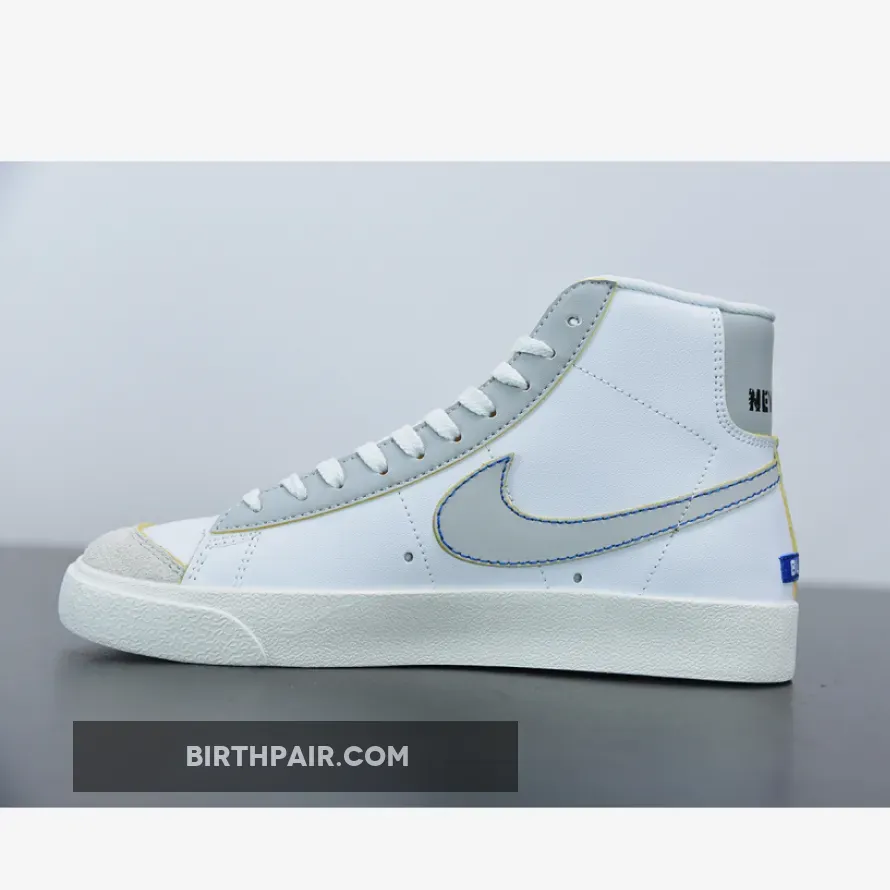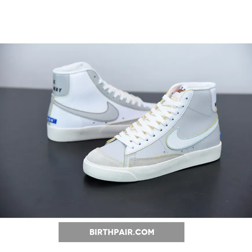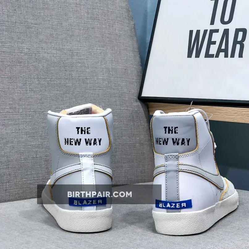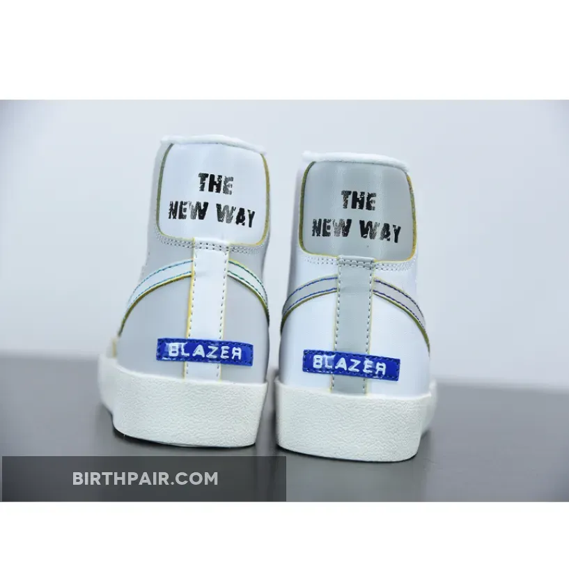 you’ll find a bright blue underlay that matches with its bordering exposed stitchings. In term of the lateral/medial sides, they split between a light grey exterior on the former and angelic outers on the latter. Moreover, the heels trade out the normal “Nike” text for “The New Way”, and the lower rear spells out the shoe’s moniker in paint-like font.