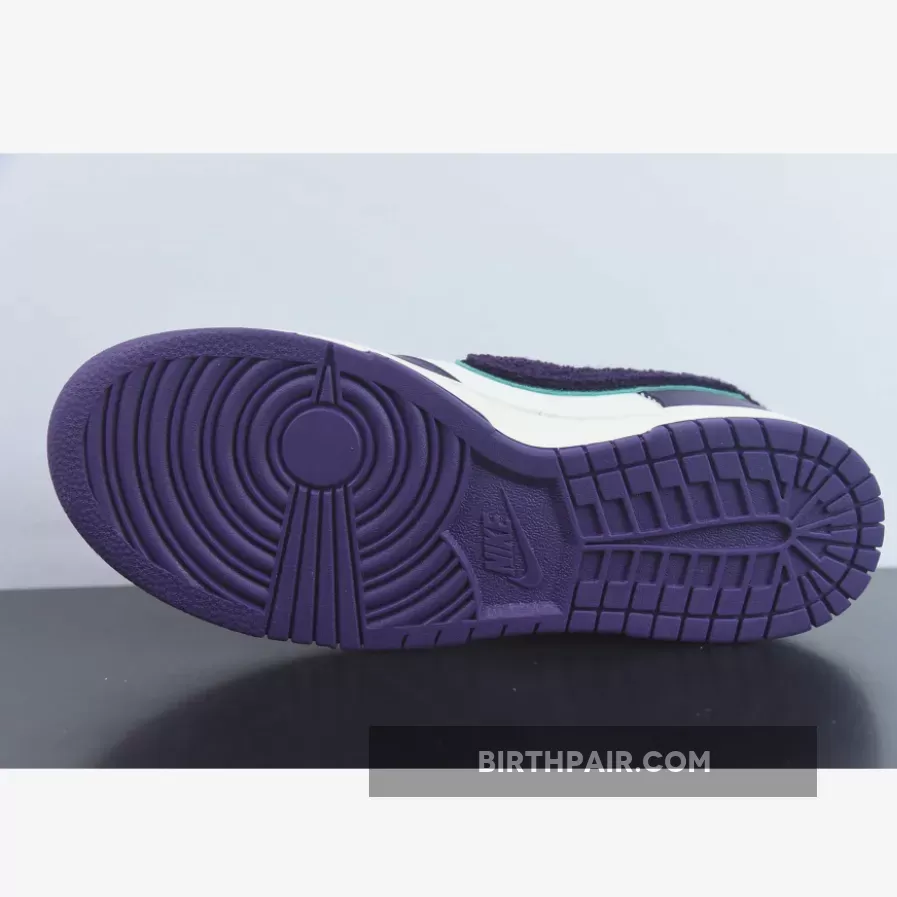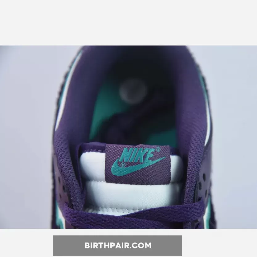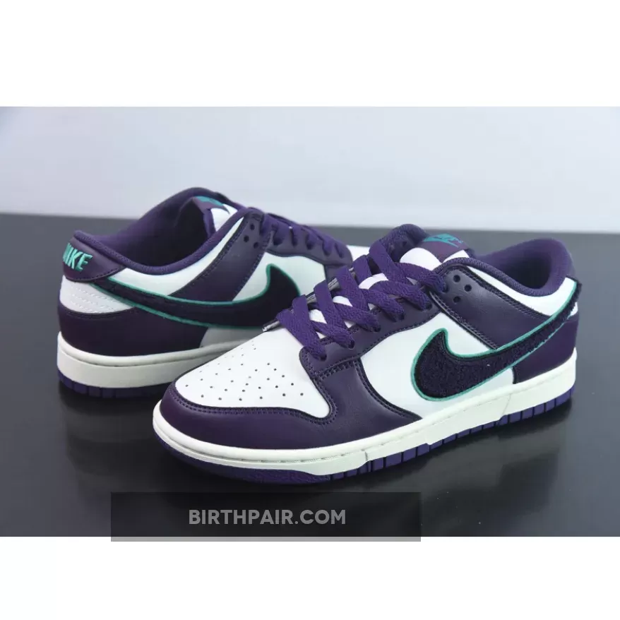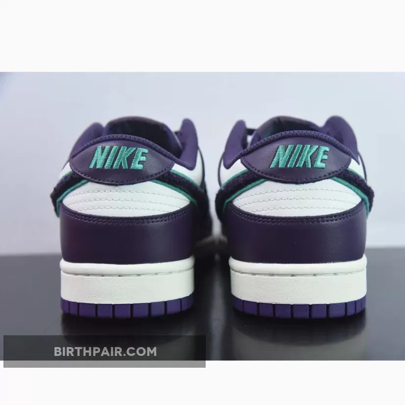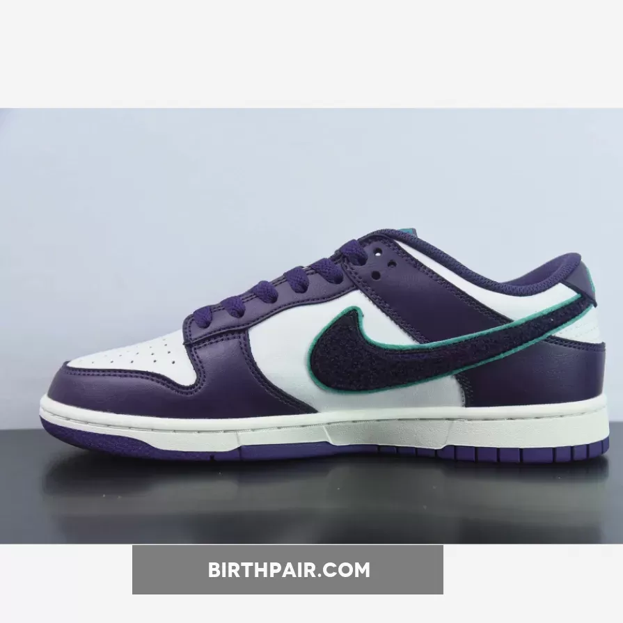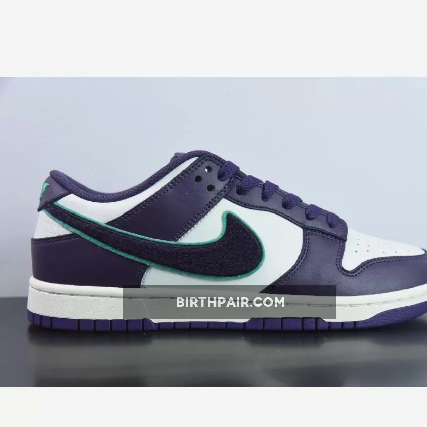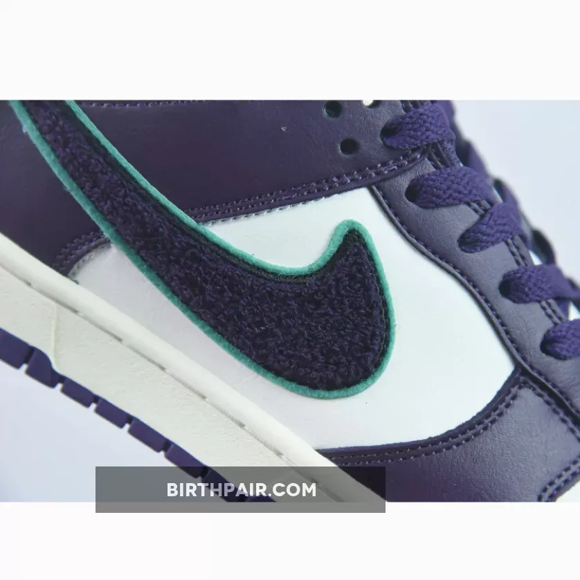 The Swoosh Brand fails to run out of designs for the coveted Dunk Low silhouette. This time around, Nike is experimenting with a mixed materials approach. Meet the Nike Dunk Low Chenille White Purple. Looking at the front of the sneaker, this pair of Dunk Lows look standard enough. The shiny, smooth leather overlays on the body of the sneaker come in the same tone, offset by the bright-white base beneath. The laces are the same tone, whilst a teal Nike branding design decorates the top of the tongue. The same green tone highlights the Nike Swoosh on the medial and lateral sidewalls, as well as the Nike embroidery on the back of the heel. The Swoosh is decorated in a chenille fabric to add a twist to the design.