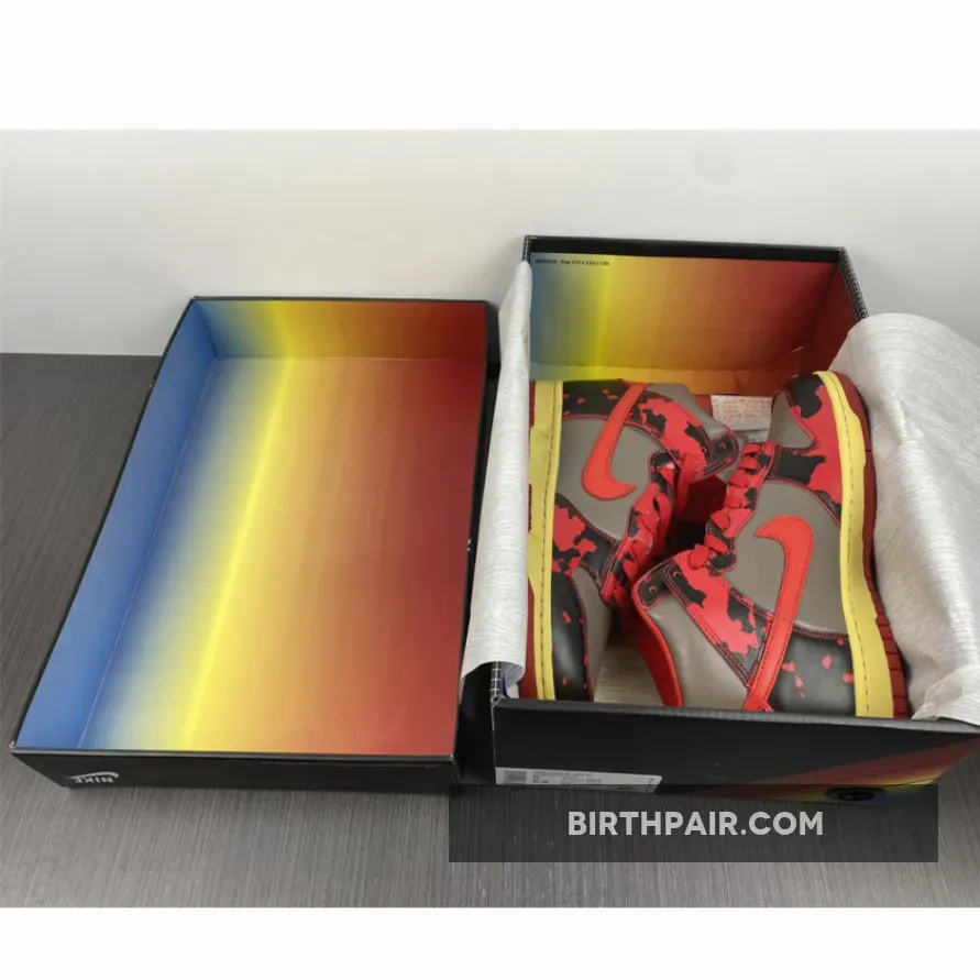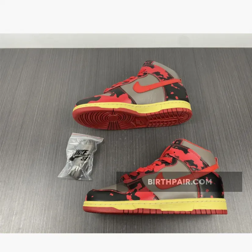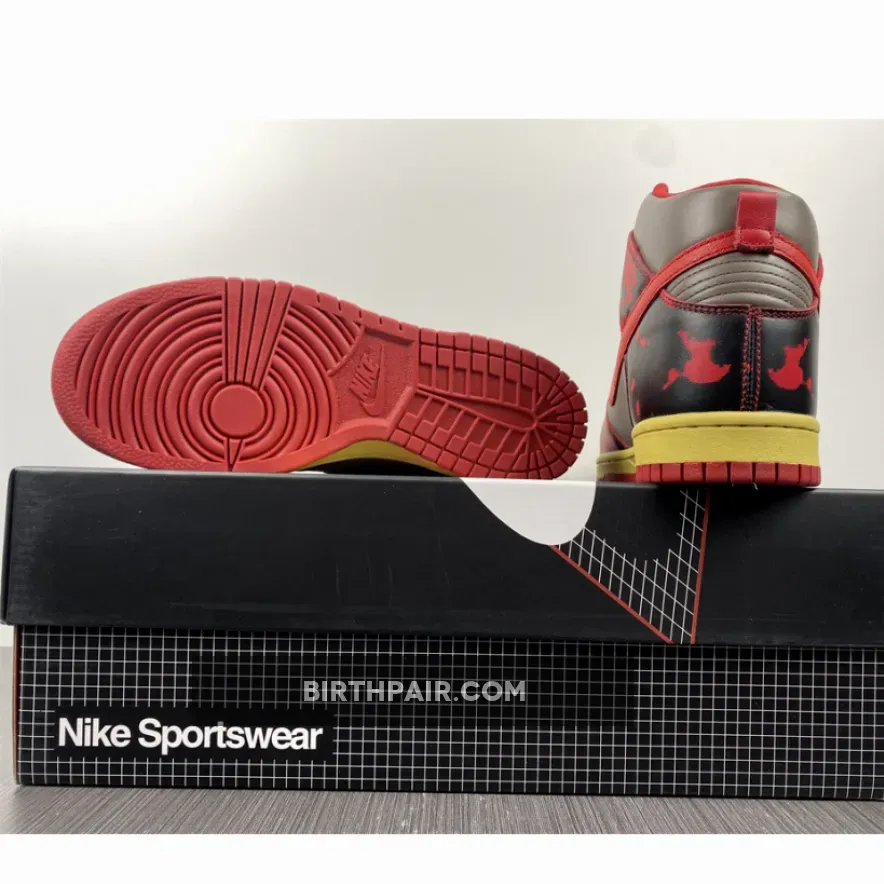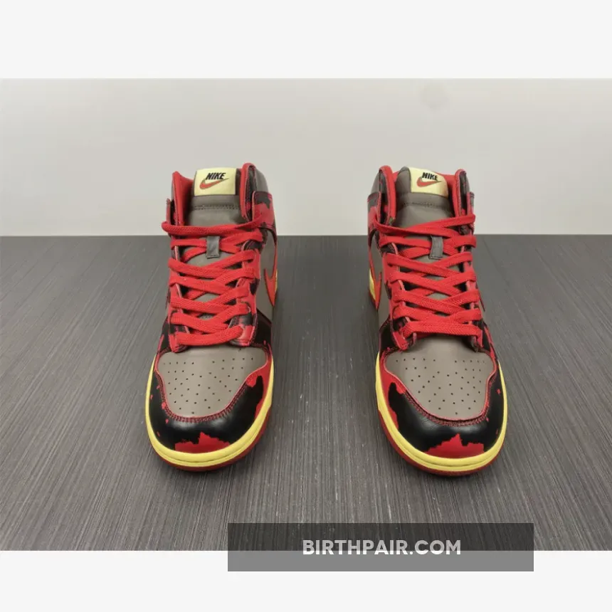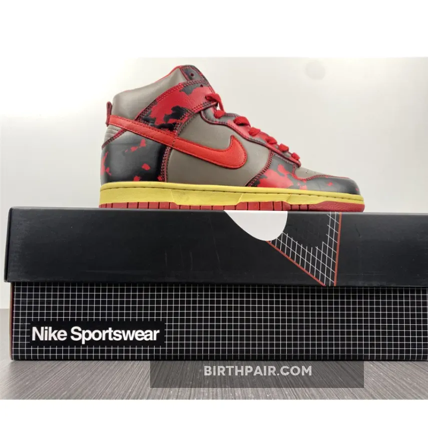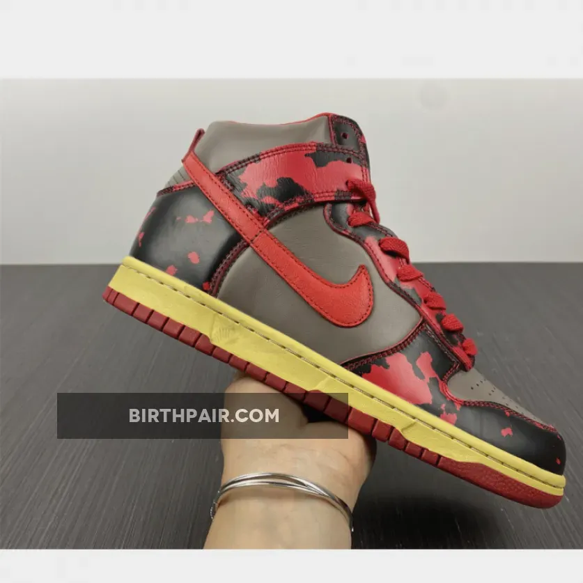 Going over this Nike Dunk High, it features Grey leather on the panels, toe box, and ankle while Red and Black form an acid wash that covers the overlays. More Grey covers the tongue while Red appears on the laces, Swoosh logos, liner, and rubber outsole.