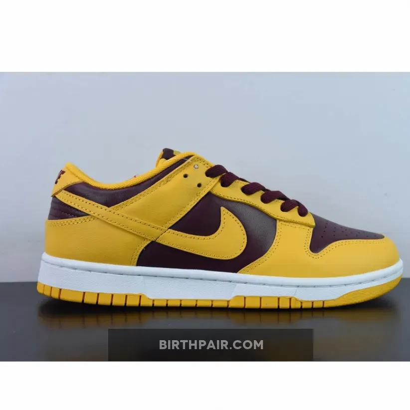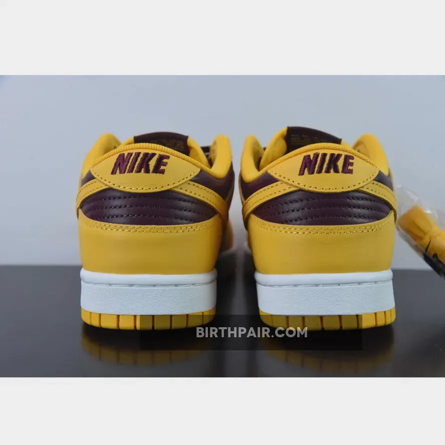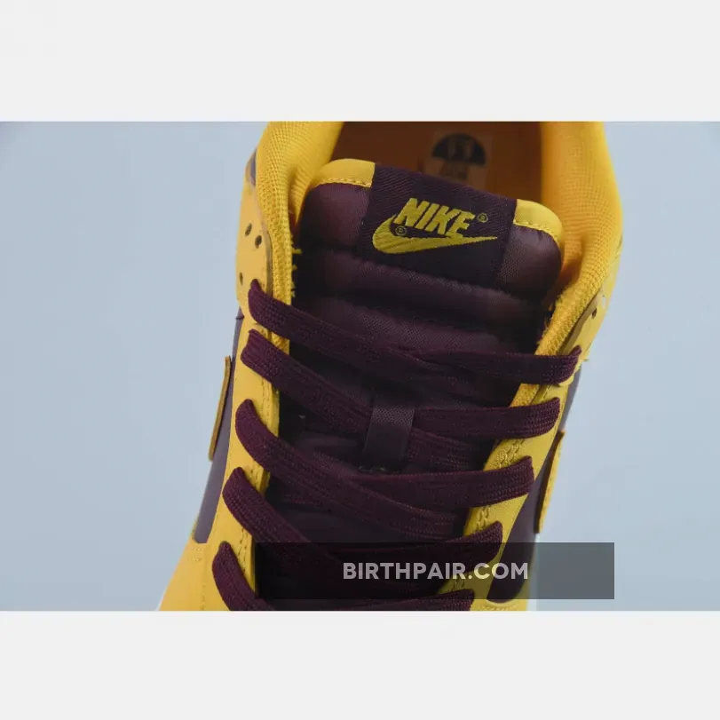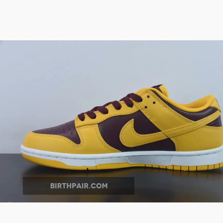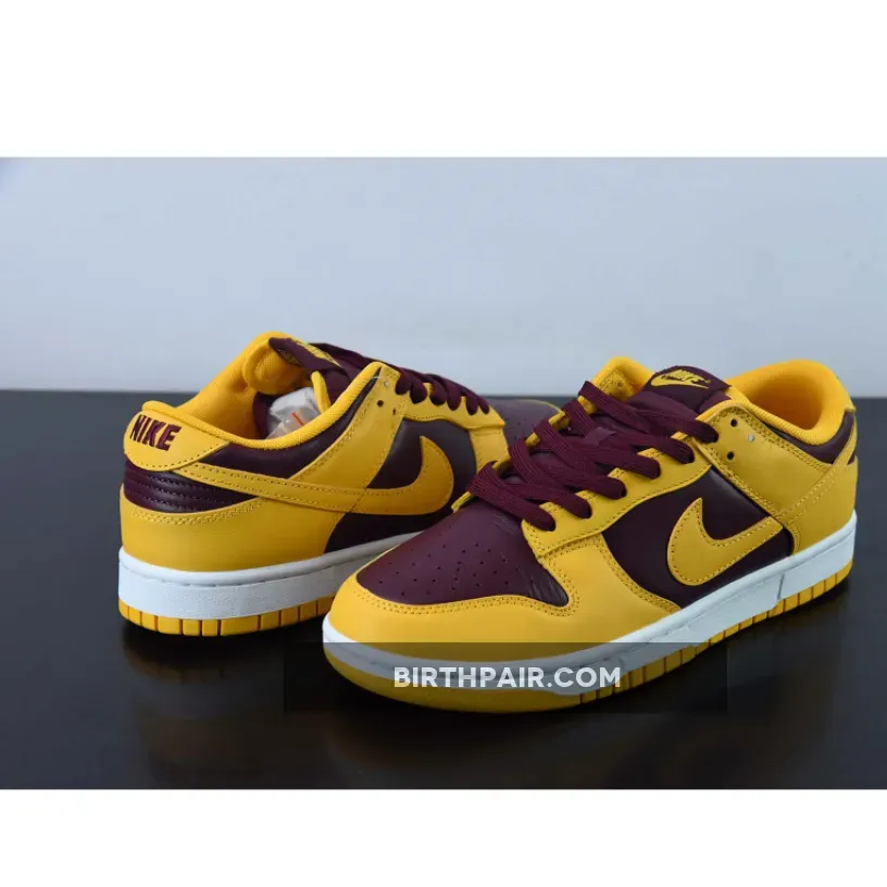 The latest Nike Dunk Low “Arizona State” draws inspiration from the Adidas-sponsored university and features a striking Sun Devil color palette. The Sun Devil-themed university colors of gold, white, and deep maroon are featured on the Nike Dunk Low “ASU.” Vibrant gold contrast takes over panels around the toe, along the tongue and across the heel, with profile swooshes and other accents on the Nike Dunk also indulging in the regal tone.