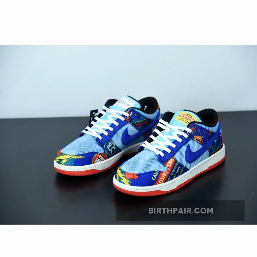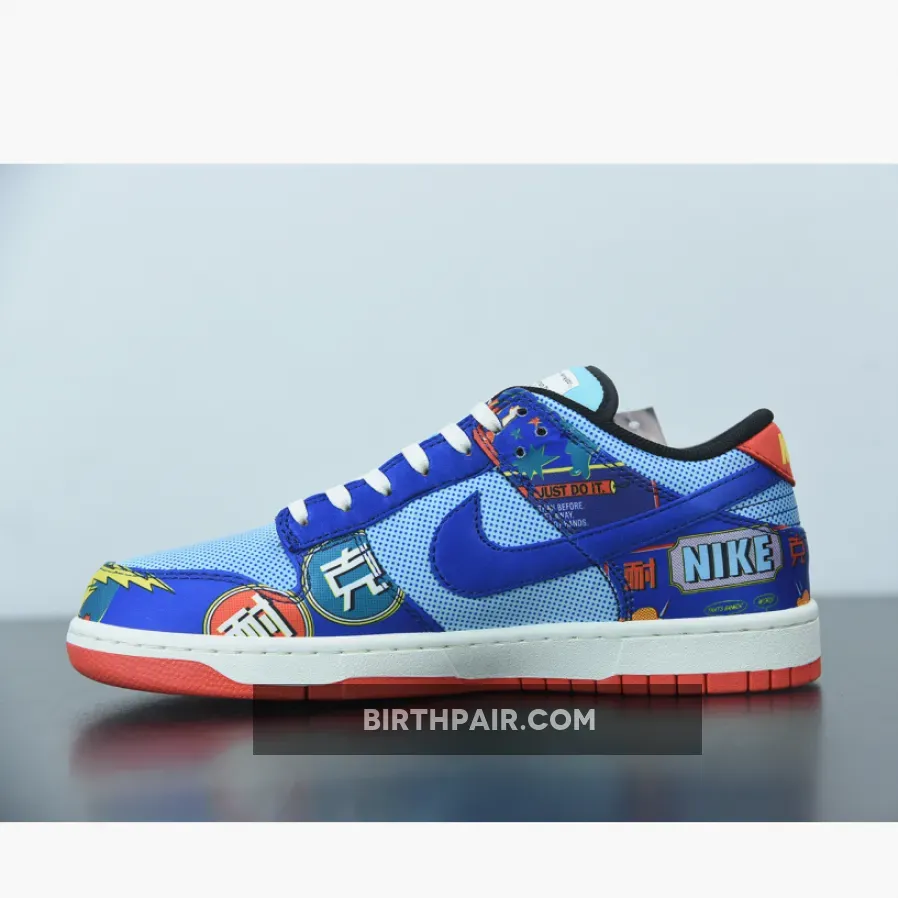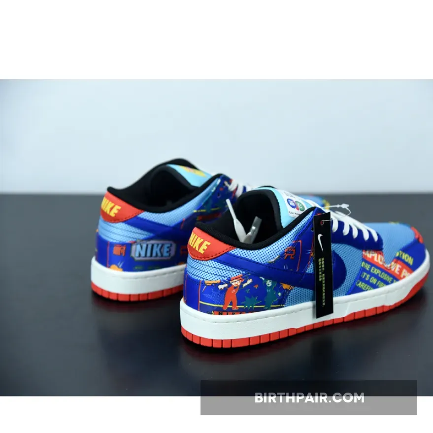 The Nike Dunk Low Firecracker pays homage to a staple found in most New Year celebrations, the firecracker. The sneaker’s upper is composed of an abundance of loud graphics. The blue leather upper shows off words like “BANG!” and “WARNING”, mimicking similar advertising found on firecracker packaging. Dot-patterns cover each aqua-colored leather panel and flat cream laces complete this special edition.