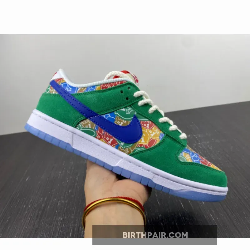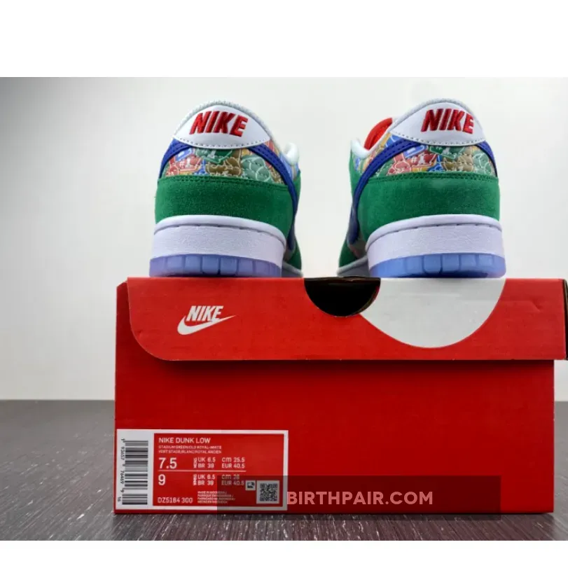 The Nike Dunk Low ‘Foam Finger’ showcases an all-over design inspired by sports fandom. Braided rope laces secure the leather upper, featuring a jumbled print made up of multicolor foam fingers. A royal blue leather Swoosh cuts across the side panel, while suede overlays in Stadium Green reinforce the forefoot and heel. Contrasting pops of University Red make their way to Nike branding hits at the tongue and heel tab. Anchoring the sneaker is a crisp white midsole, fitted with a lightweight foam wedge and bolstered by a translucent rubber outsole.