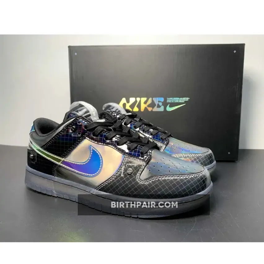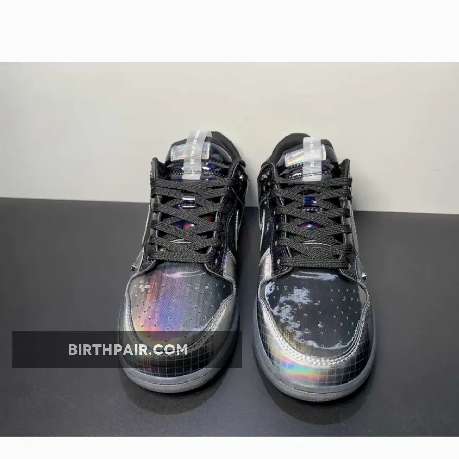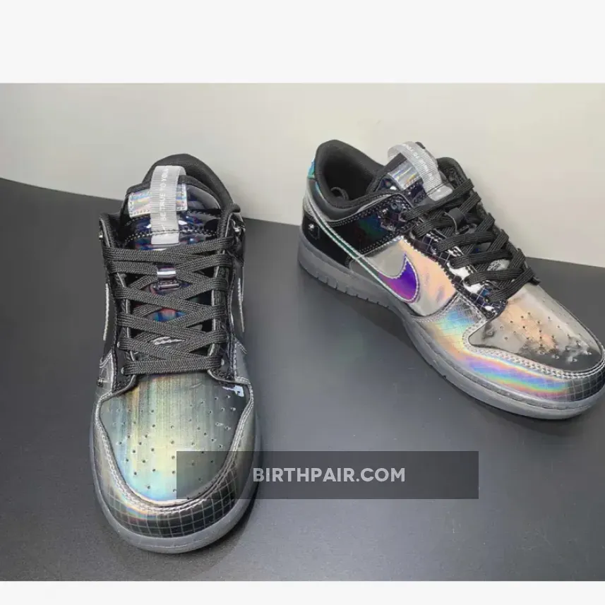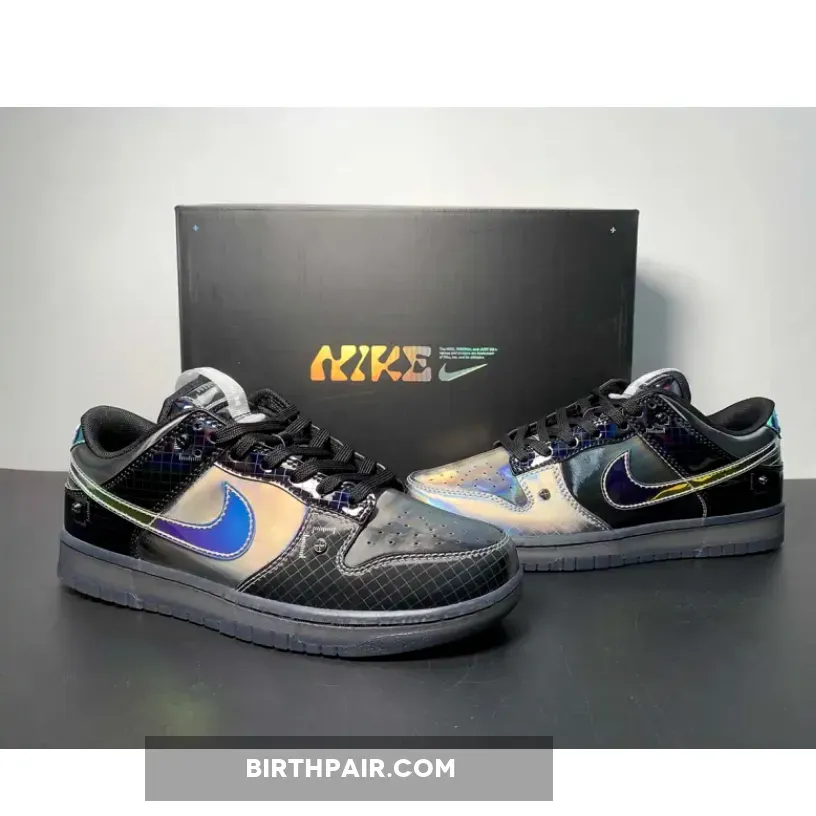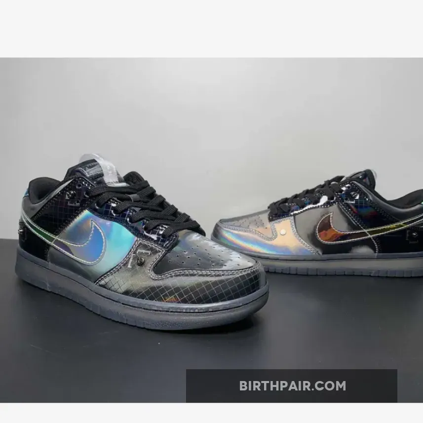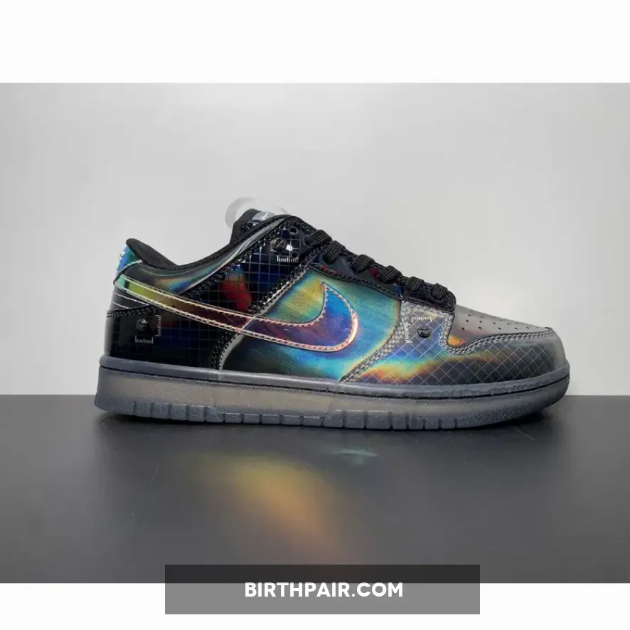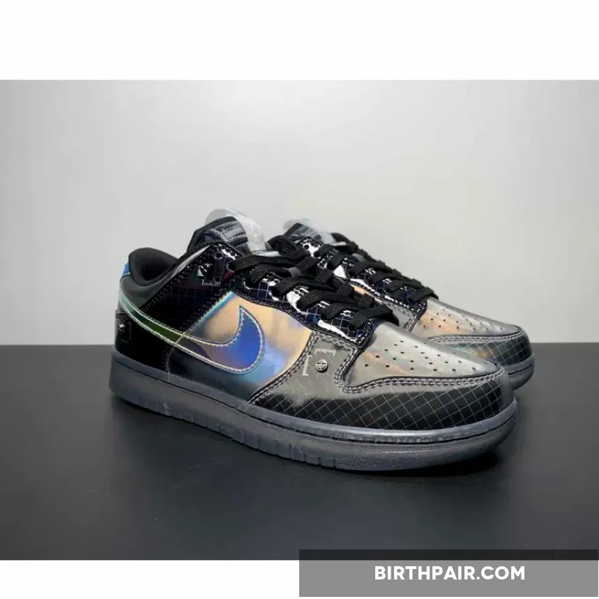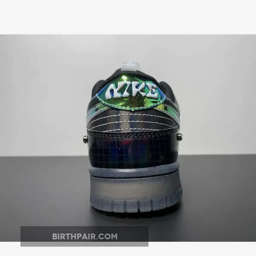 Nike is launching a second iteration of the Dunk Low “Hyperflat”, featuring darker, grey-scaled approach. The gridded pattern at the toe-guard captures that gun-metal hue, contrasted by the pitch black lace collar and heel — but off-set by a slightly oily finish. The Swoosh and heel tab, in particular, boast a reflective gloss that adds a touch of allure. The font choice blends nostalgia with a hint of retro-robotic aesthetics. Completing the overall look are the tongue pull-tabs, Phillips-head rivets, and a smoke-grey transparent outsole.