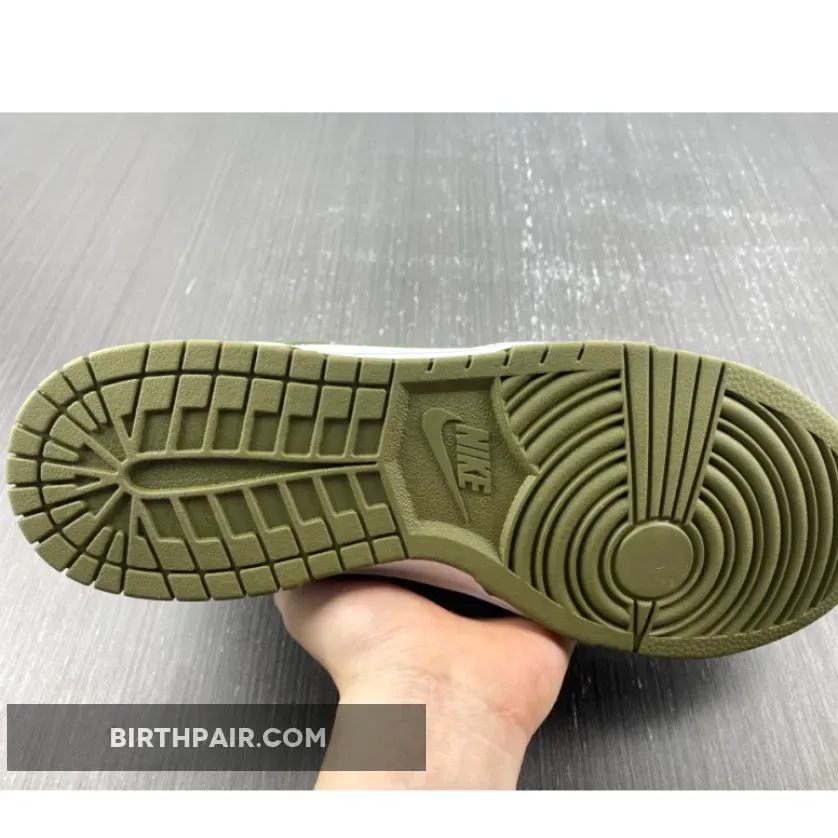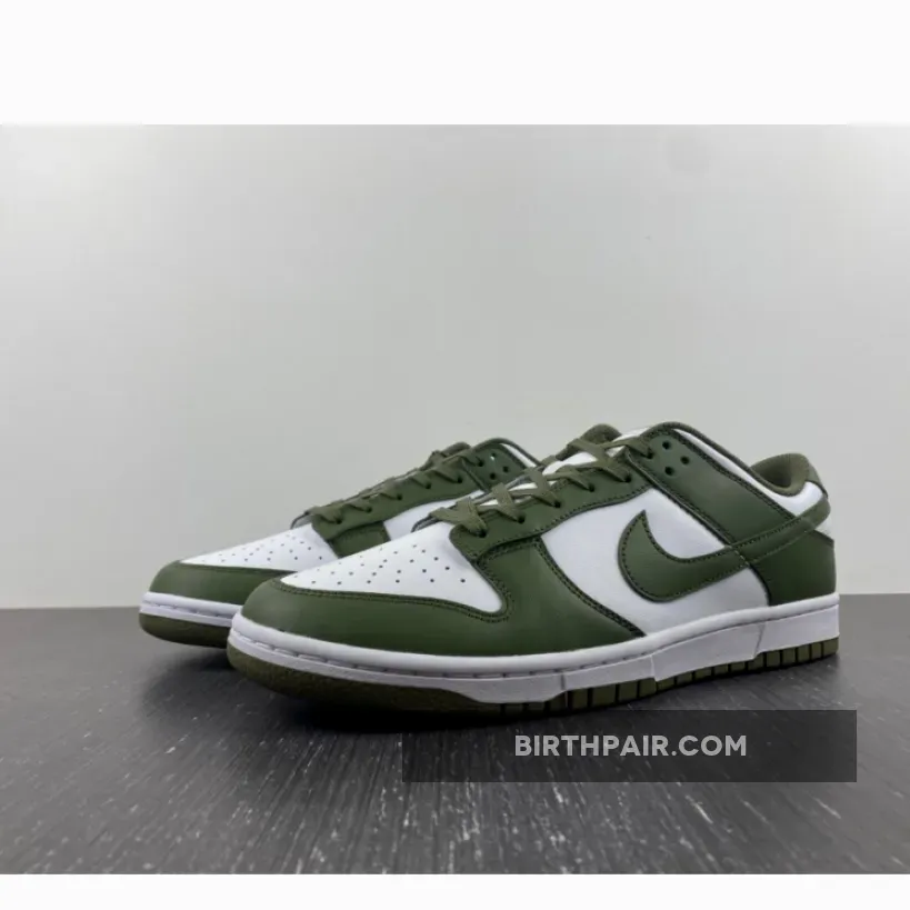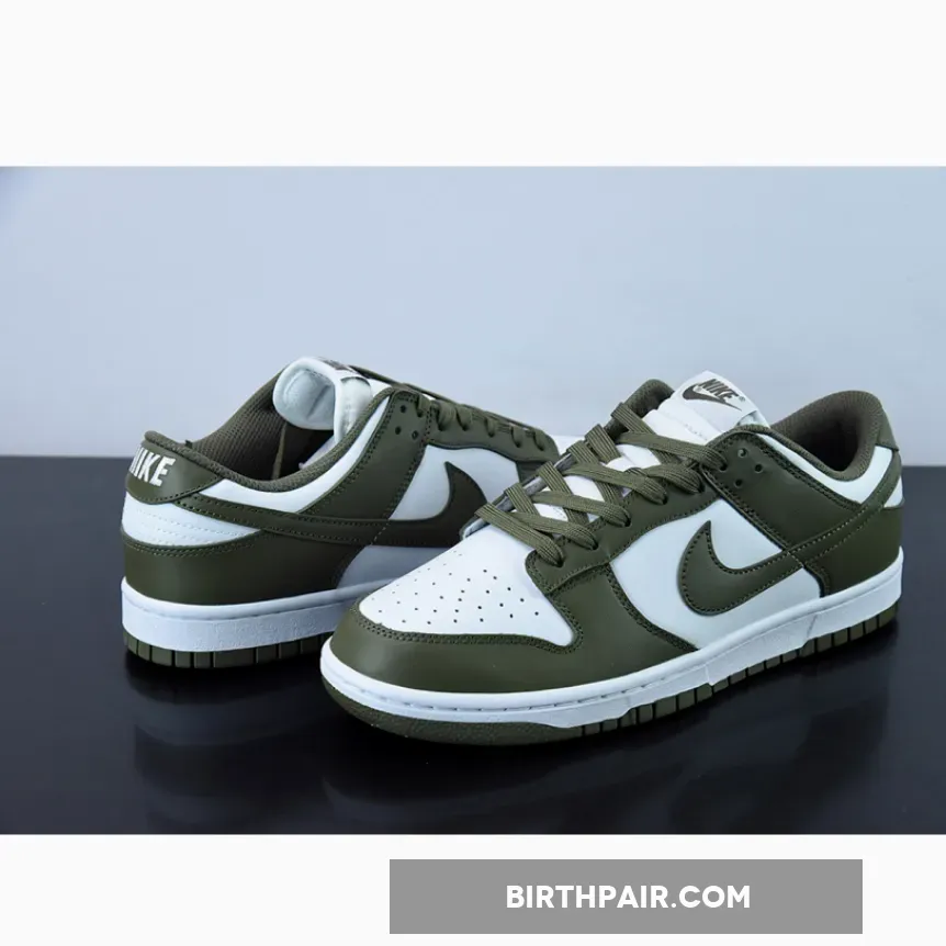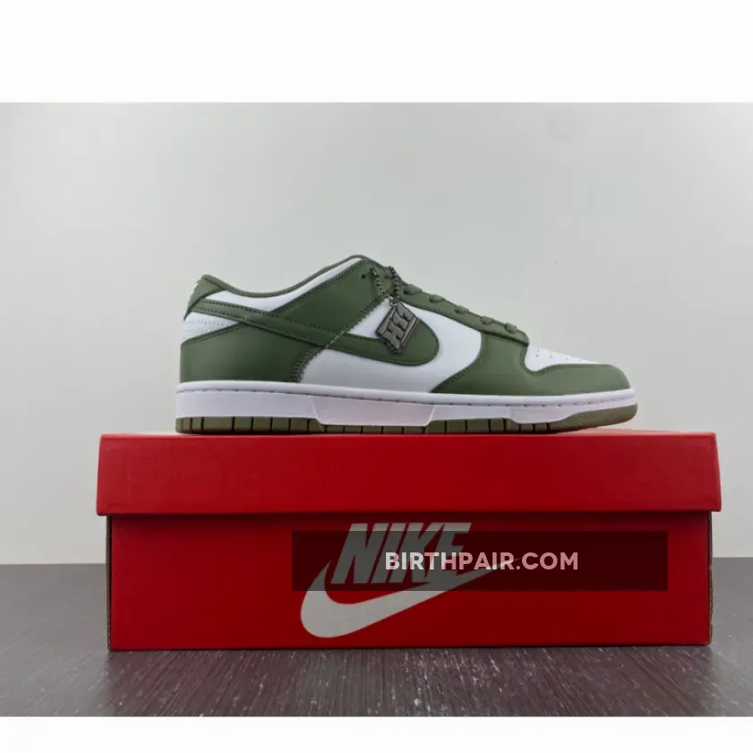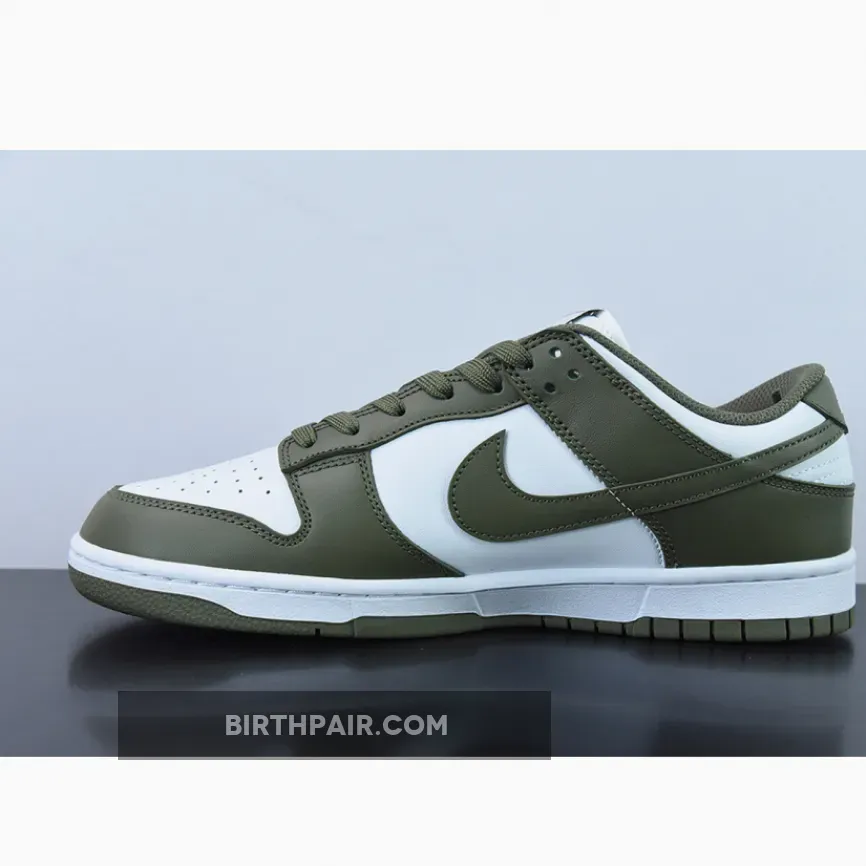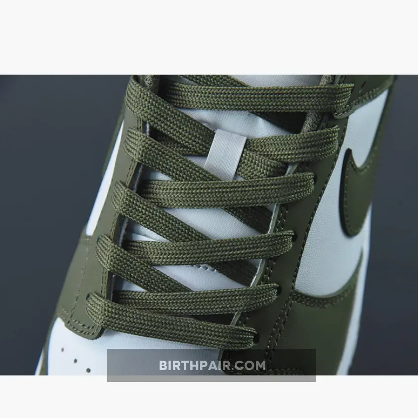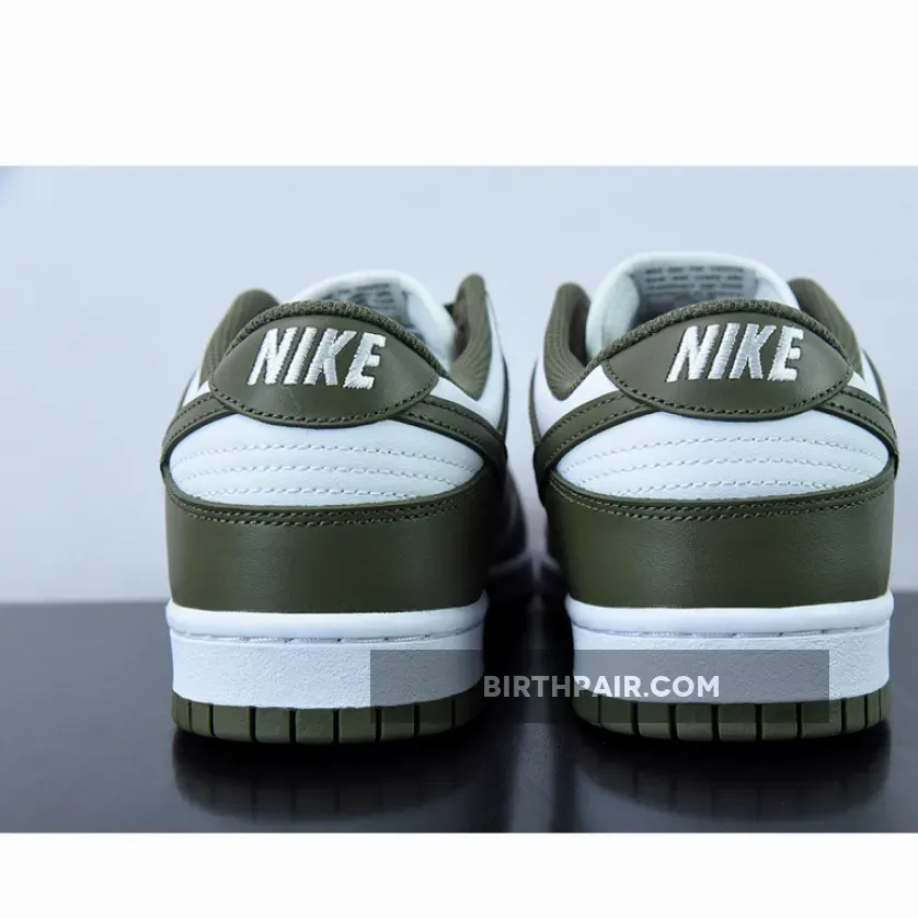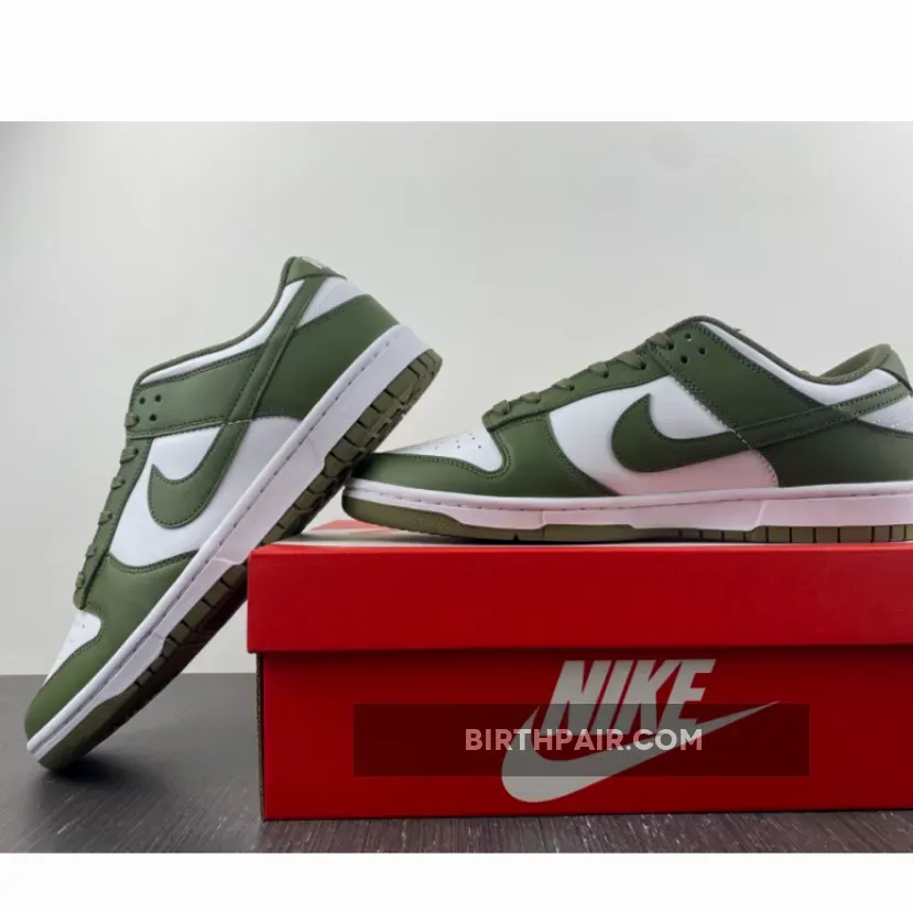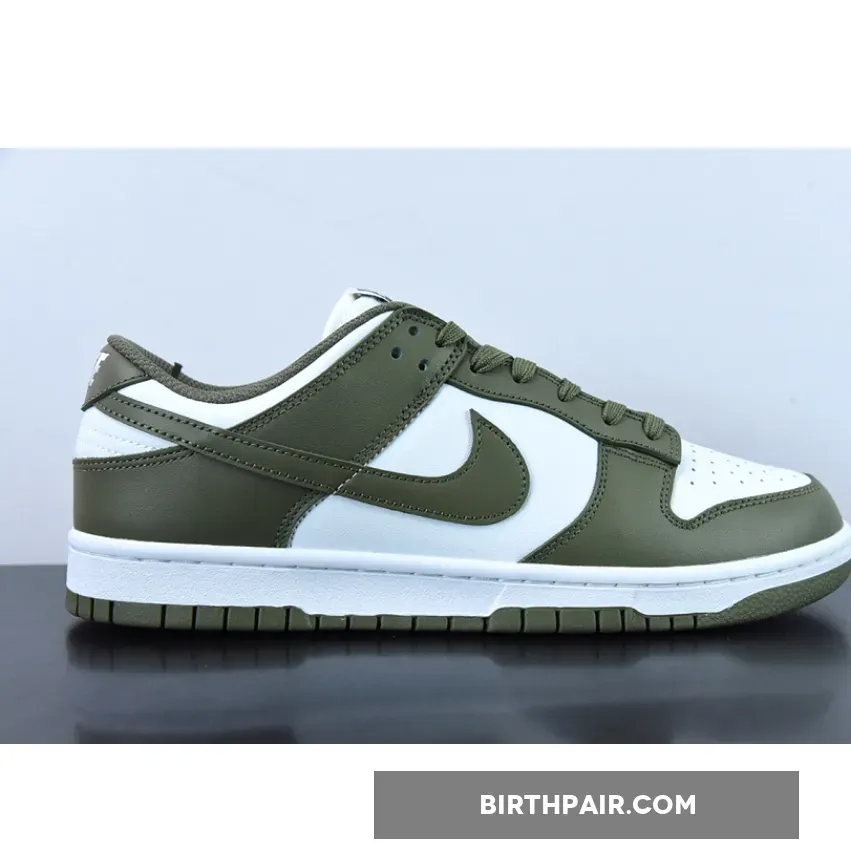The Nike Dunk Low Medium Olive W dresses the archival hoops shoe in traditional two-tone color blocking.