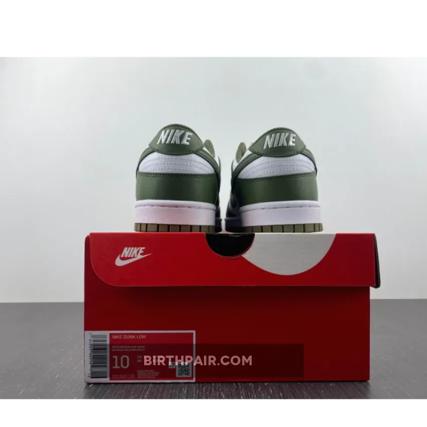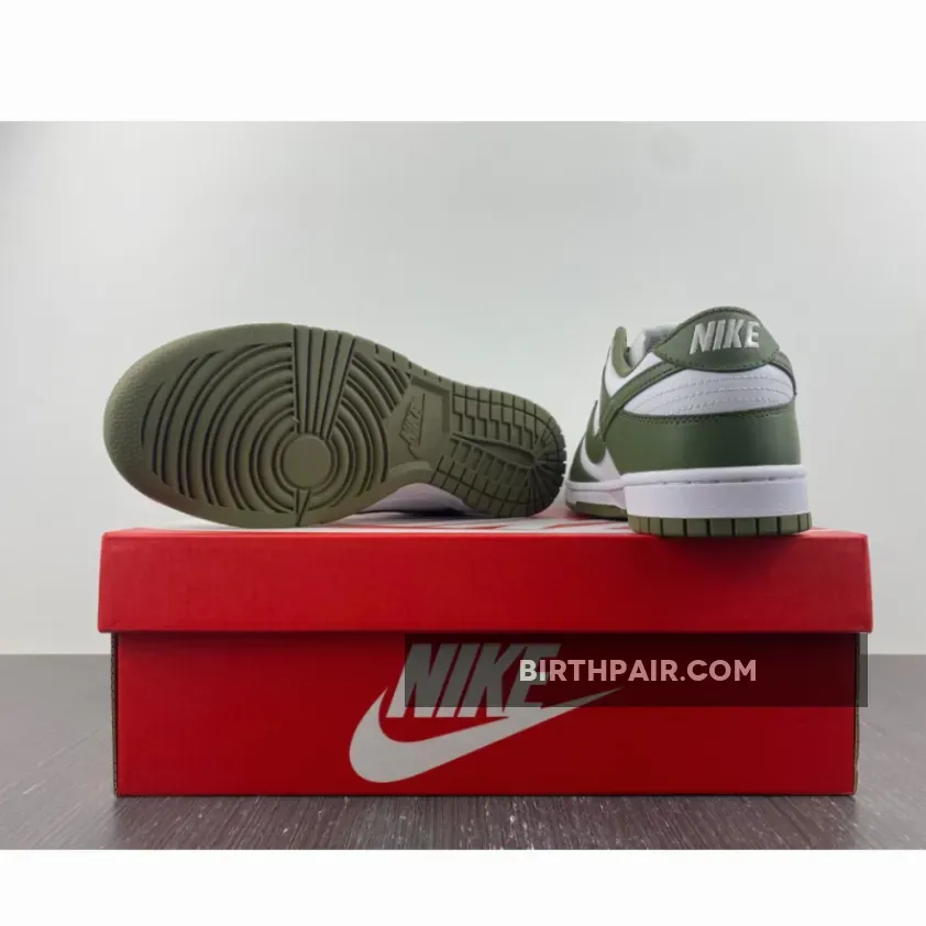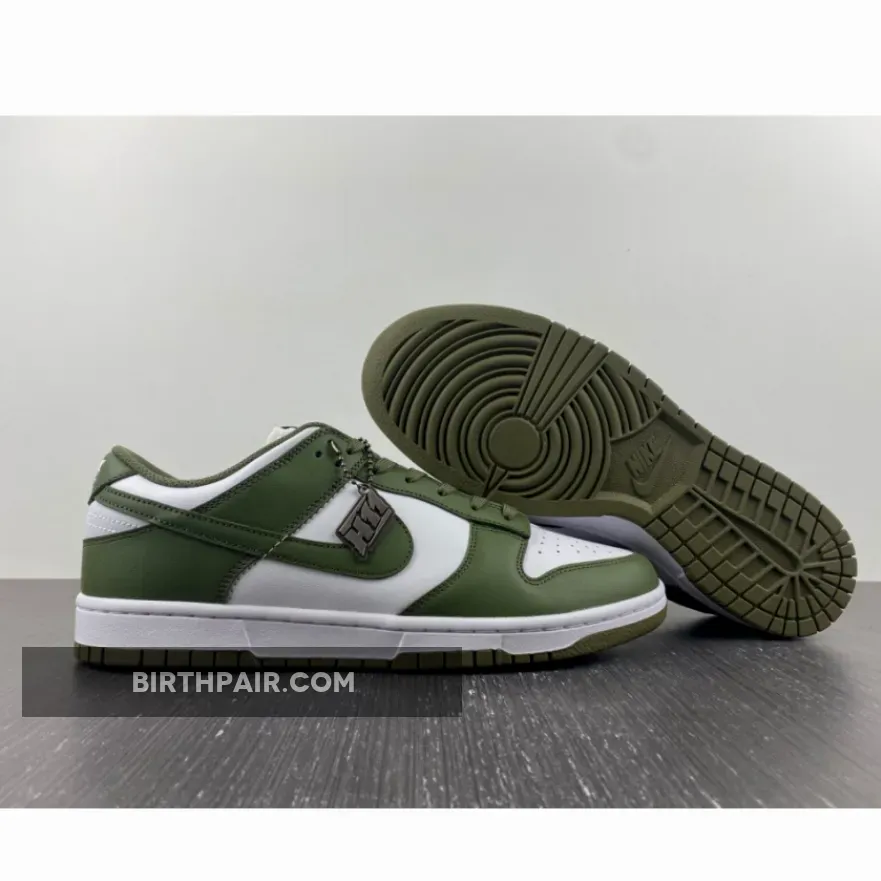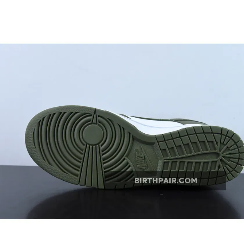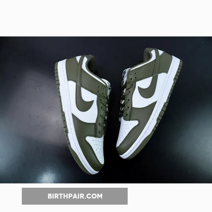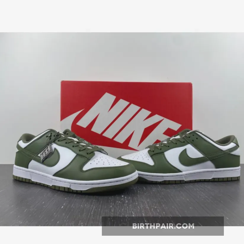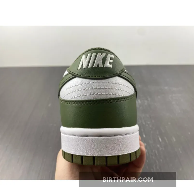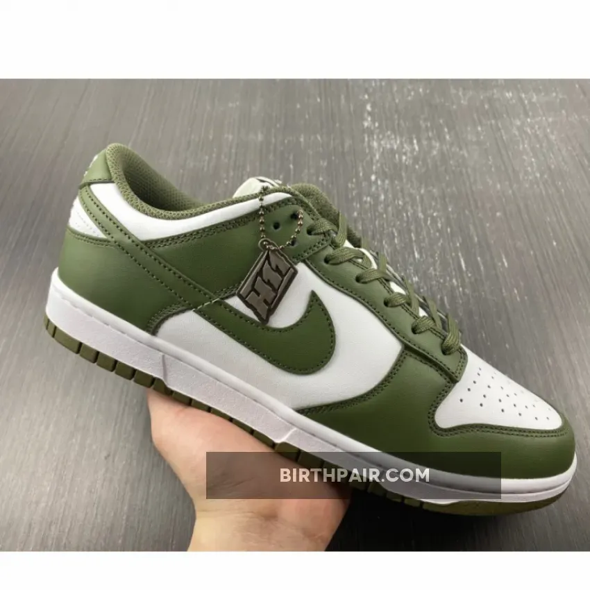 The Nike Dunk Low Medium Olive W dresses the archival hoops shoe in traditional two-tone color blocking.
