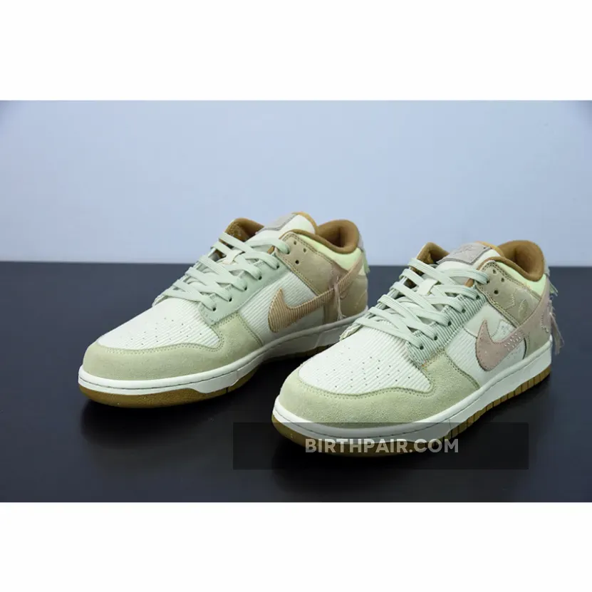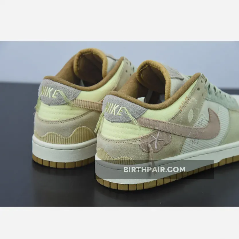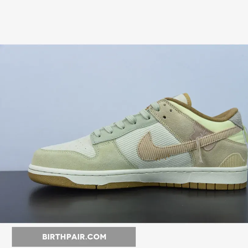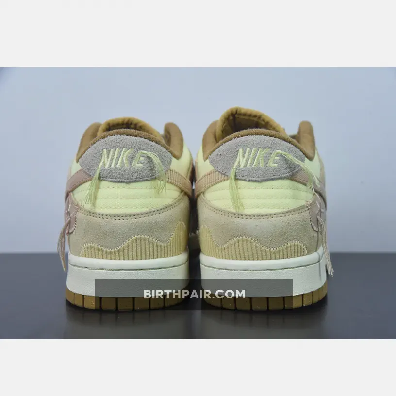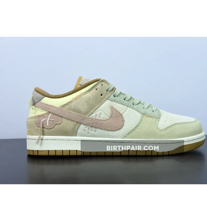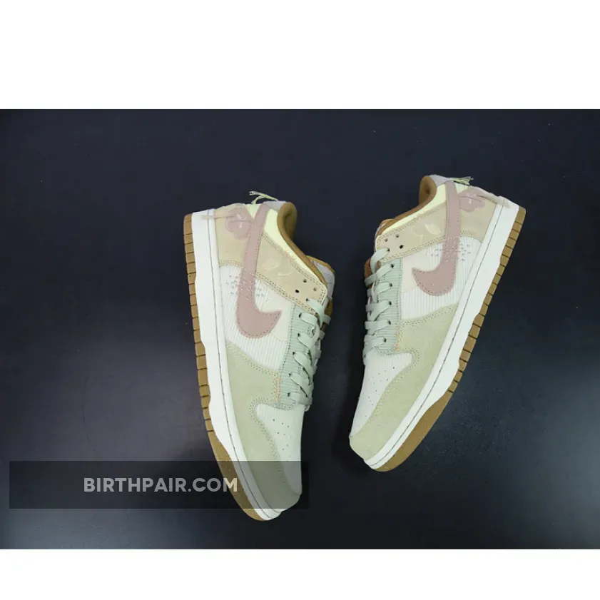 The new Nike Dunk Low experiments with materials and dons pretty pastels. Make the acquaintance of the Nike Dunk Low Bright Side.The base of the upper is a corduroy-like ribbed material showing on the toe box and the quarter. The overlay on the toe cap is suede in a beige-grey hue, matching the ribbed material eyestay panel and the laces. The foxing is also suede but in a darker tan. The suede heel tab is a light lavender colour. The signature profile Swooshes on the lateral sides are canvas in a lavender colour with a smattering of embroidered accents in the same colour marking the Swooshes midway. The swooshes on the medial side are pink in the ribbed material similar to the base but in lavender. Brown denim twill piping lines the cream tongue and the collar.