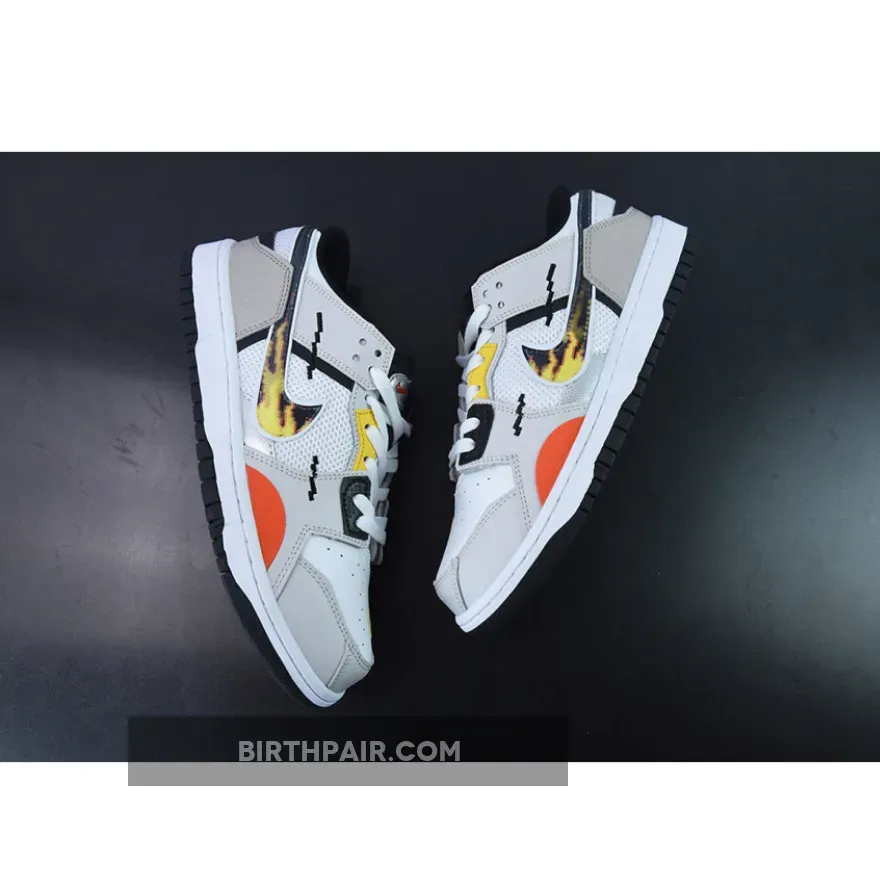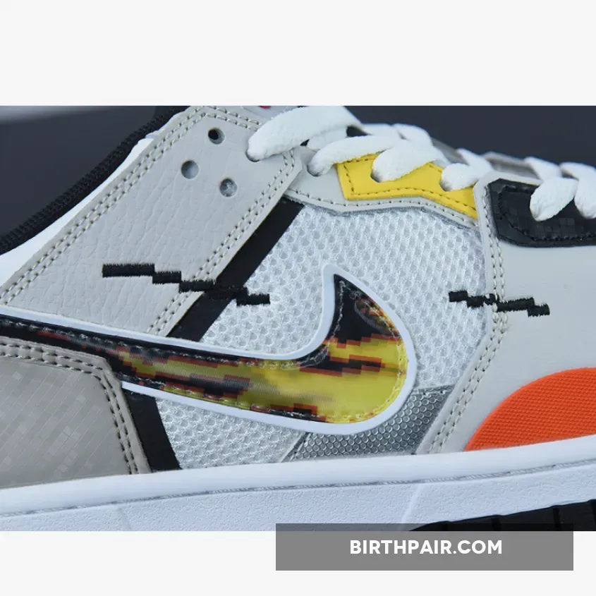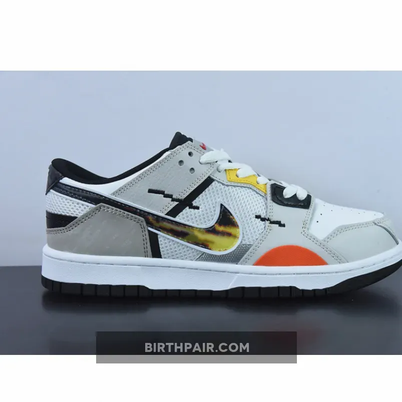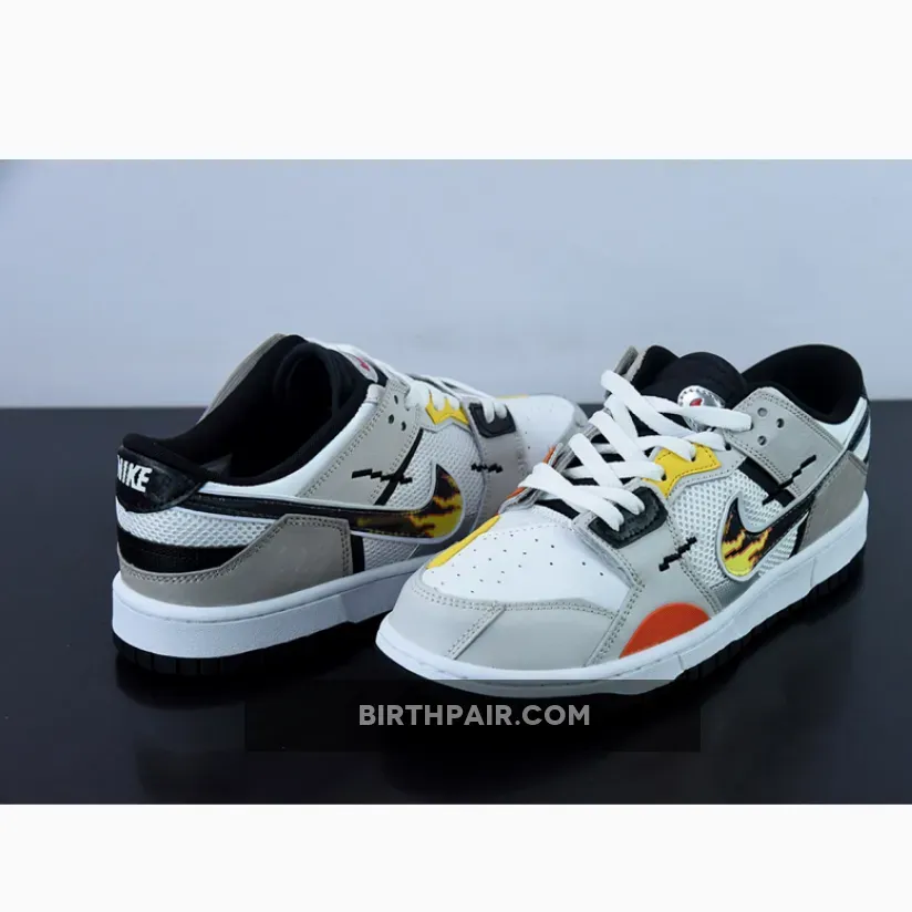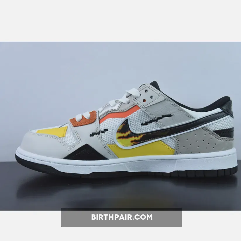 The anime-inspired “Mighty Swooshers” x Nike Collection gains a new addition with this Nike Dunk Low Scrap. Noted in grade school sizing, this Nike Dunk Low Scrap features a predominantly White and Grey color combination of mesh and leather with design highlights including 8-bit stitching, flame Swooshes, Silver tongue plate with Red Swooshes, and “The Battle of Dimension Six” and “Nike And The Mighty Swooshers” printed on the insoles. Finishing details include black, orange, and yellow accents throughout, white rubber midsoles, and black rubber outsoles.