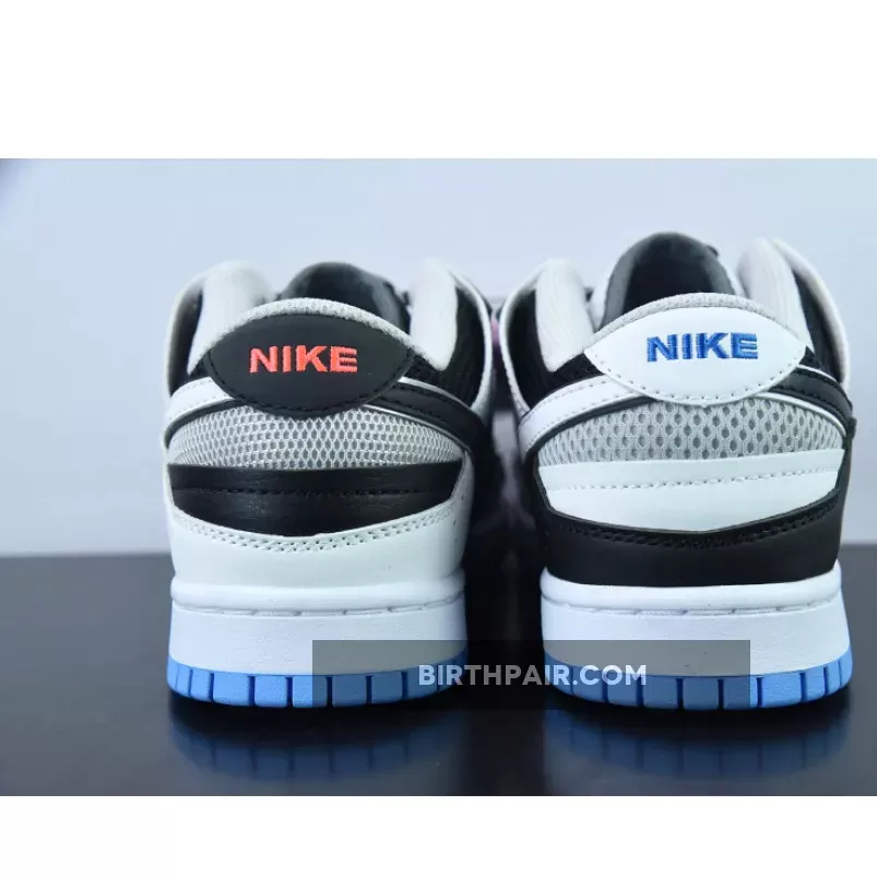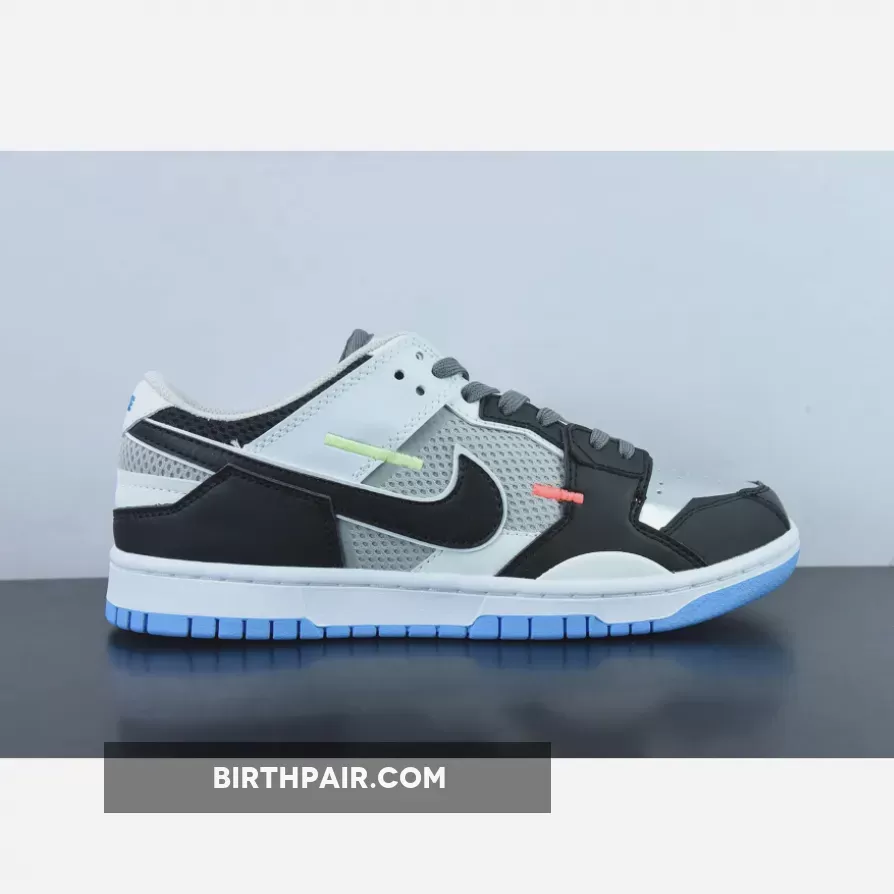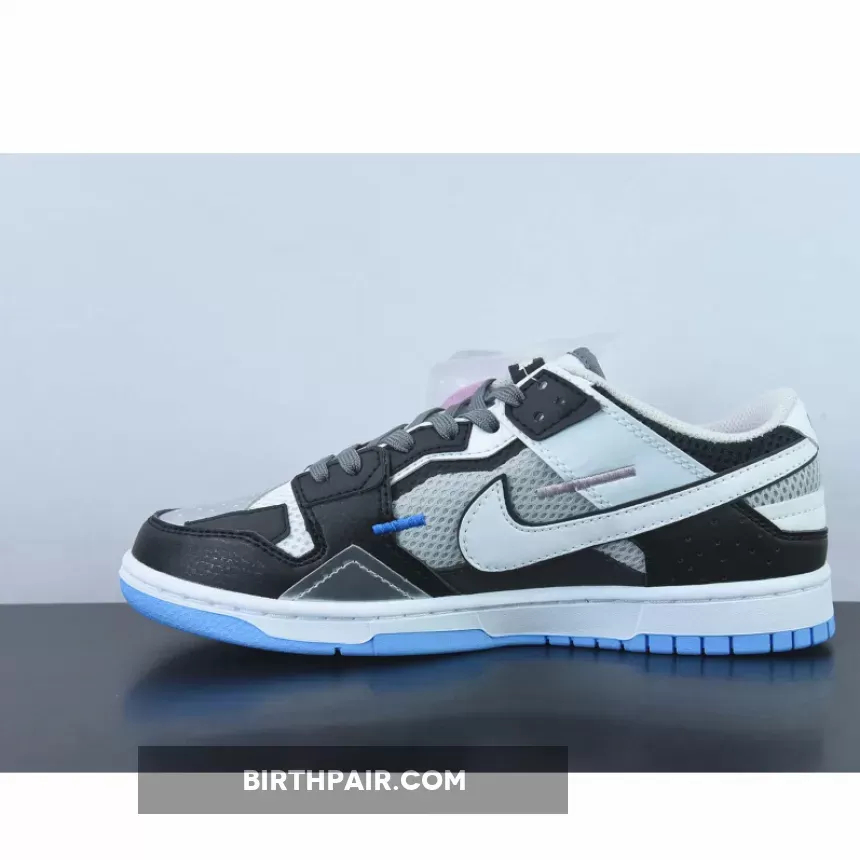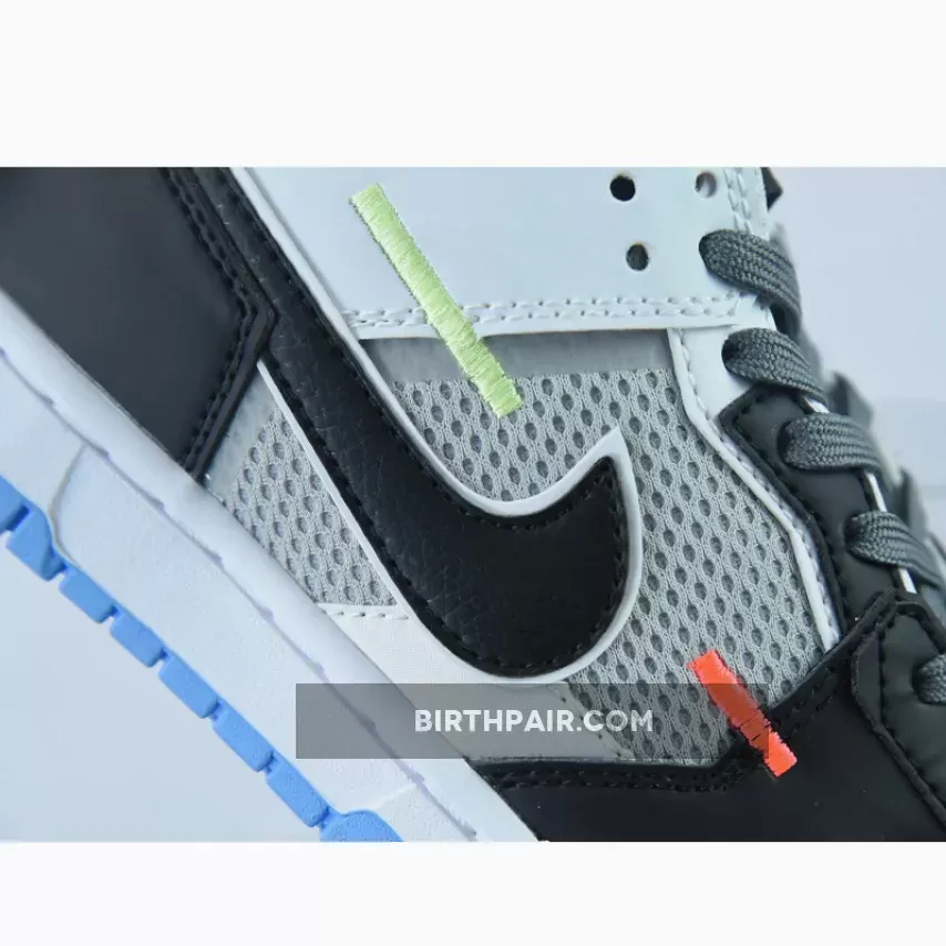 Scraps never looked this good. Introducing the Nike Dunk Scrap Mismatch White Black. This piece revels in a stylish deconstructed look with an edgy flair. The upper features a symphony of materials: breathable black mesh for the side panels and rugged leather for the perforated toe box. On top, smooth black and white leather overlays overlap with each other to create a cool layered look. Adding colour to the pair are the blue and pink stitches placed near the quarter windows. Furthering its mismatch theme are the Nike Dunk brandings at the heel tab — blue for the right and red for the left.