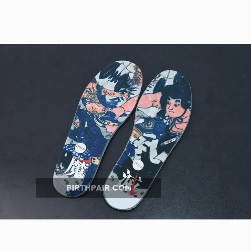 Going over this Nike Dunk Low, it comes highlighted with Light Brown across the base while Khaki and Dark Brown cover the overlays. Adding pop, Purple hits the Swoosh logos, tongue, and liner while a ‘demon’ is embroidered on the lateral heel. White adorns the midsole with a semi-translucent outsole that displays artwork from the late Edo period (1840s) by Utagawa Kuniyoshi titled 金時の節分. Shown is a bean-throwing child hero known as Kintarō, who will grow up to be the mighty warrior Sakata Kintoki, one of the retainers of the famous demon-fighter Minamoto Yorimitsu (Raikō).