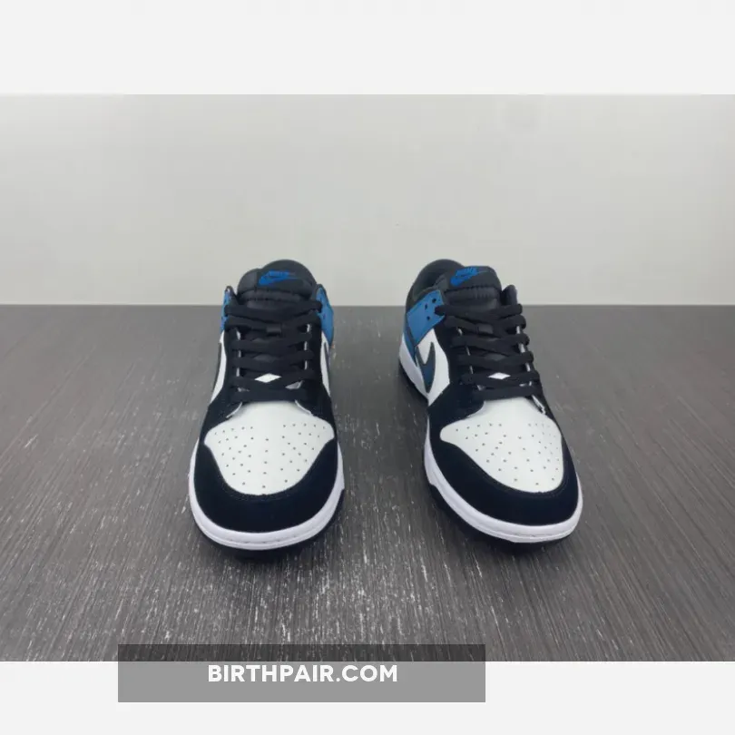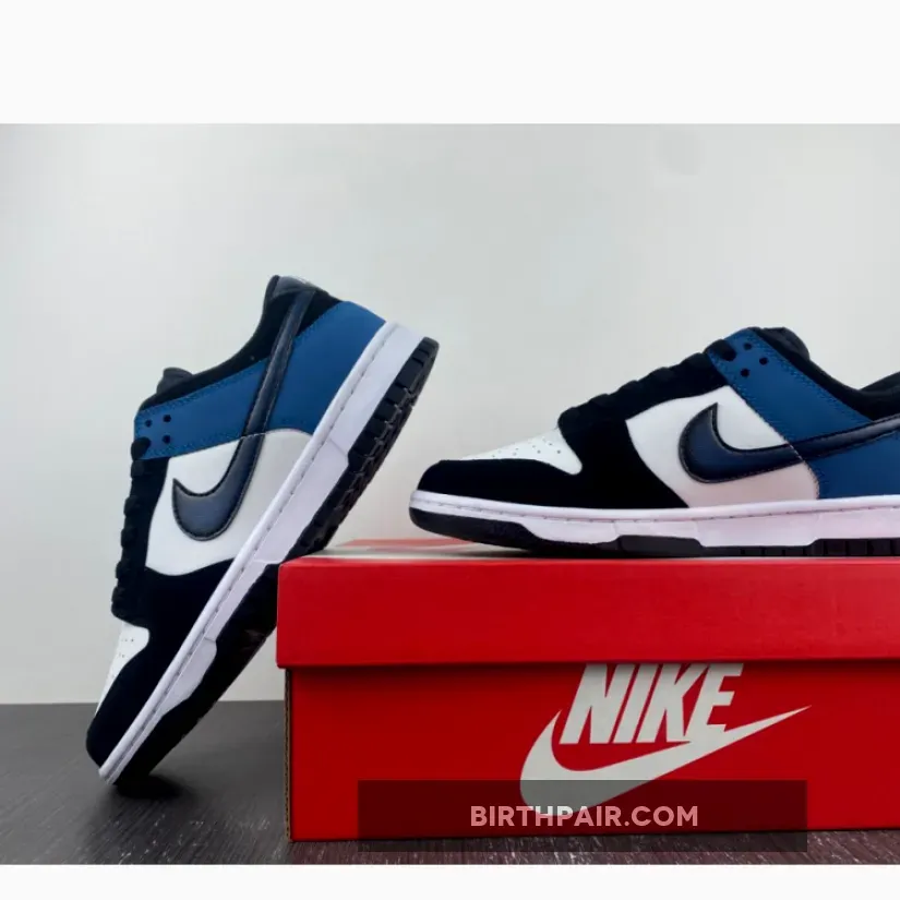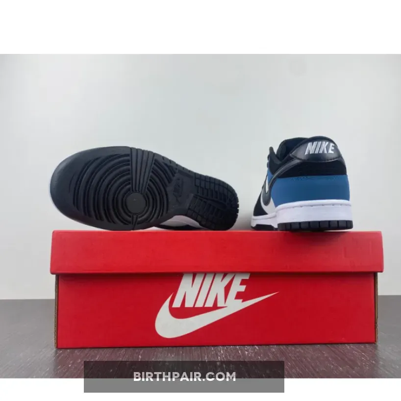 This Nike Dunk Low Industrial Blue opts for a mixed material upper. It starts off with a White leather base that’s then offset by the Black nubuck overlays as well as the Industrial Blue overlays.