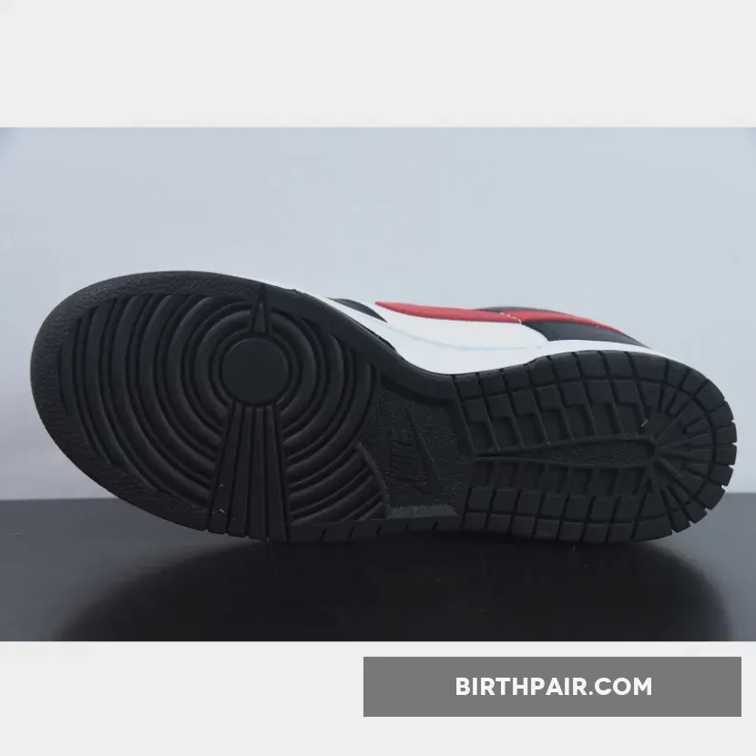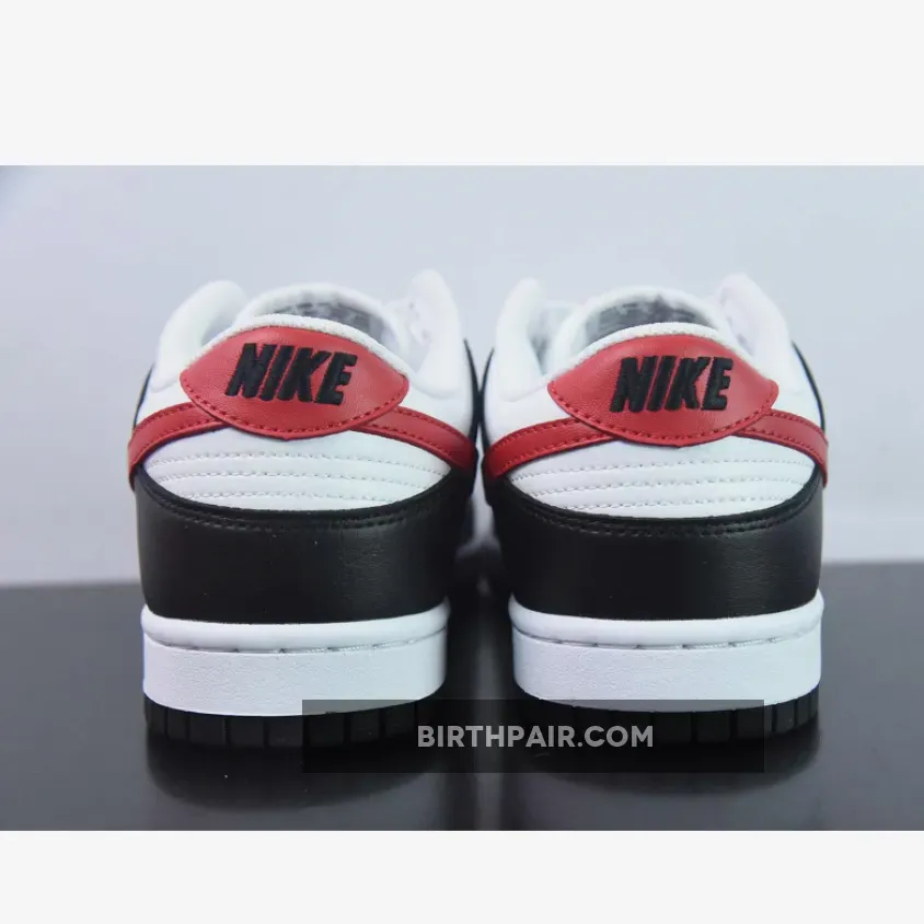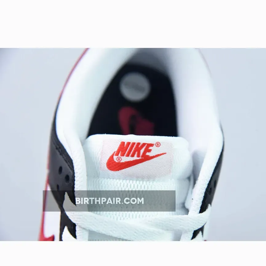 It’s here where the pair begins to deviate from the two-tone “Panda” scheme, with striking red flashes provided by Swoosh and heel overlays, as well as branding at the tongue. This same red repeats on the heel tabs with Nike text branding embroidered in black. Classic red Nike branding stands out on the white tongue tab and the black insole.