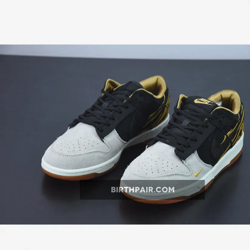 The Nike Dunk Low GS ‘God of Wealth’ celebrates the lunar new year with a China-exclusive release made for big kids. Nodding to the year of the tiger, amber stripes are embroidered throughout the rear portion of the upper, which is lined in gold satin and built with a combination of grey and black suede. A matching black finish is applied to patterned brocade fabric used on the eyestay, Swoosh and heel overlay.