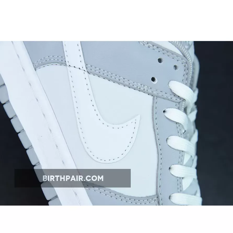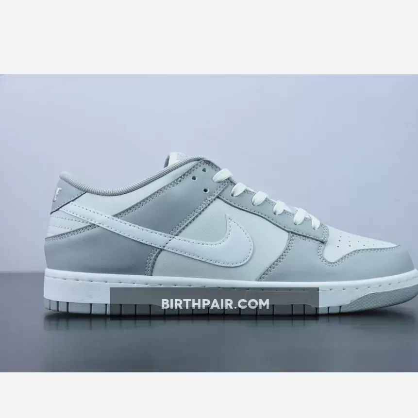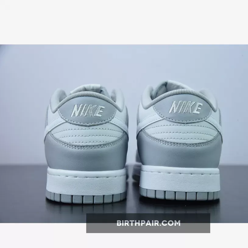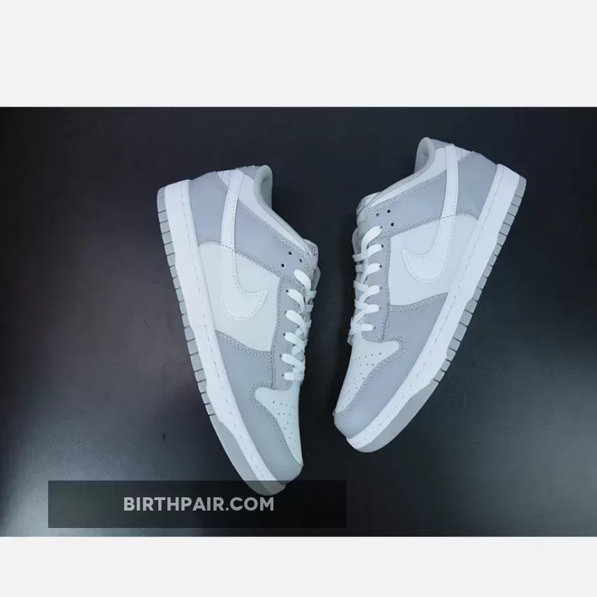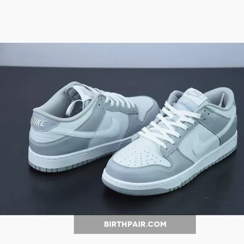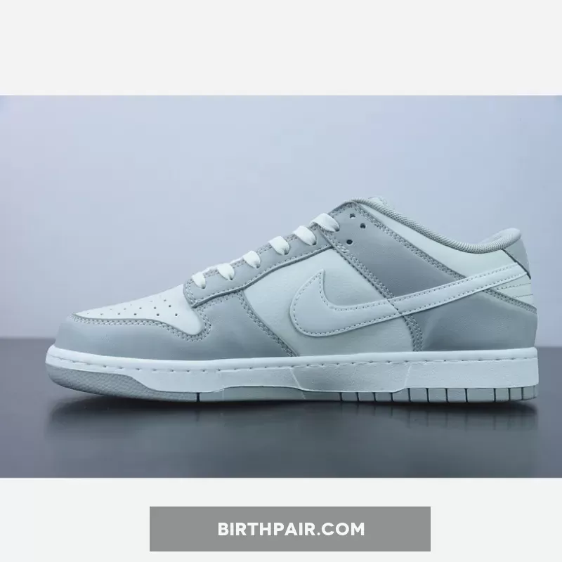A new Nike Dunk Low comes dressed in a cool two-toned colourway. Introducing the Nike Dunk Low Grey White.The base of this shoe’s upper is light grey tumbled leather on the toe box, the quarter and the heel. The overlays are smooth leather in a slighter darker grey on the toe cap, the mudguard, the eye stay panel and the foxing. This darker grey is repeated on the mesh sockliner. The profile Swooshes on the medial and lateral sides are a clean white, matching the laces. The tongue contributes to all the cool tones in an icy blue with grey piping.