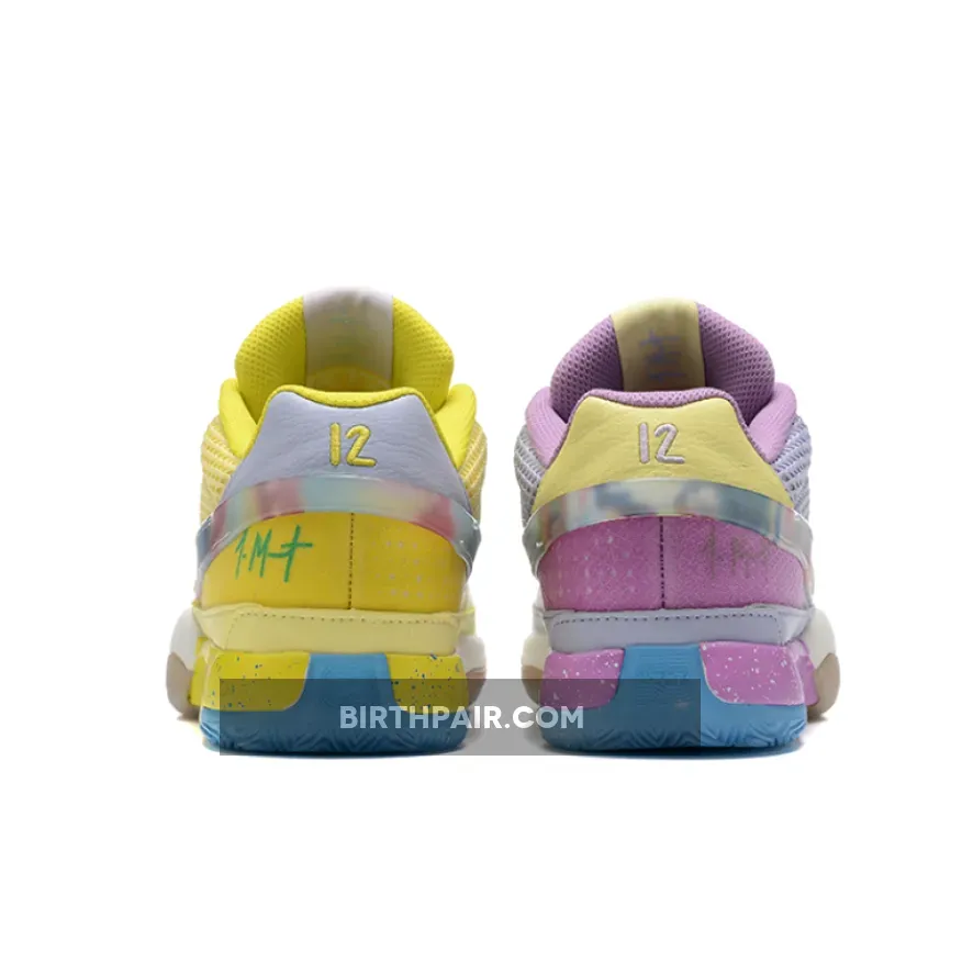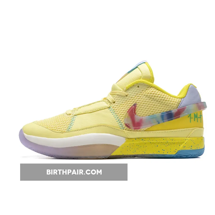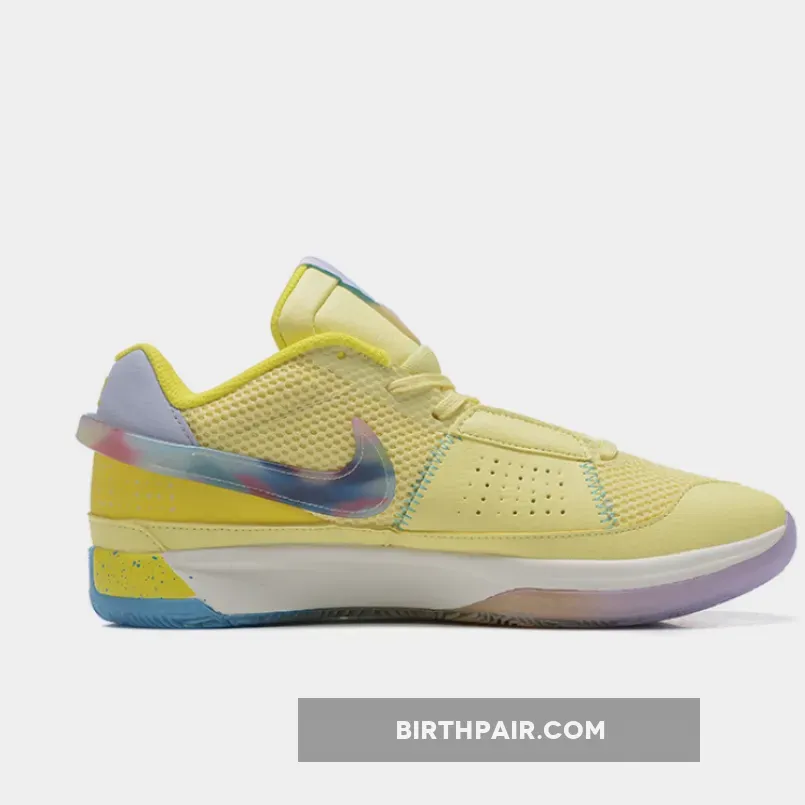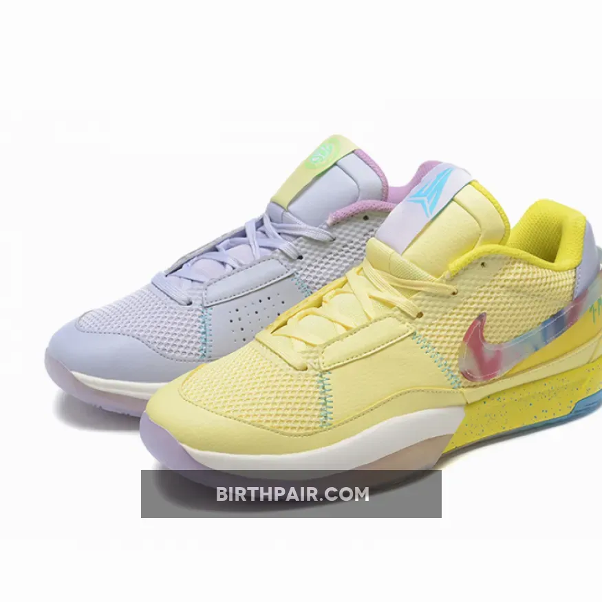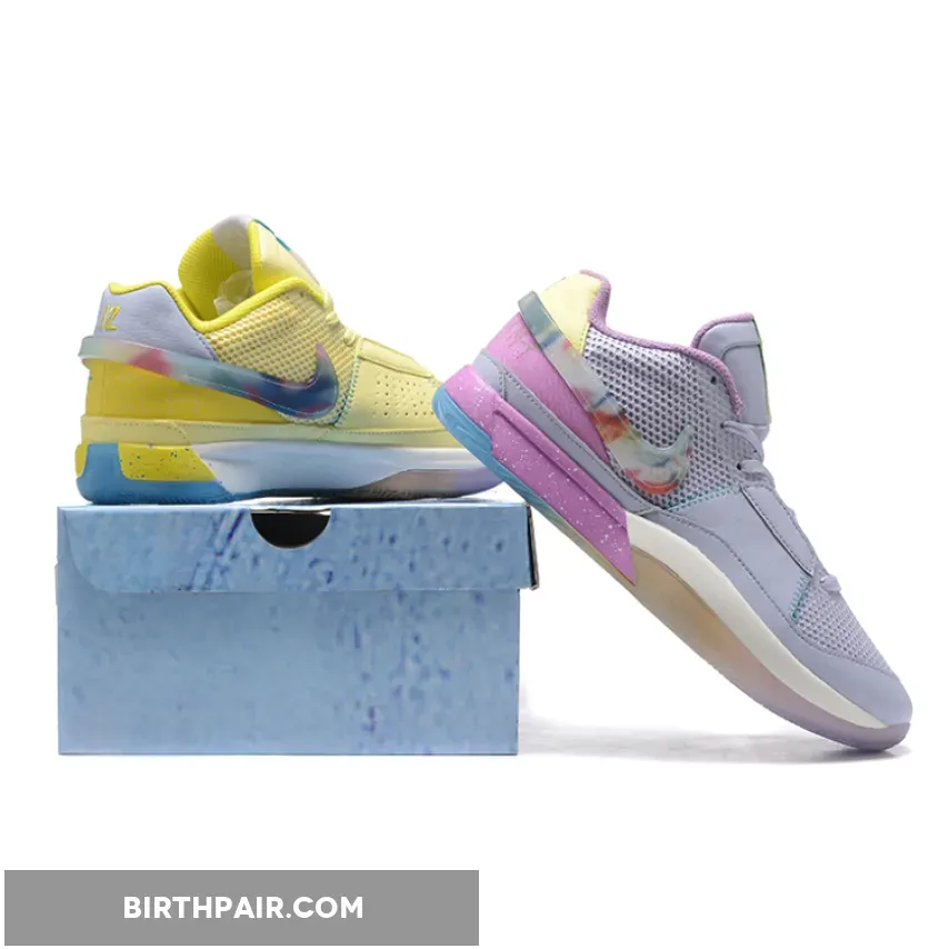 This offering of the Nike Ja 1 sports a Yellow hue dressing one shoe while the other comes in a Light Purple tone. Both pairs are given a mesh base alongside a reinforced midfoot and decorated with wrap-around graphic Swooshes. Elsewhere you will find the signature “Ja” branding with his number “12” on the heels, “EYBL” branded tongue labels and insoles atop a speckled mismatch midsole and translucent outsole.
