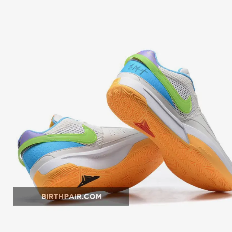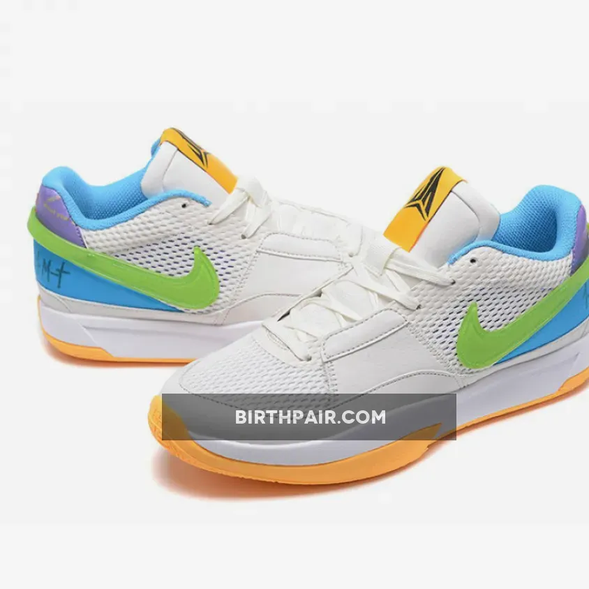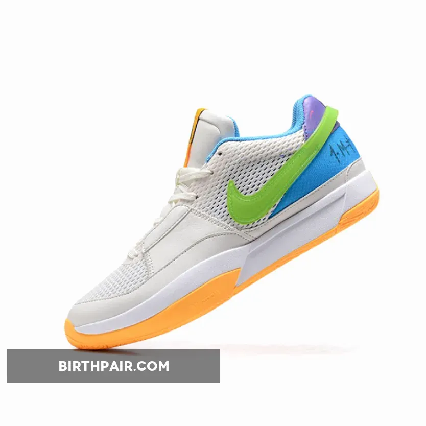 the shoe features an off white mesh and leather upper with bright hits of color hitting the green wrap-around Swooshes, tongues, inner liner, and heels. The highlight of this colorway is the series of questions seen on the heels and insoles. Ja Morant and Nike branding placed throughout, white midsoles, and yellow outsoles finish.
