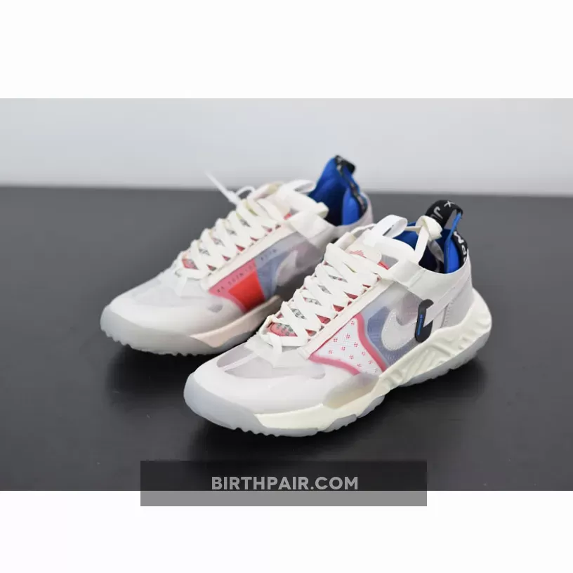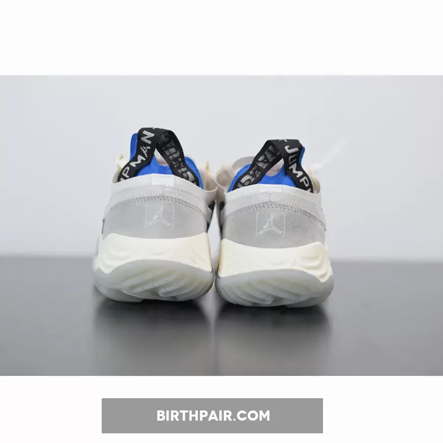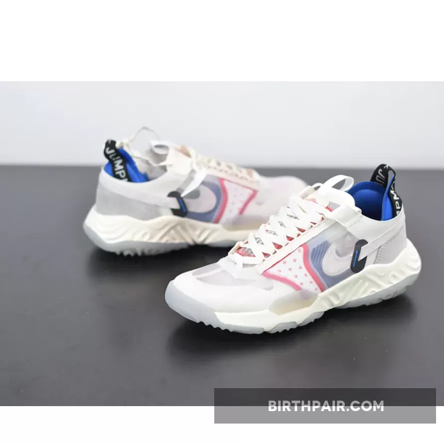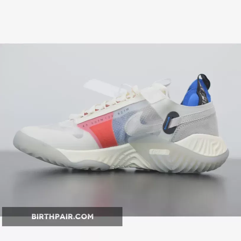 The Jordan Delta Breathe Tech White silhouette offers a slightly deconstructed departure from the original Delta SP and is much more reminiscent of the Nike React 87.As the sneaker’s name suggests, the Jordan Delta Breathe Tech White is focused on breathability and most of the shoe is constructed from semi-translucent overlays that protect a mix of textured materials like suede, cotton and mesh. The “Jumpman” branding is woven into a large ripstop pull tab that protrudes out from its blue heel support. Additional pops of blue hues are found at the sidewalls underneath the Tech White’s transparent coating where the main Swoosh is placed— the tail end of the logo sticks out from a black opening near the rear and wraps around the heel. All of these details combine to rest over a geometric React midsole that’s specially engineered for optimal comfort and support.