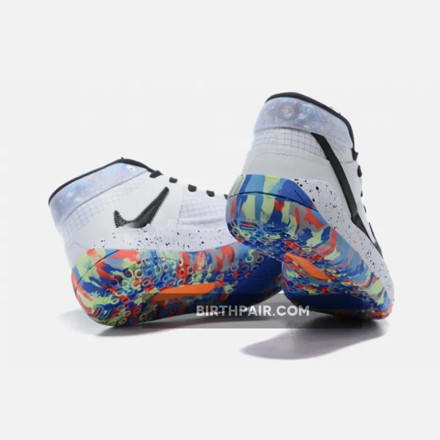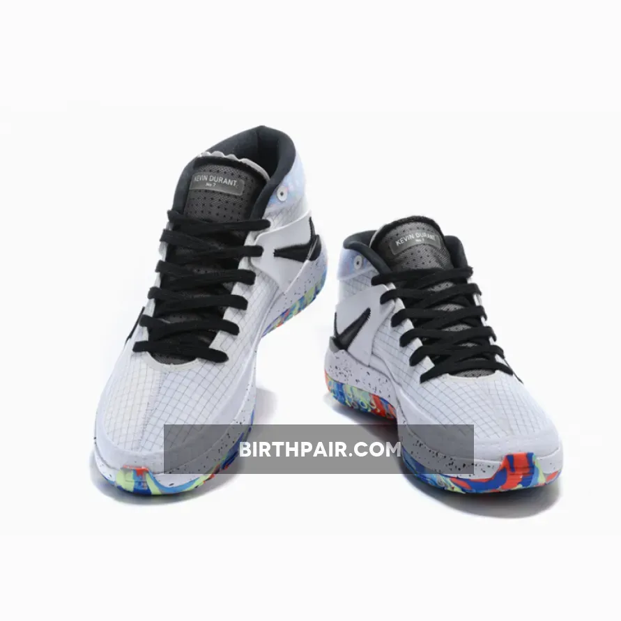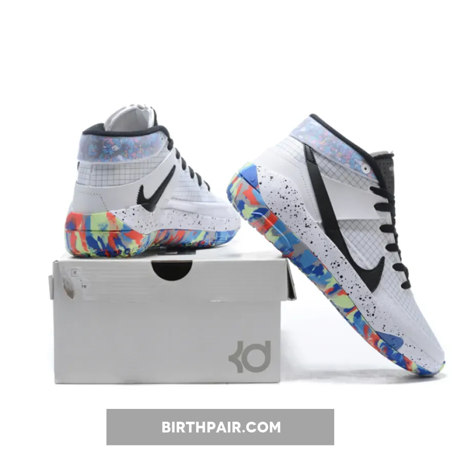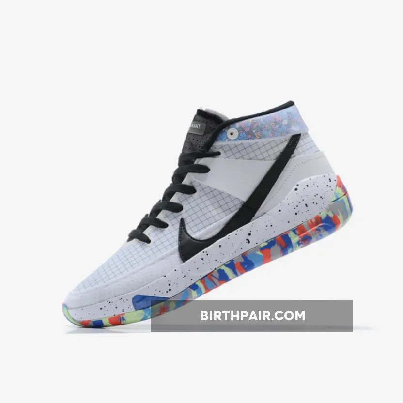 This Nike KD 13 comes dressed in a Multi-Color, Racer Blue and Smoke Grey color combination. Highlighted with White on the base while a Black grid runs across the base. The same shade then lands on the tongue, laces, Swoosh logo and speckled midsole. Completing the look is Multicolor camouflage graphic on the heel and rubber outsole.