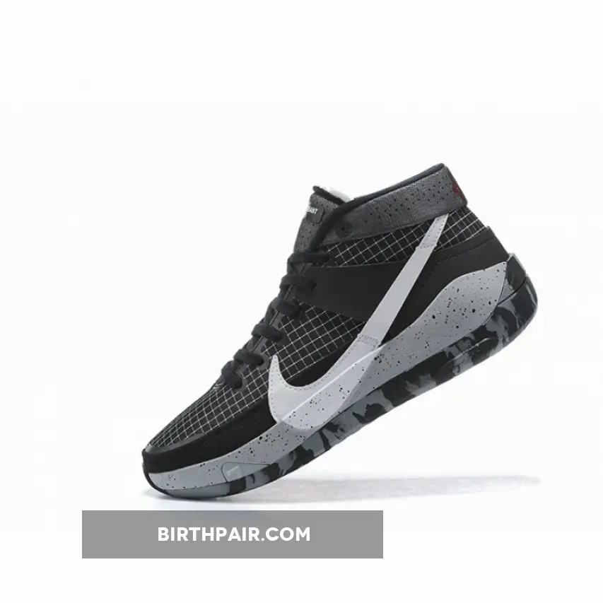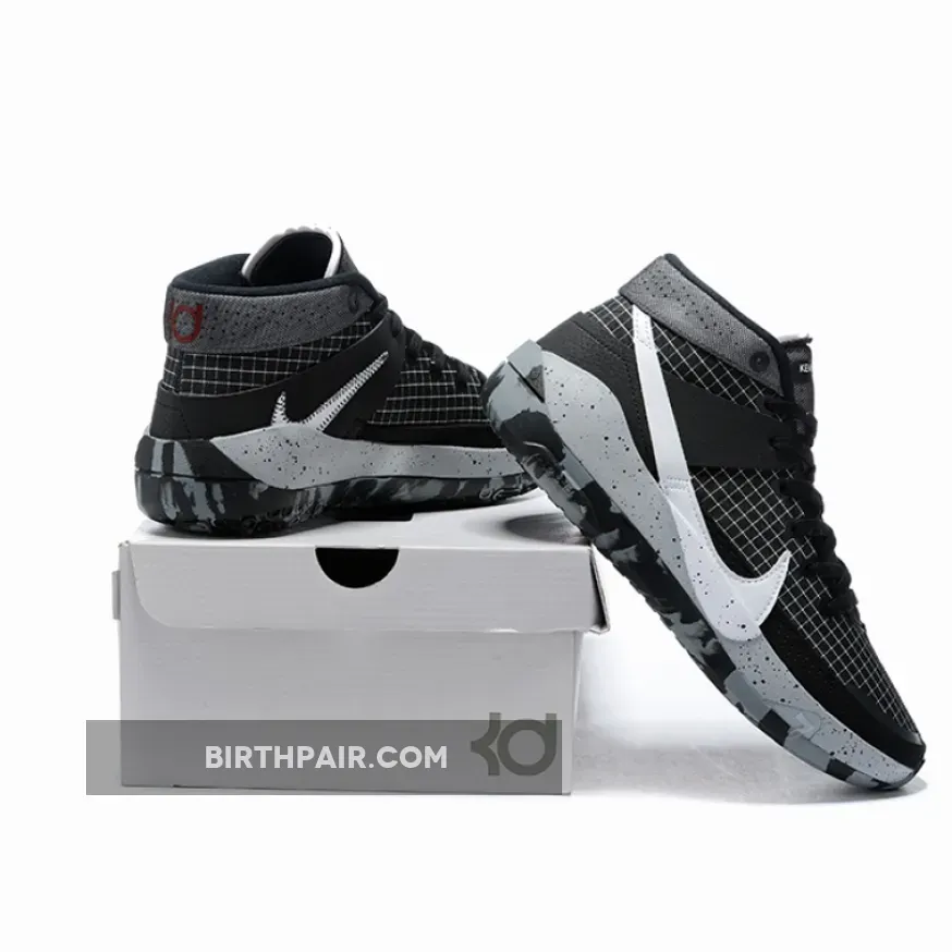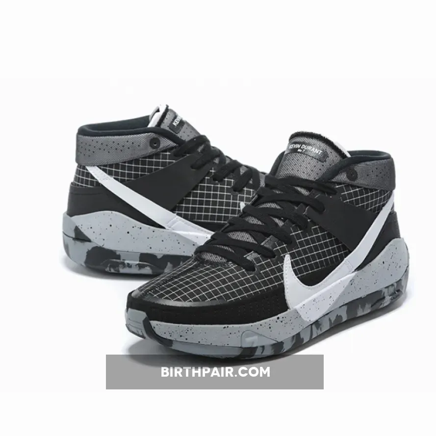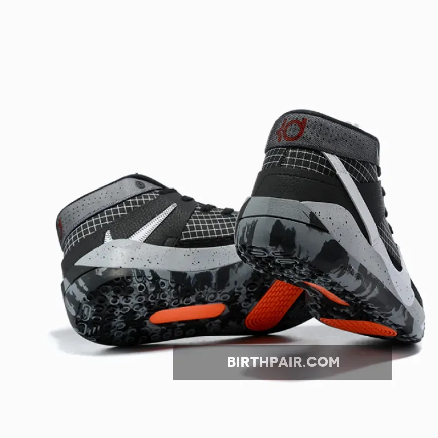 this Nike KD 13 features Black across the base while highlighted with a grid pattern. Following we have White on the leather Swoosh logos across the sides, Orange lands on the heel branding, insoles and outsole.