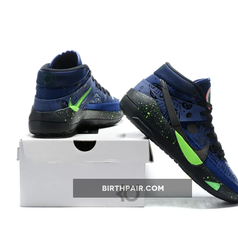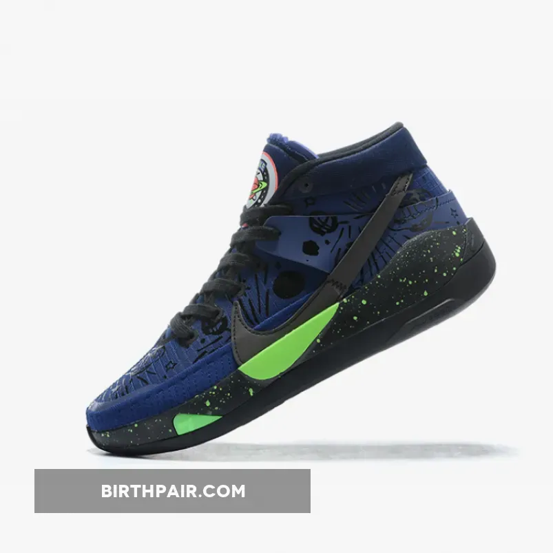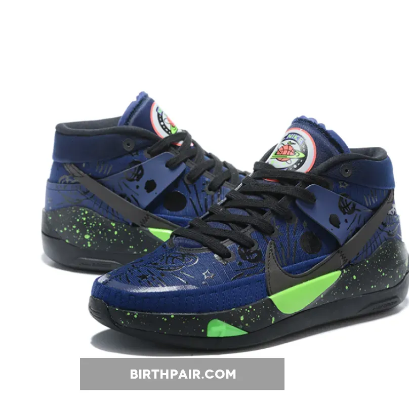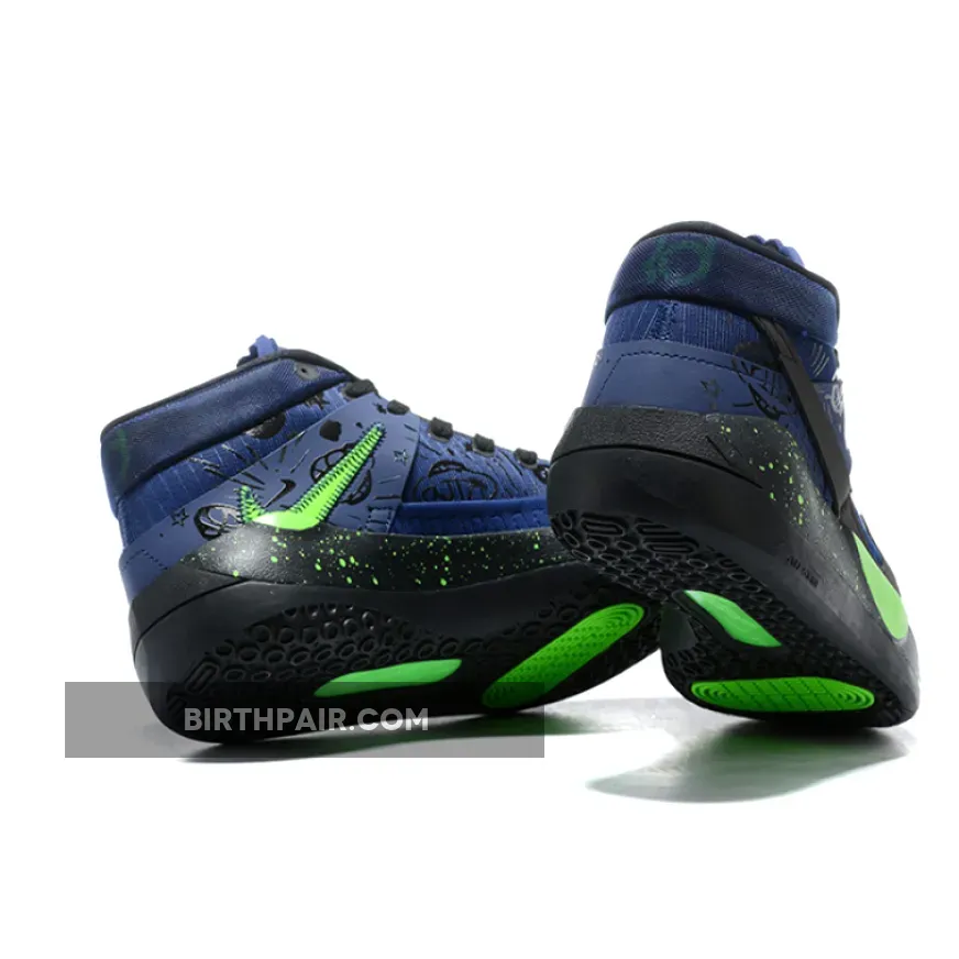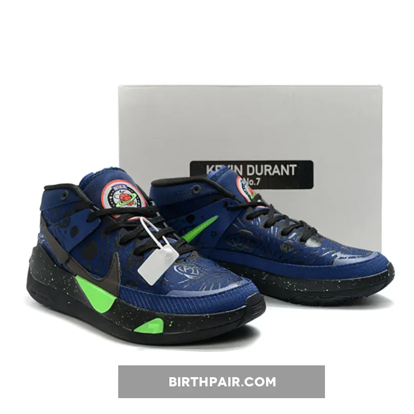 this pair features Blue throughout the upper while using an intergalactic theme. Following we have subtle graphics throughout which furthers the theme between space and basketball. Following we have Neon Green on part of the midsole, insoles and KD branding on the heel.