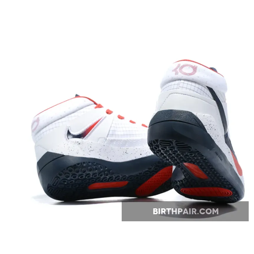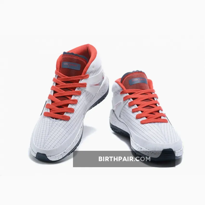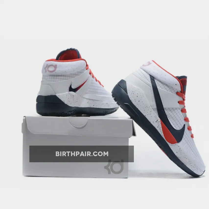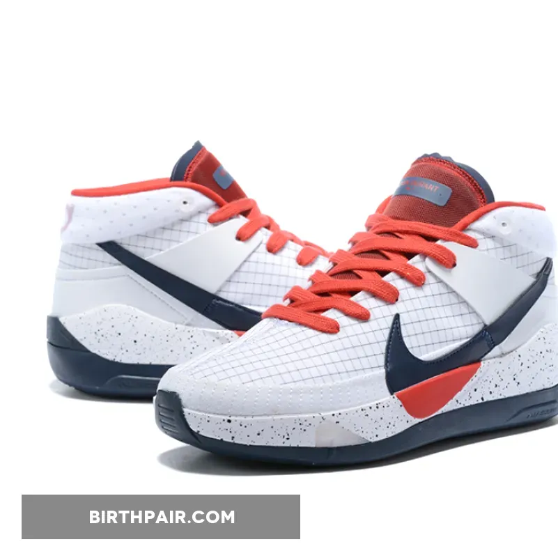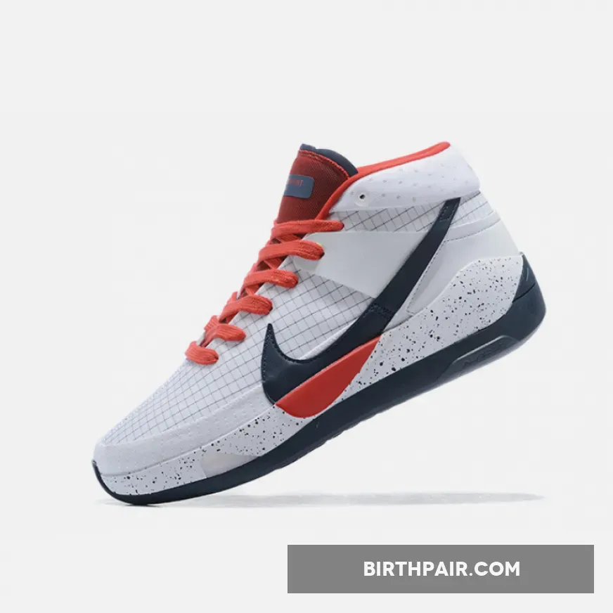 this Nike KD 13 comes with White across the upper along with a grid pattern. Following we have Red on the tongue, liner, laces, KD logo on the heel and outsole. In addition we have Navy leather on the lateral side with a gradient stitched Swoosh logon the medial.