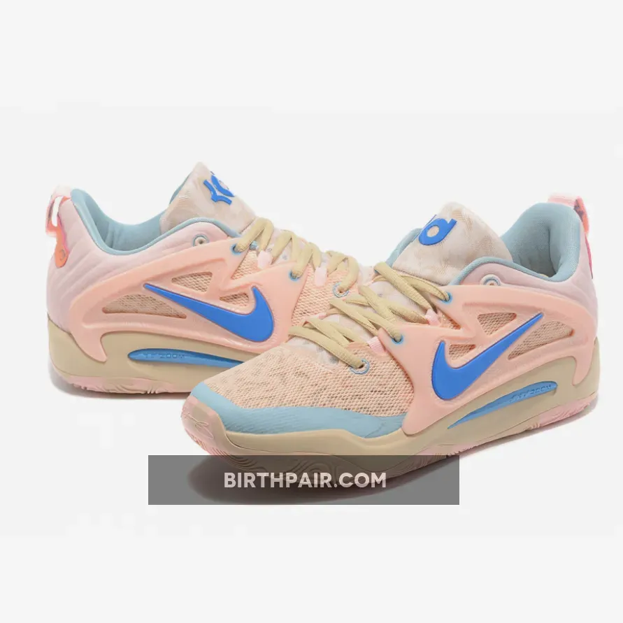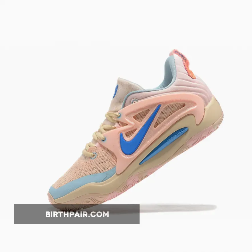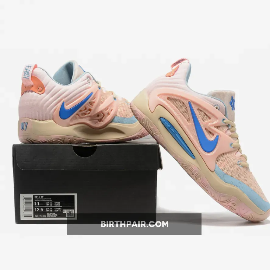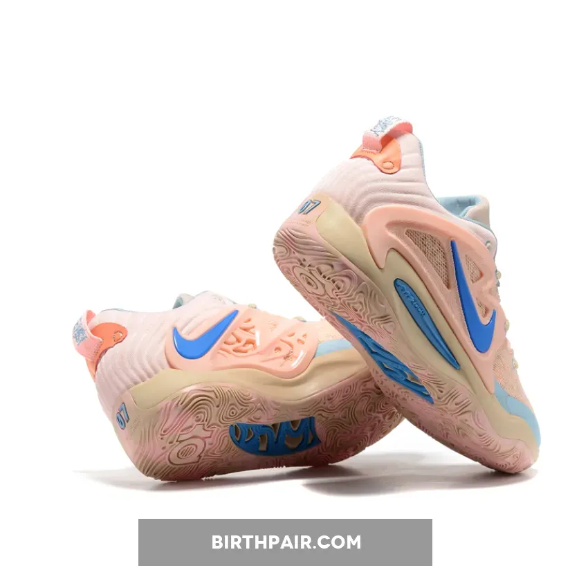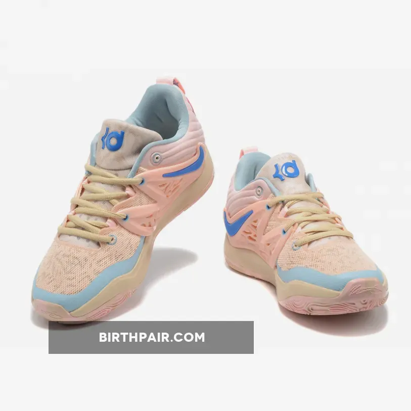 The pair comes contrasted in tan and light pink uppers with light blue and royal blue accents. Next, the heel has the 3d-printed tech for Kevin Durant and a marble look finish on the outsole, a pattern on the tongue, and engineered mesh to complete the look.