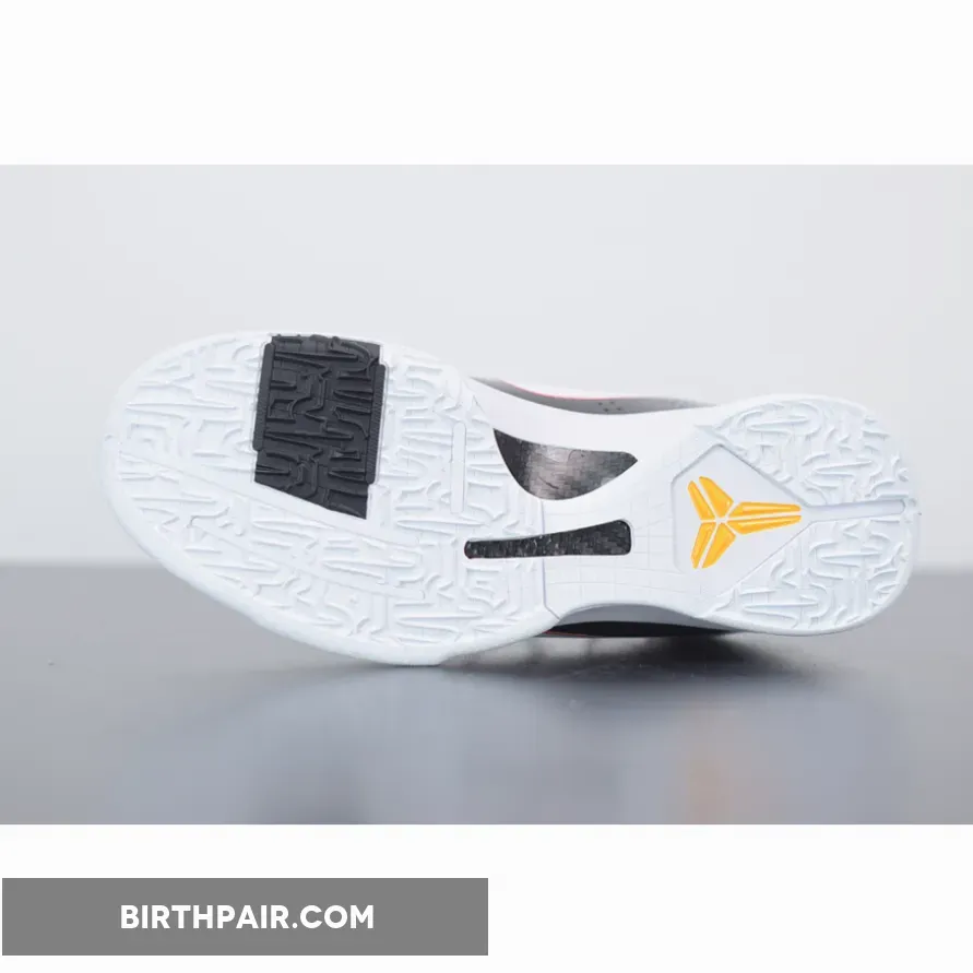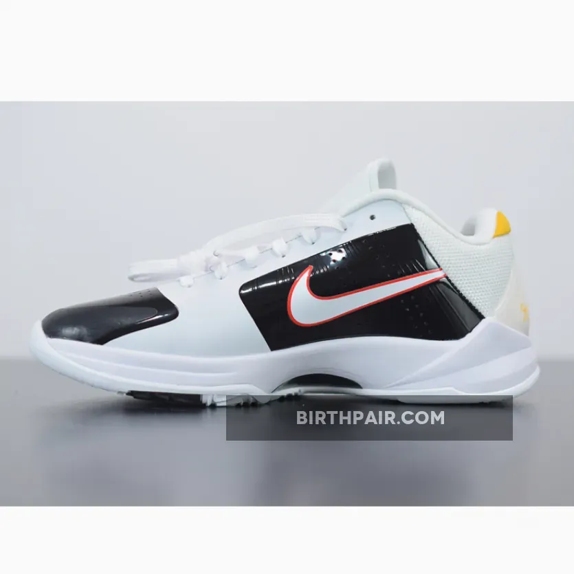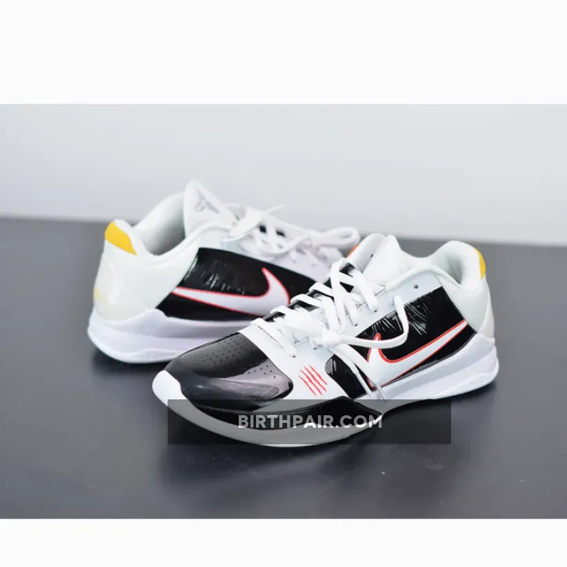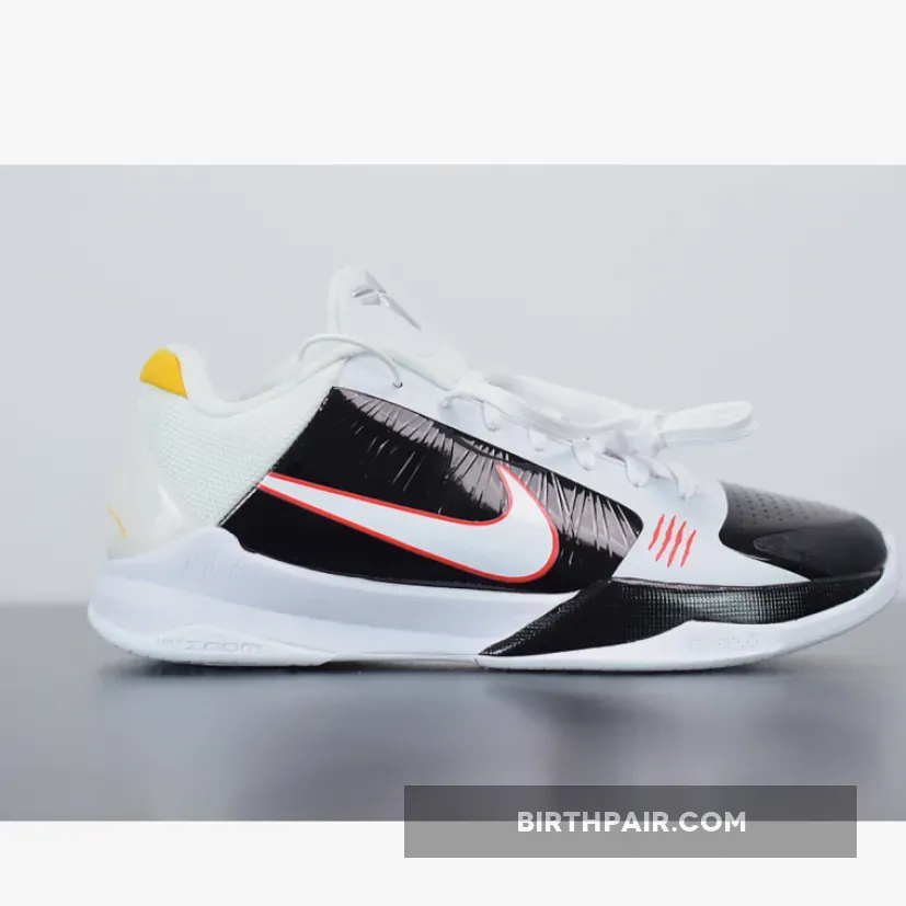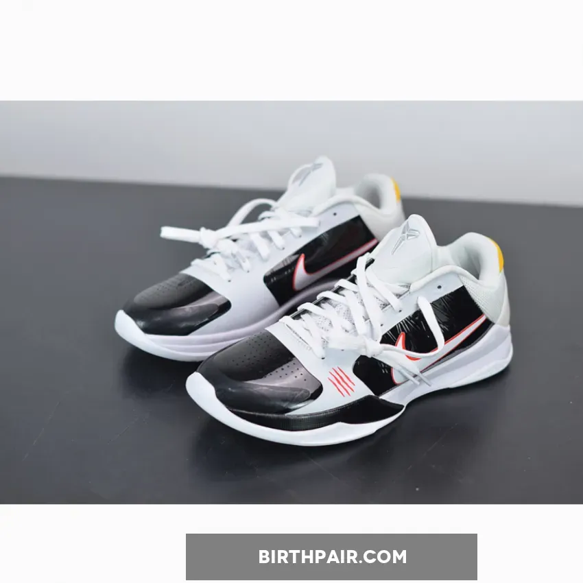 The Kobe V Protro Alternative Bruce Lee delivers a black and white take on the original. Black and white paneling comprise the upper while hits of red can be seen outlining the Swoosh and on the lateral side scratch marks, tributing Enter the Dragon. A white and black Zoom sole, yellow heel cushioning, and silver Kobe branding on the tongue completes this alternate design.