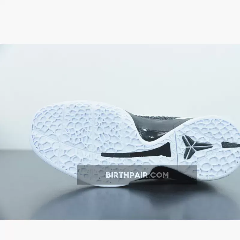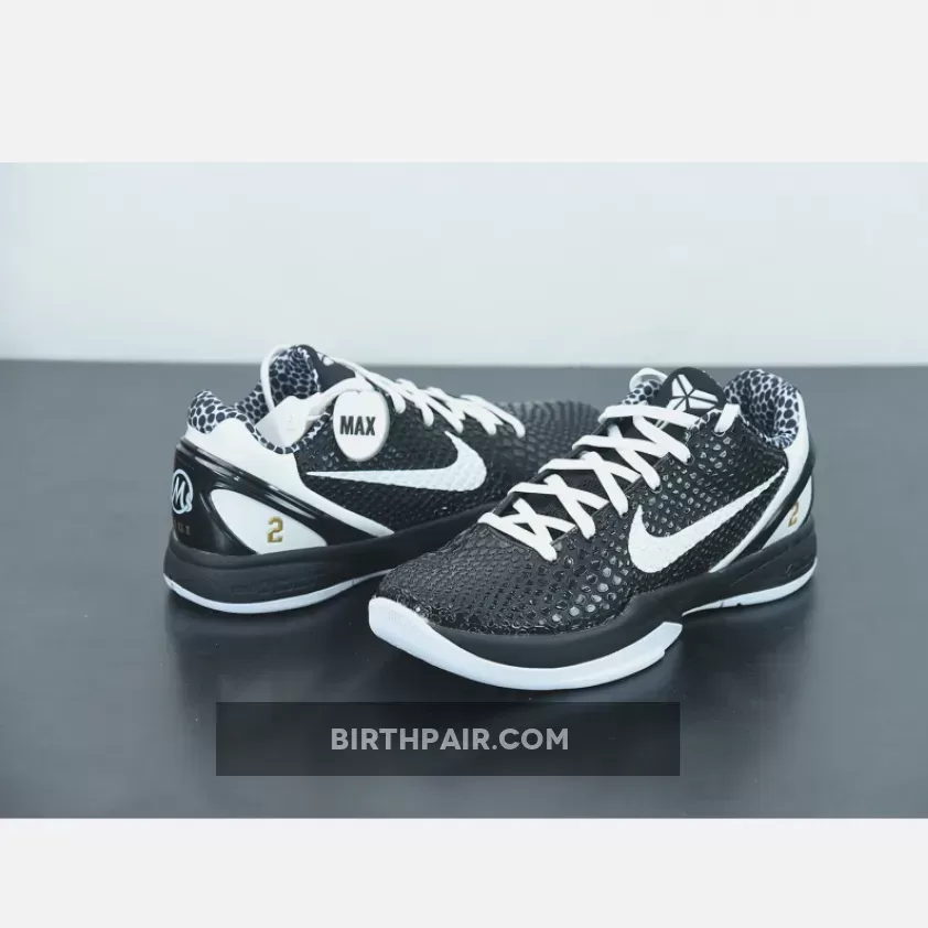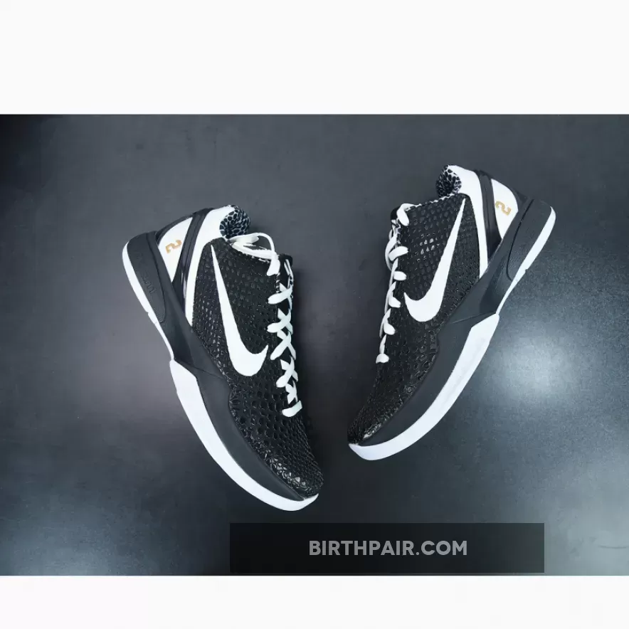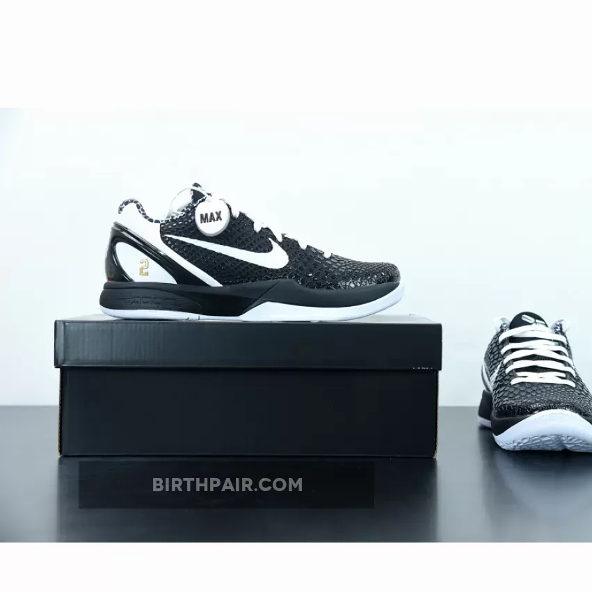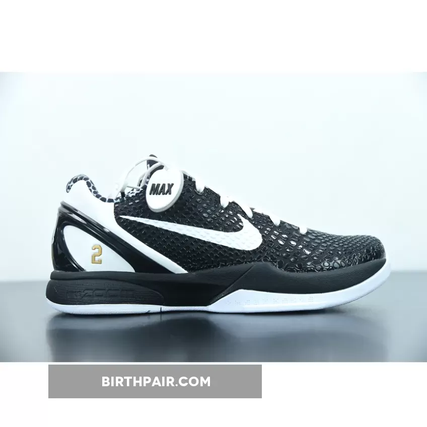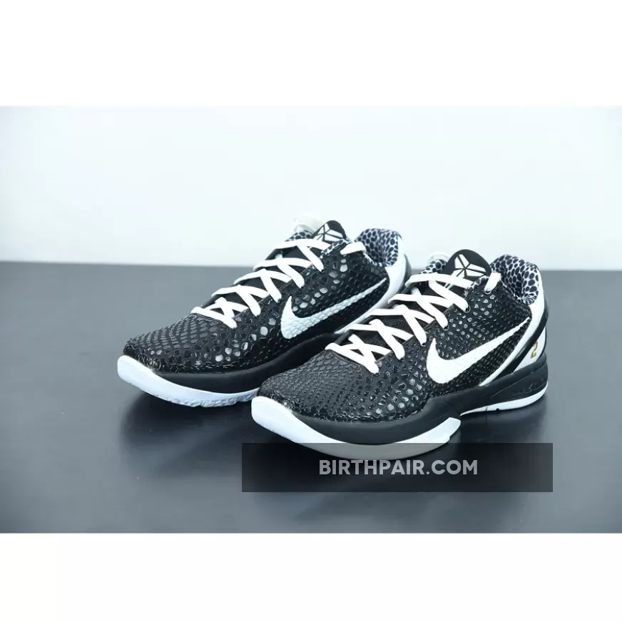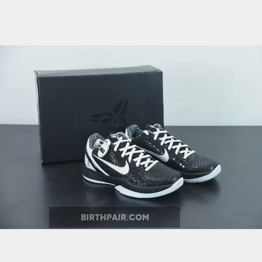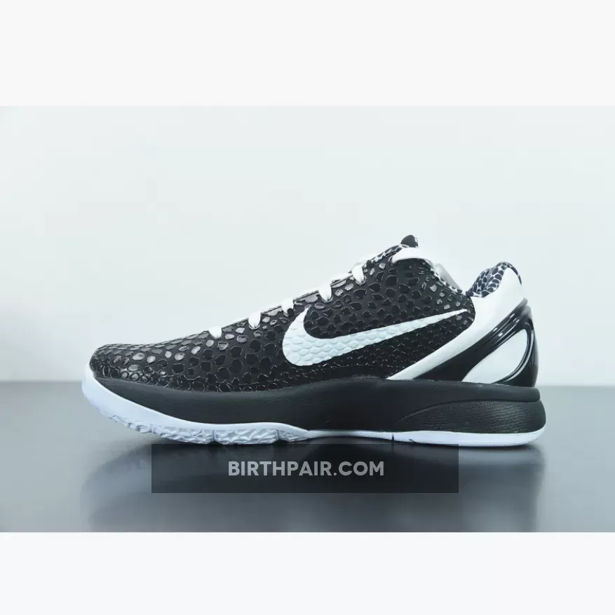 This offering of the Nike Kobe 6 Protro features a Black snakeskin textured upper with White laces, Swooshes, tongue branding, heels, and rubber outsole. The snakeskin print is also used on the inner lining.