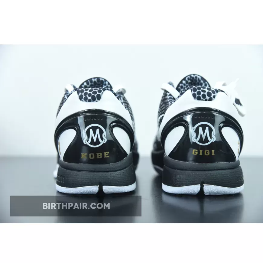 Inside the lateral windows, you’ll find a gilded #2 which represents Gigi’s uniform number for her AAU squad. The rear end’s heel molds swap out the traditional Kobe signature for the Mamba & Mambacita Sports Foundation insignia, and underneath arrives Kobe’s moniker on the left shoe while Gigi’s adorns the right side. Insoles are styled to further honor Gigi with “Mambacita” spell outs, angel wings, a halo and another #2 hit. A majority of the kicks come dressed up with stark black snake scales while notes of white touch down on the Swooshes, Mamba tongue logos and leather back panels.