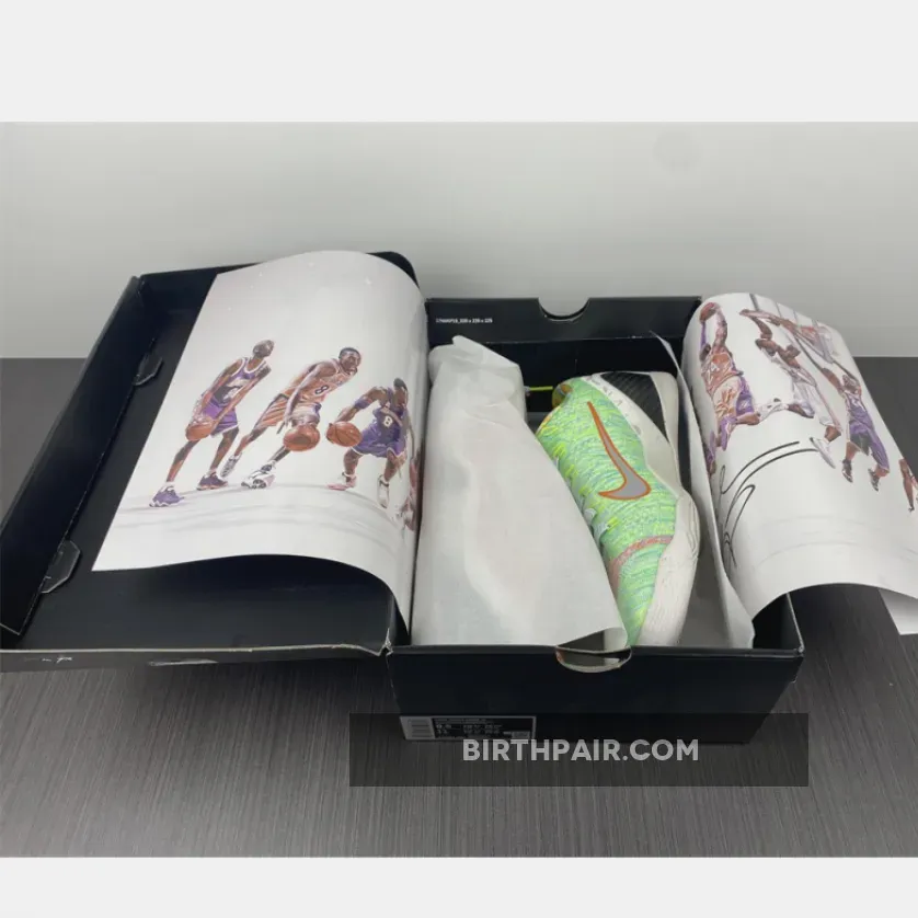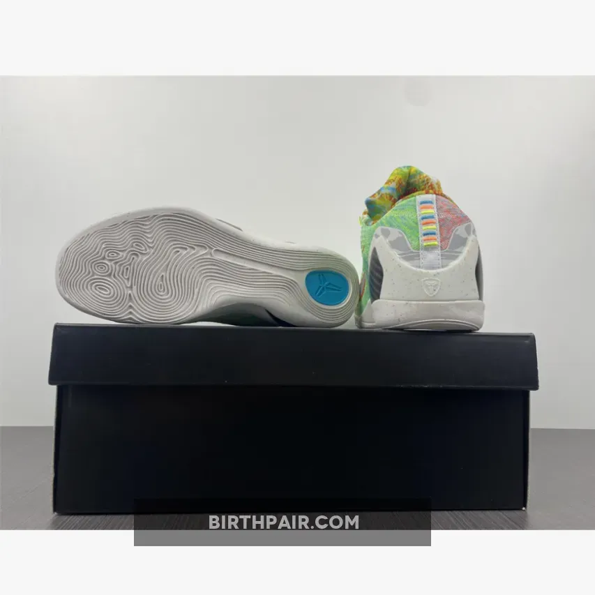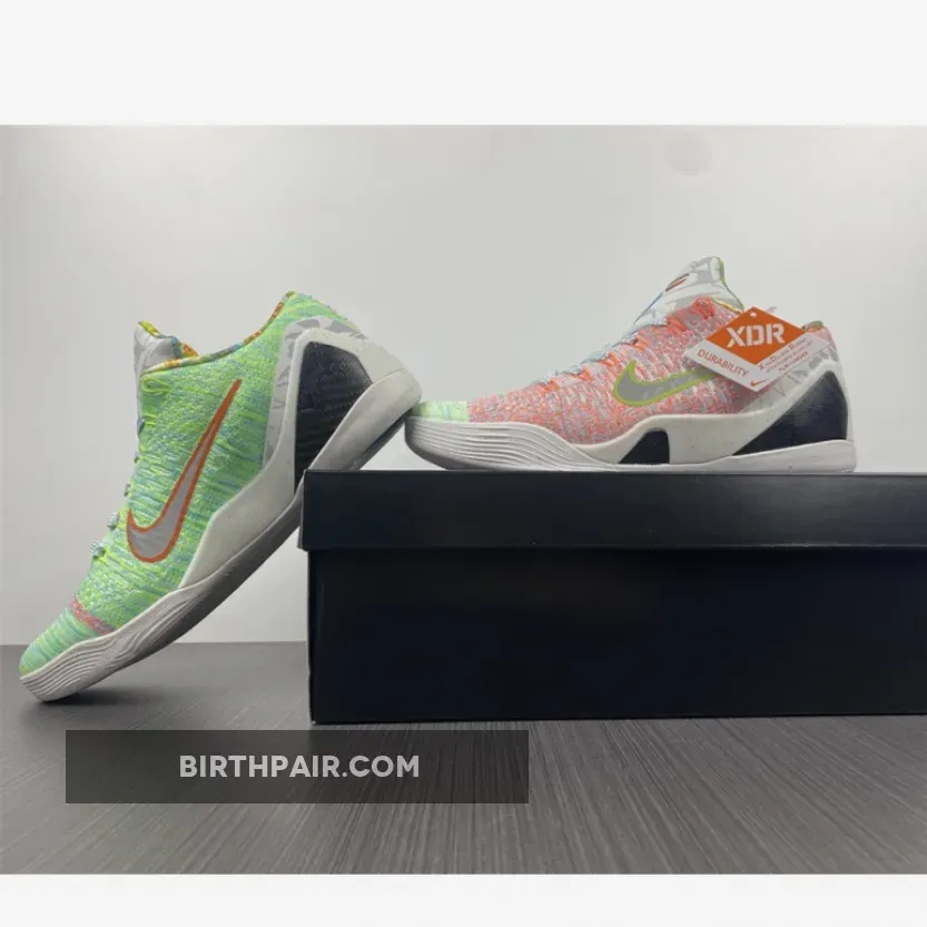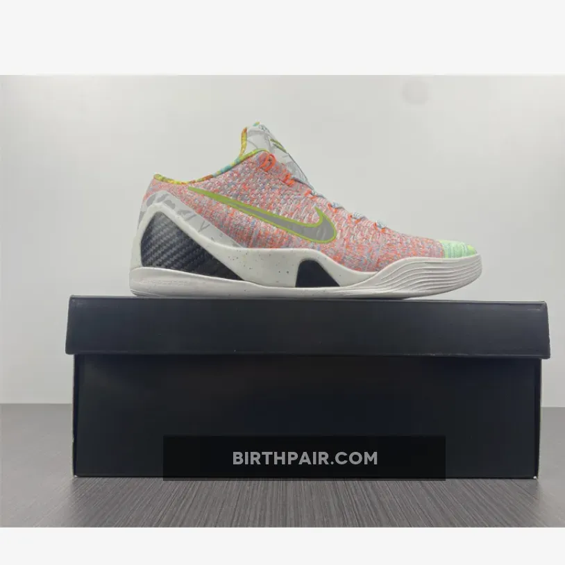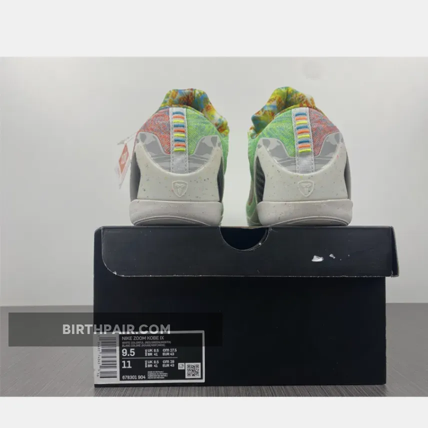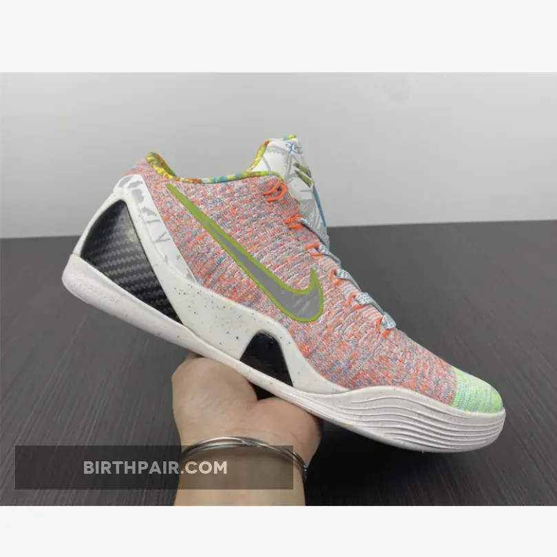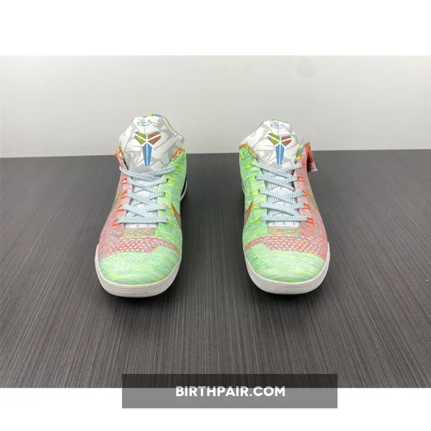 This Nike Kobe 9 features a mixture of Multicolor, Chlorine Blue and Black color scheme. The shoes features a White base with bright/vibrant colors used throughout the Flyknit upper. The biggest detail to the shoe is the graphic design hitting the Kobe logos, ankle, heel and inner lining – that represent previous Kobe 9 colorways.