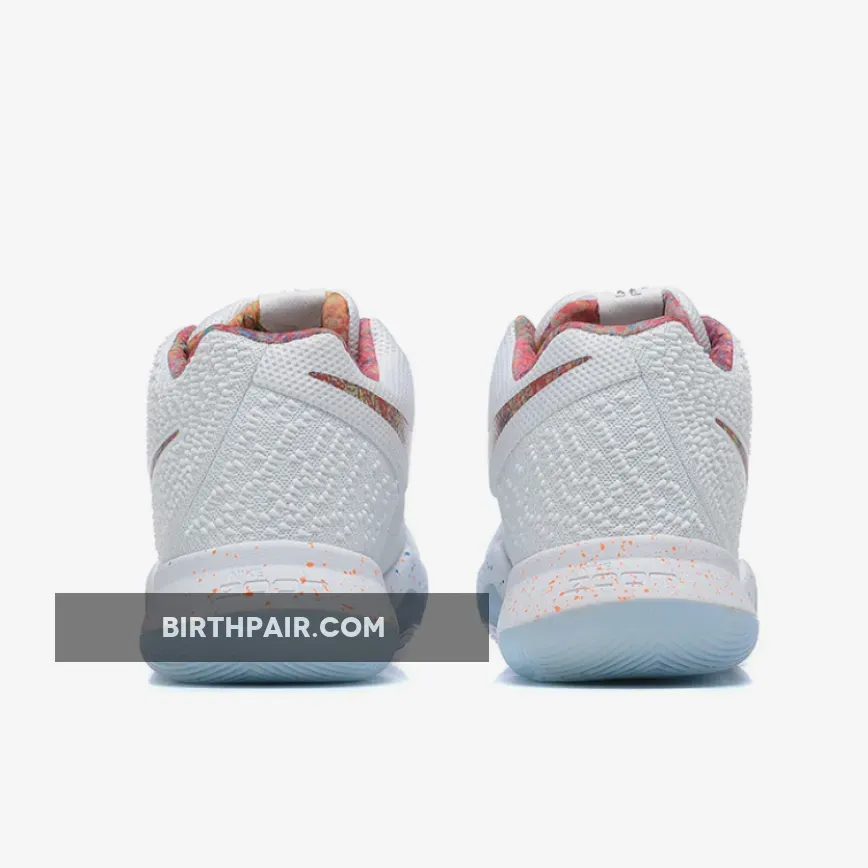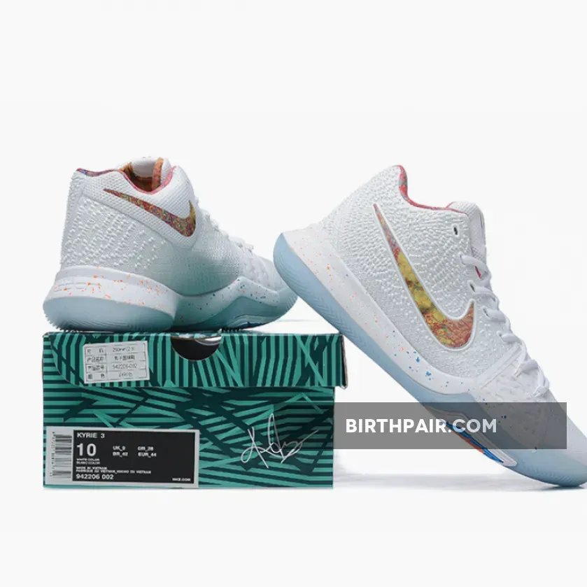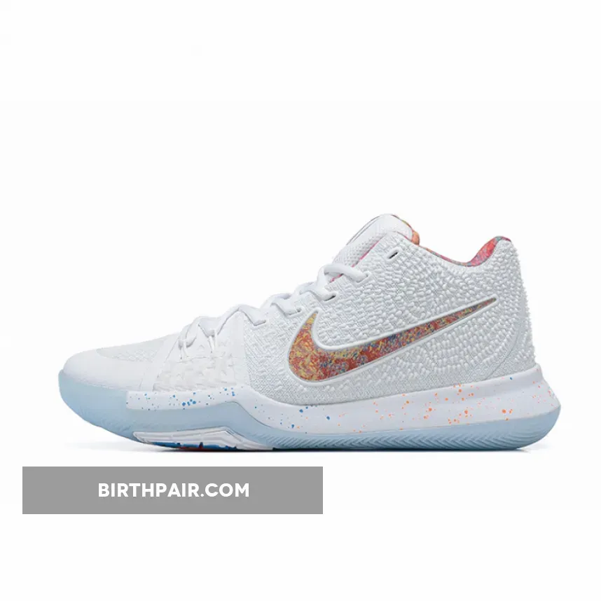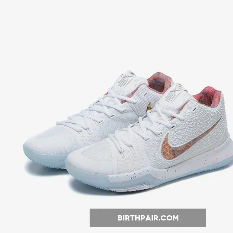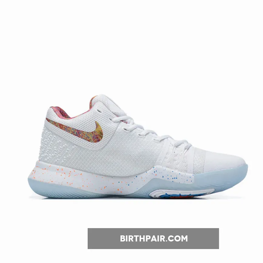 The Nike Kyrie 3 EYBL comes in a White base upper contrasted by a multi-colored print/design placed on the lining, Nike Swoosh and the speckling on the midsole. Other details include a speckled midsole, EYBL branded insoles and translucent outsole.