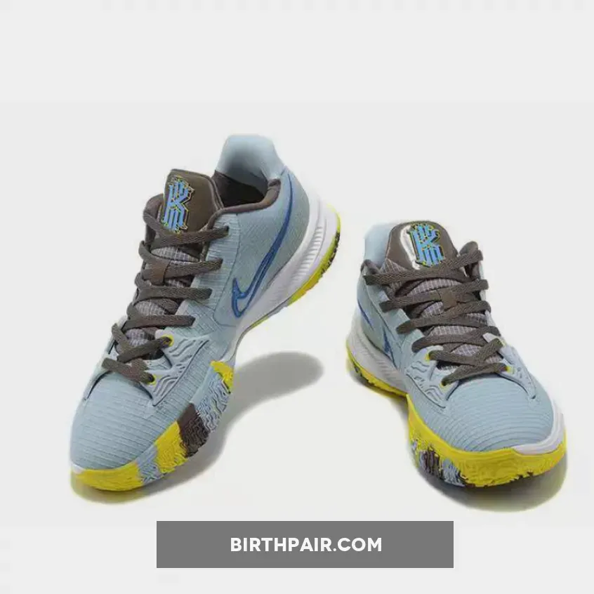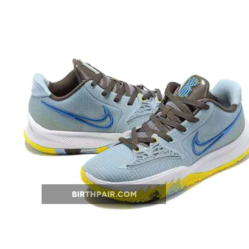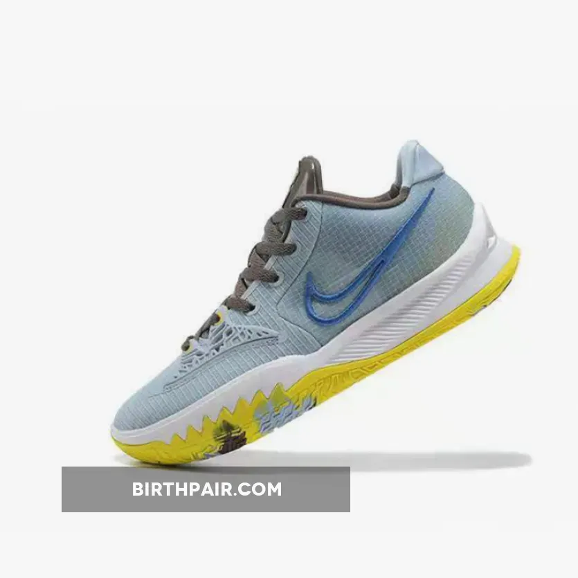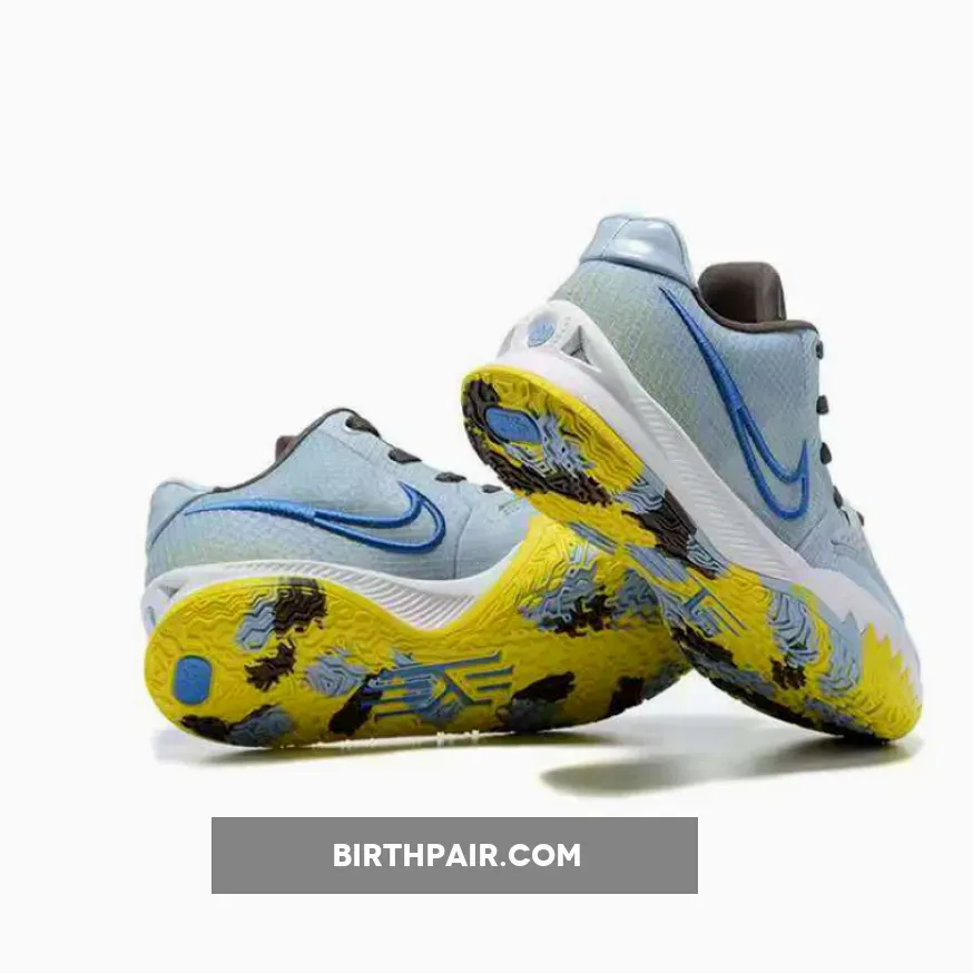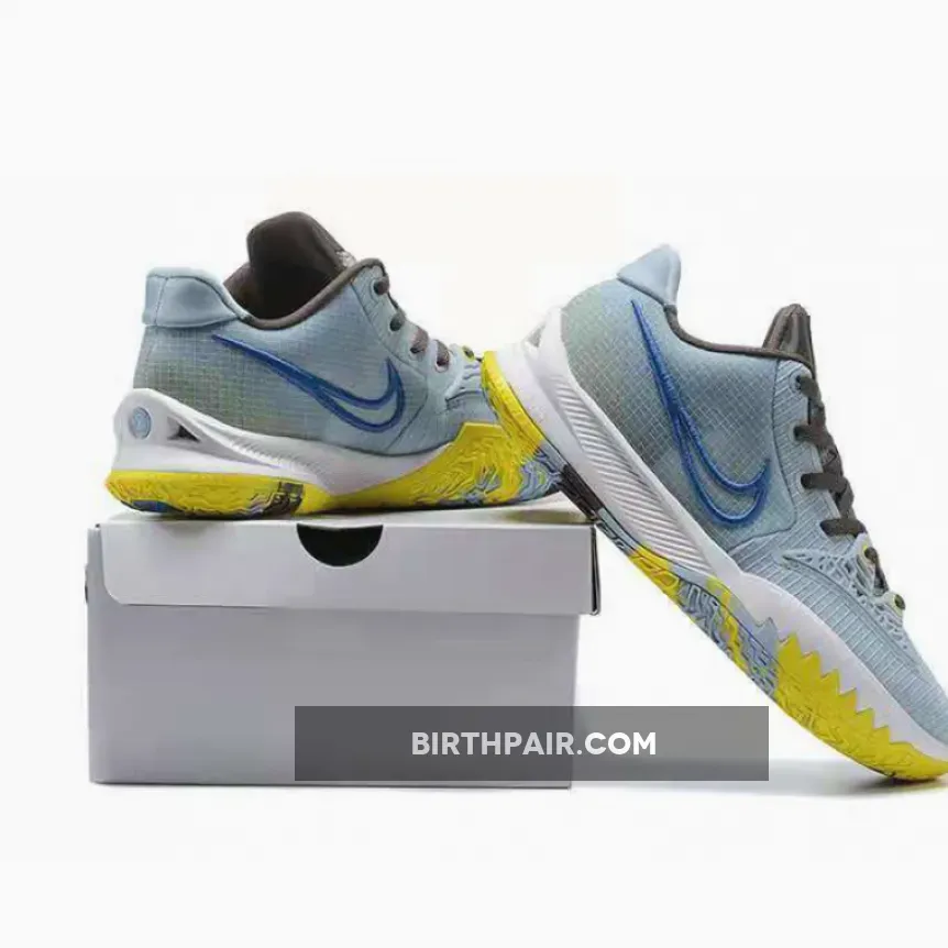 this Nike Kyrie Low 4 comes dressed in a Light Armory Blue, Black, and Signal Blue color combination. Utilizing various materials and an outlined Swoosh on the panels while Yellow, Brown, and Blue form for marble or camouflage look on the outsole.