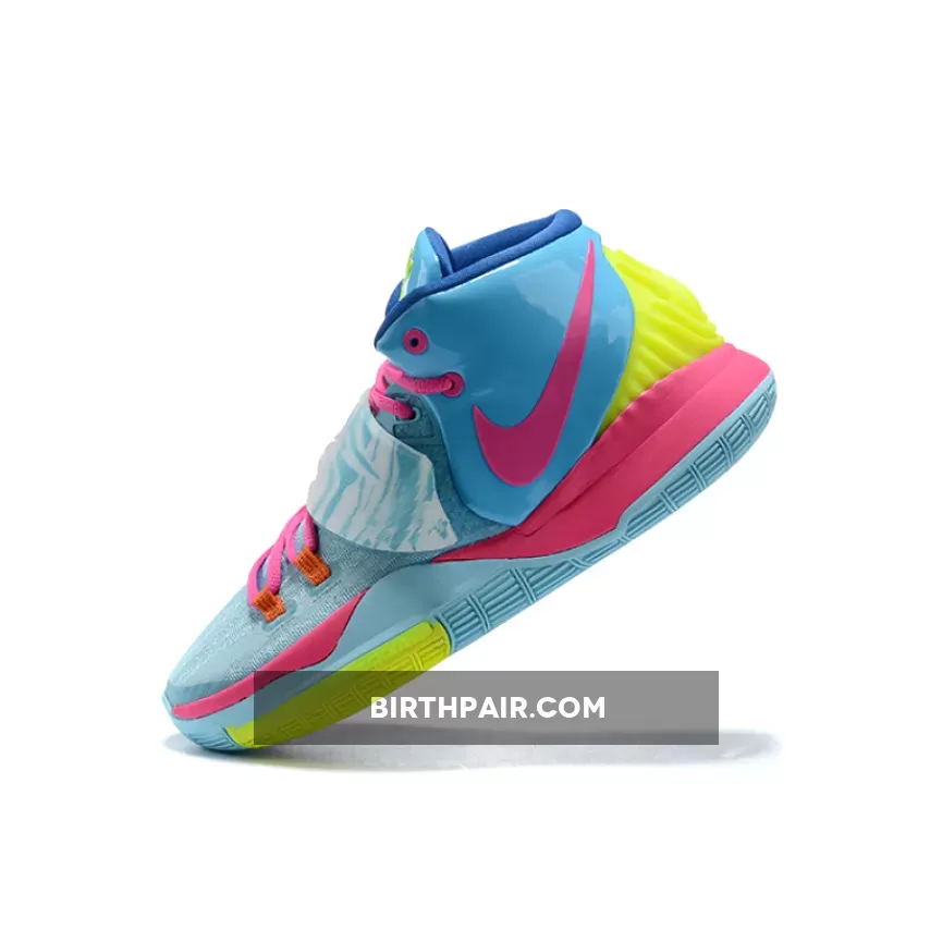 With a colorful array of Pride Month creations already on the way, the brand is channeling their inner child as they turn the Kyrie 6 into the pure incarnate of a relaxing pool day. Along some water-esque straps and a full display of aqua blue tones rests swooshes, laces, and midsole accents of a loud hot pink; volt green accents adjacent at both the forefoot as well as the sculpted heel counter, while bits of orange dress the frontward eye stays in a bit of orange.