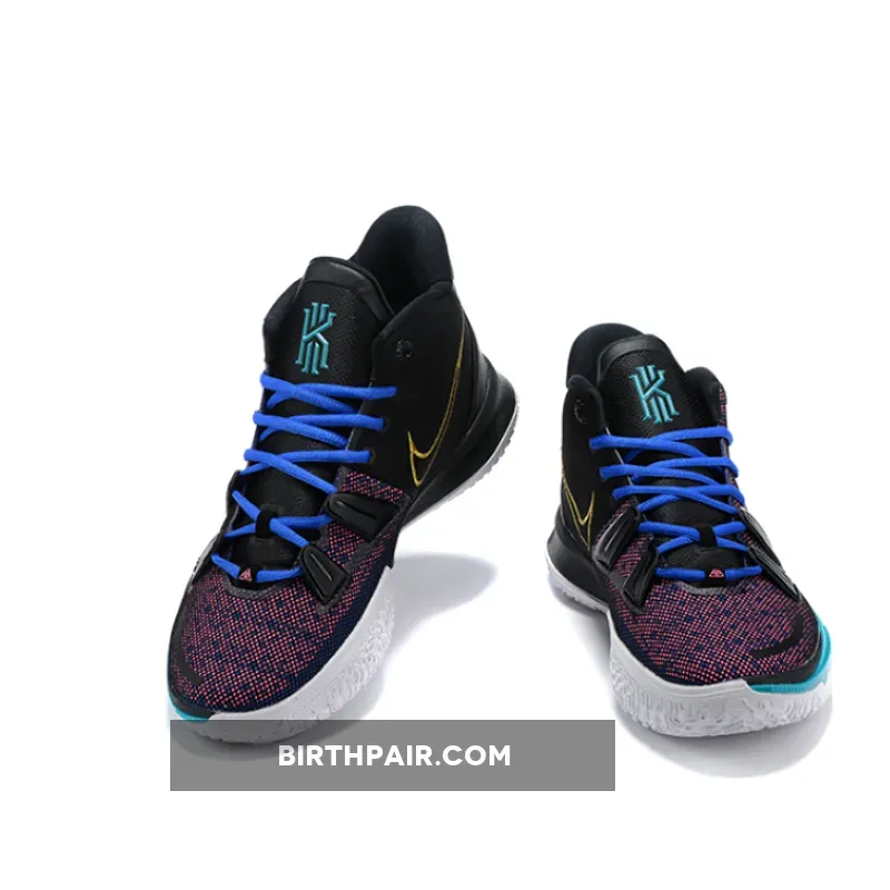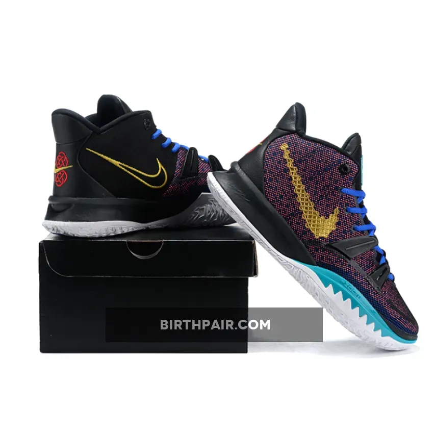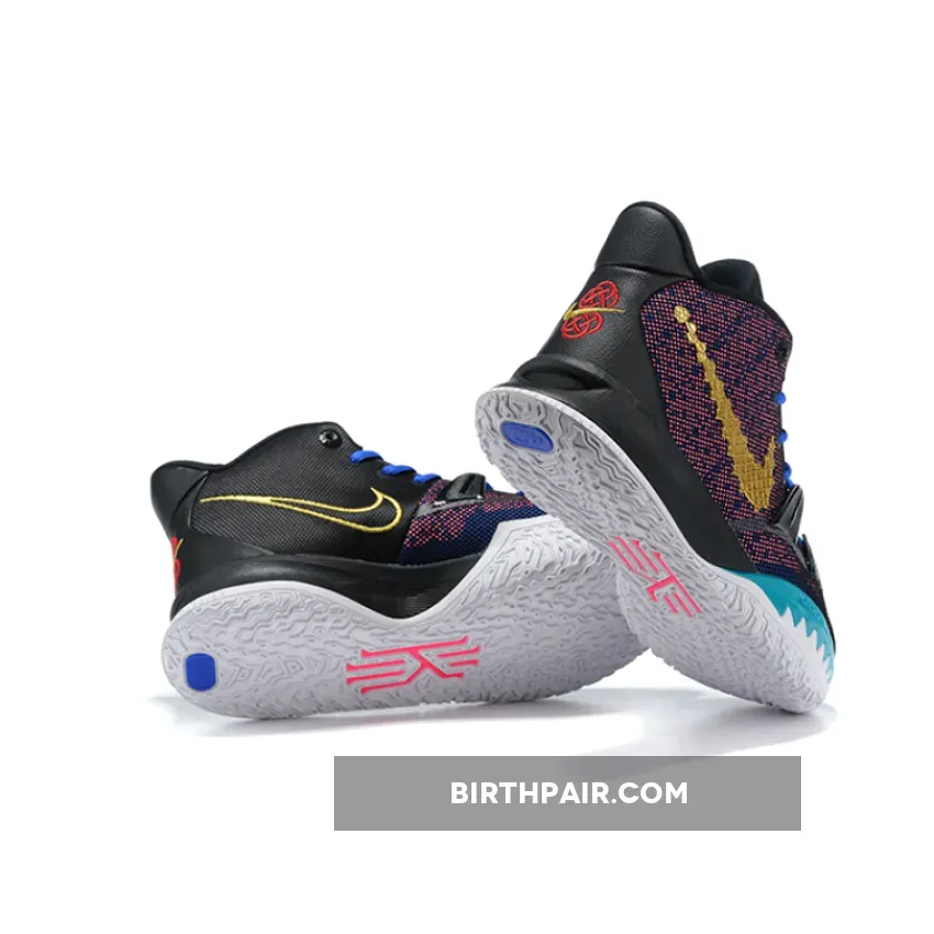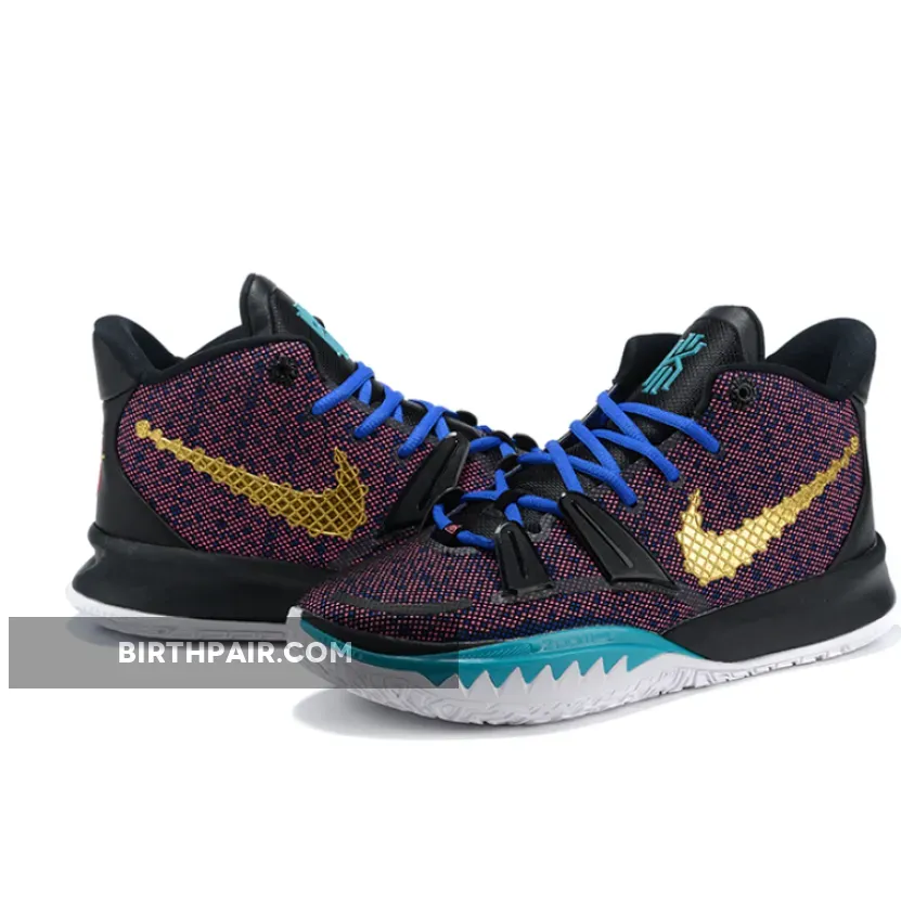 This offering of the Nike Kyrie 7 features a Pink printed upper paired with Blue laces and Teal tongue branding and lateral forefoot overlays on the White midsole. Highlighting the shoe is a Gold sculpted ornate-like Swoosh logo on the lateral with embroidery branding appearing on the heels.