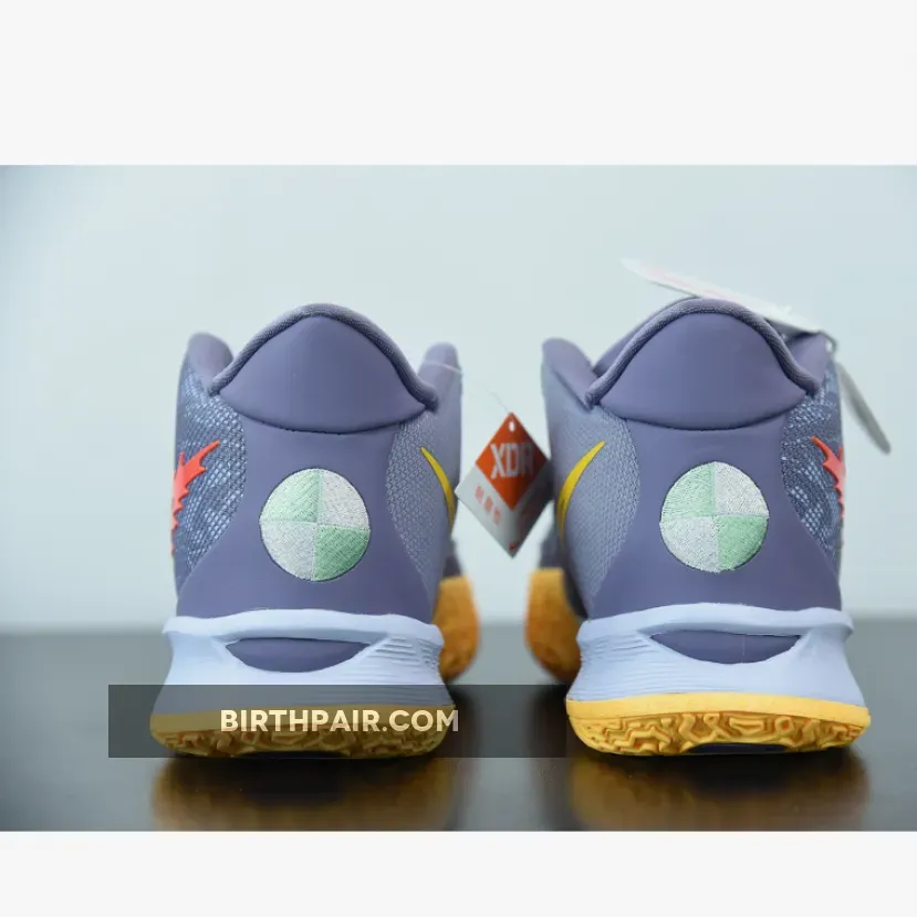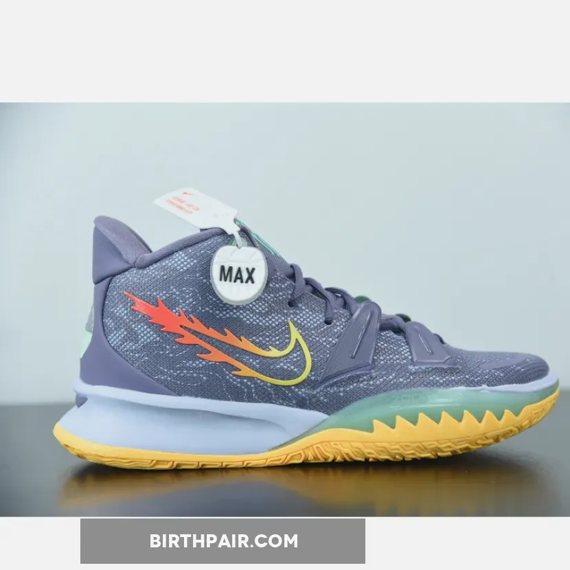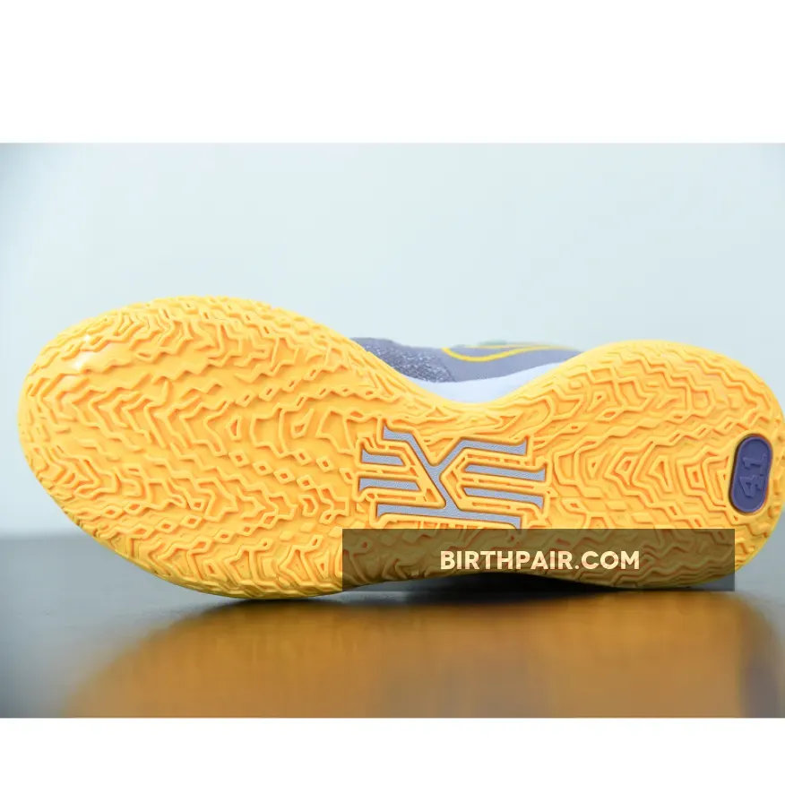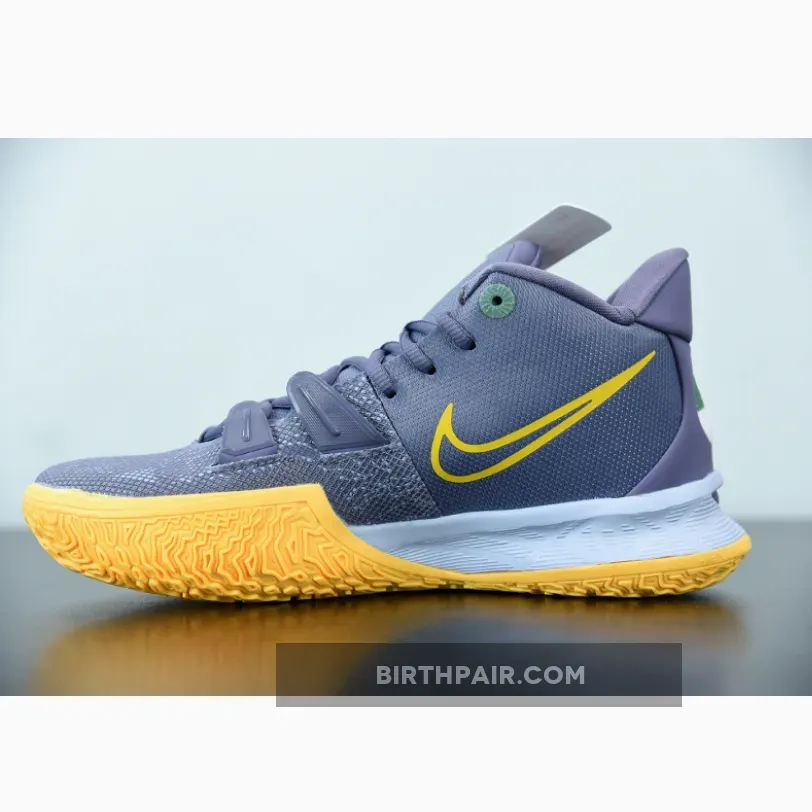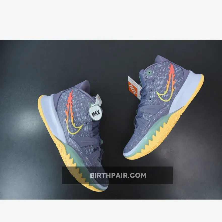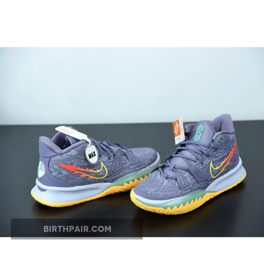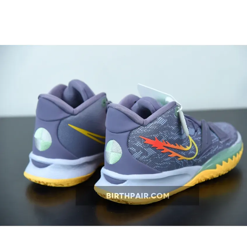 Dressed in a Daybreak, Citron Pulse, Siren Red, and Ghost color scheme. This Nike Kyrie 7 features a Grey-based upper with a Yellow outlined Swoosh on the medial and a gradient flaming Swoosh on the lateral.