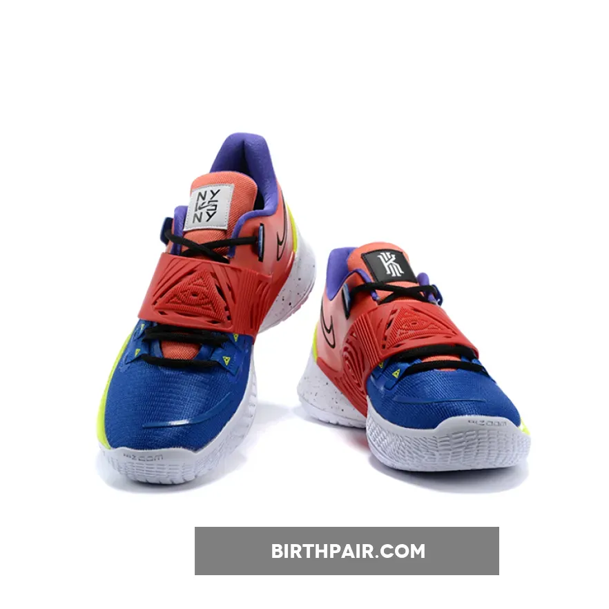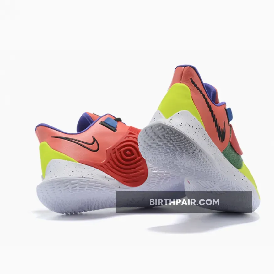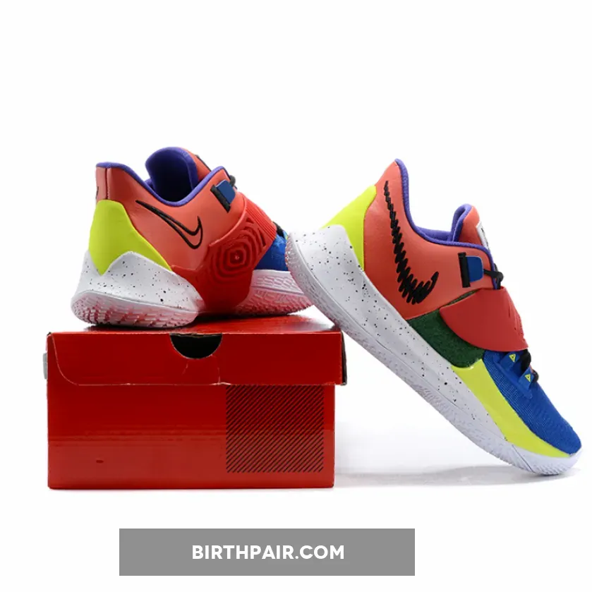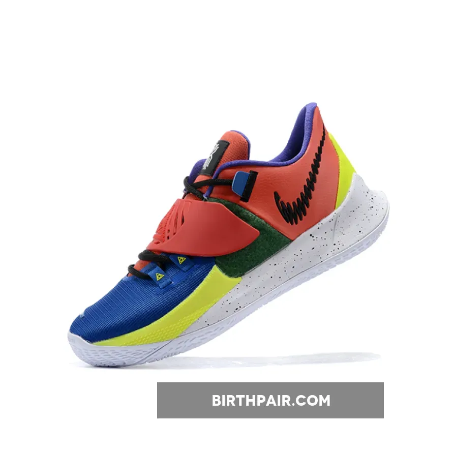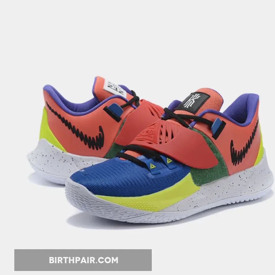 This offering of the Nike Kyrie Low 3 features a Multi-Color color blocking with a scribbled Swoosh logo on the lateral heel.